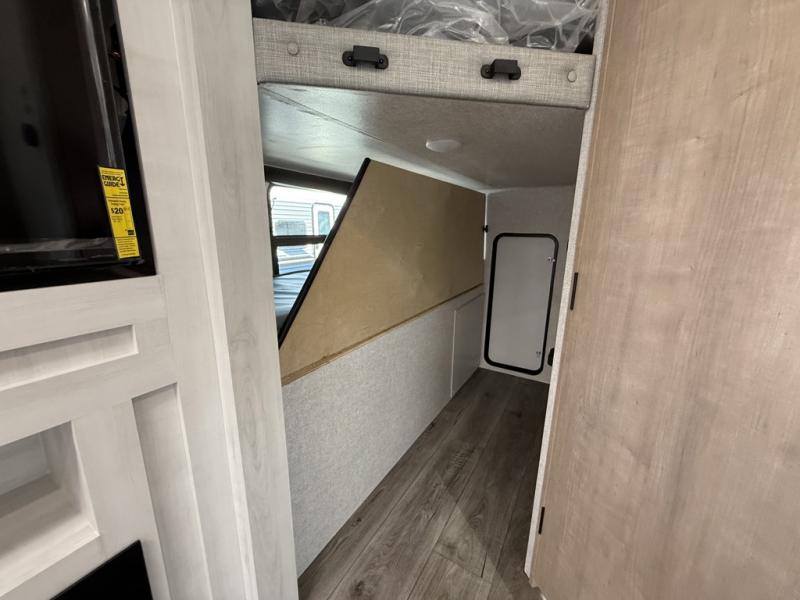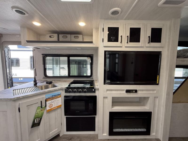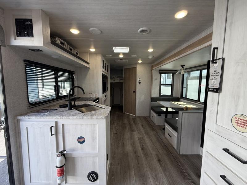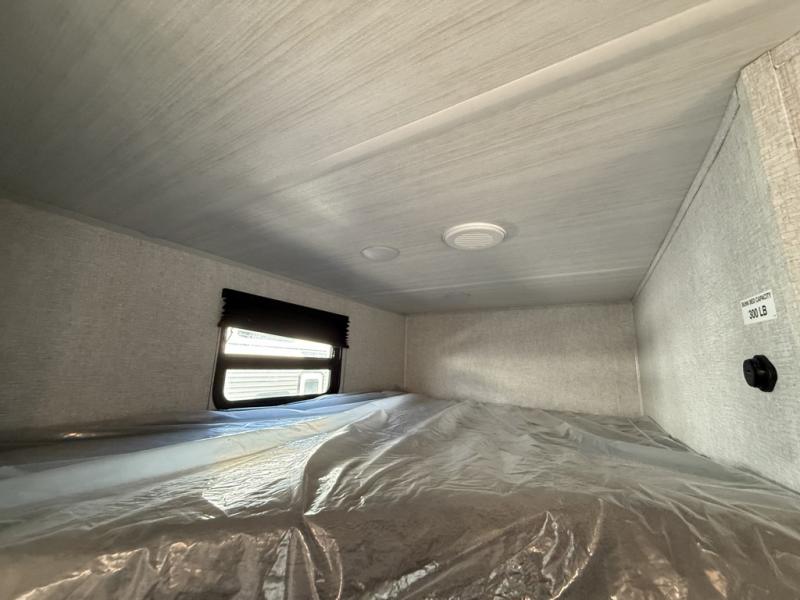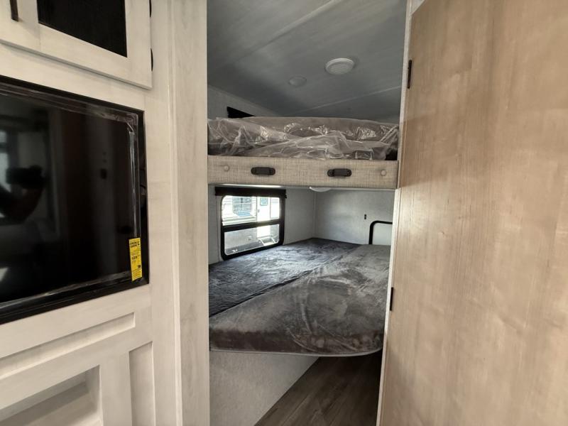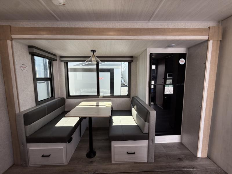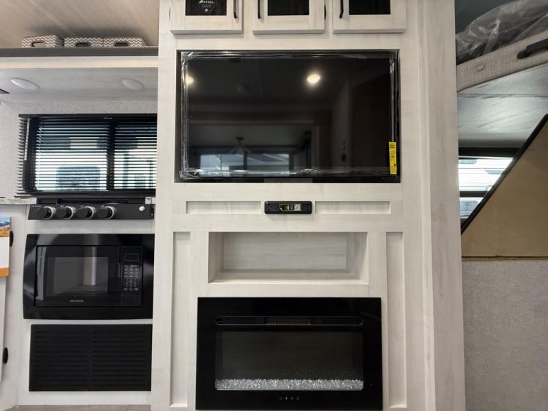 The whole family will have a fun time camping in this travel trailer! The kiddos or guests can sleep on the rear corner double over double bunk beds with optional bike storage, and you can sleep on the queen bed located in the front private bedroom. Everyone can rinse the sand out of their hair in the rear corner bathroom with the ABS tub surround. The hidden pantry behind the fireplace is a great place to store everyone's favorite snacks for movie night. With a countertop extension and air fryer microwave, the chef will have an easy time preparing delicious home cooked meals that can be enjoyed at the booth dinette slide. The dinette also has storage underneath it, and is next to the 10.7 cu. ft. residential inspired refrigerator. There is plenty of exterior storage and even an outside shower with hot and cold water!