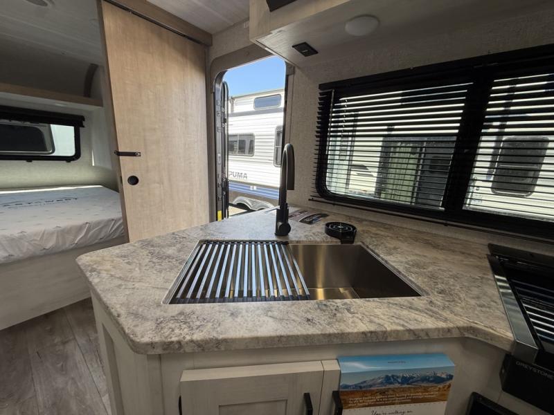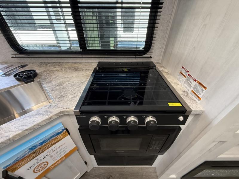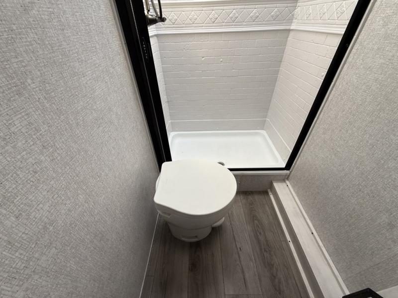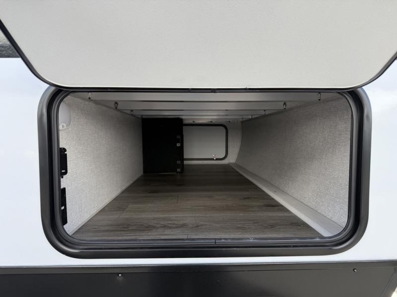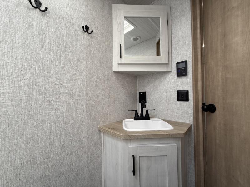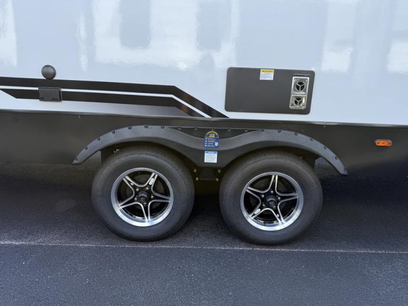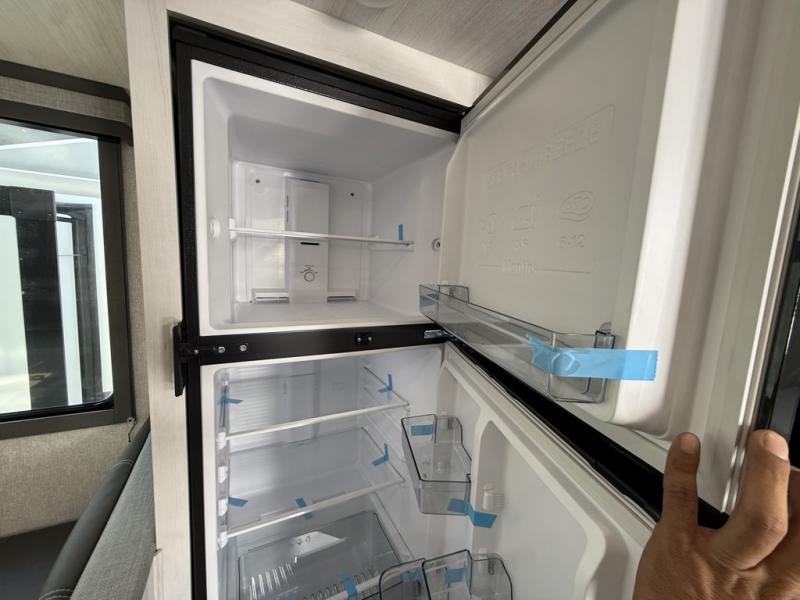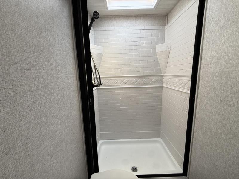 The whole family will have a fun time camping in this travel trailer! The kiddos or guests can sleep on the rear corner double over double bunk beds with optional bike storage, and you can sleep on the queen bed located in the front private bedroom. Everyone can rinse the sand out of their hair in the rear corner bathroom with the ABS tub surround. The hidden pantry behind the fireplace is a great place to store everyone's favorite snacks for movie night. With a countertop extension and air fryer microwave, the chef will have an easy time preparing delicious home cooked meals that can be enjoyed at the booth dinette slide. The dinette also has storage underneath it, and is next to the 10.7 cu. ft. residential inspired refrigerator. There is plenty of exterior storage and even an outside shower with hot and cold water!