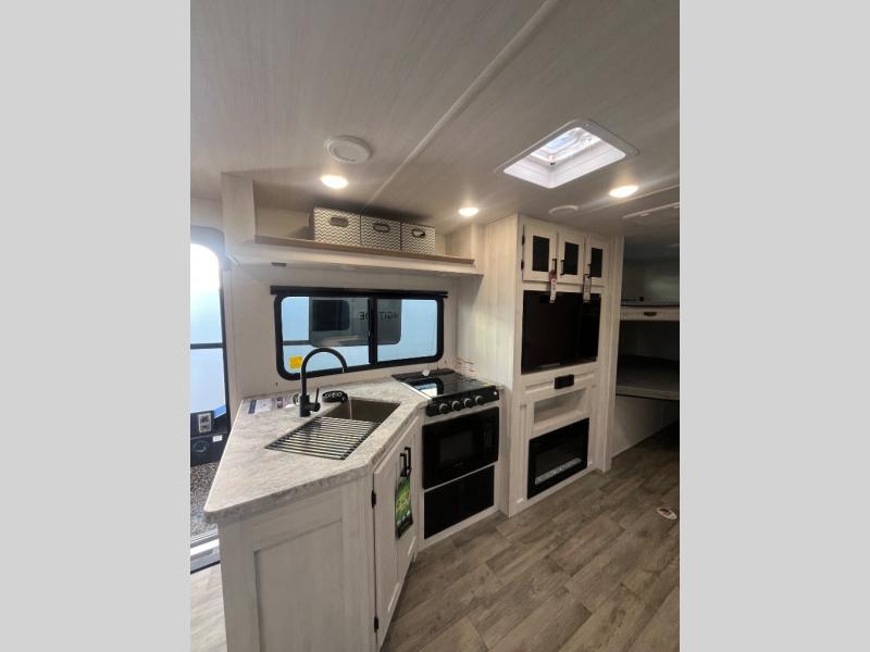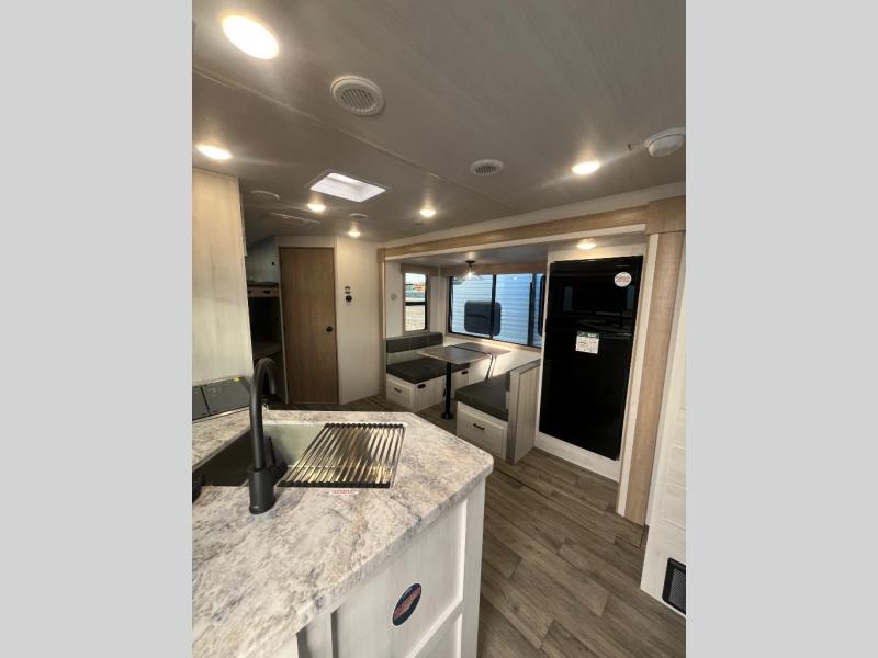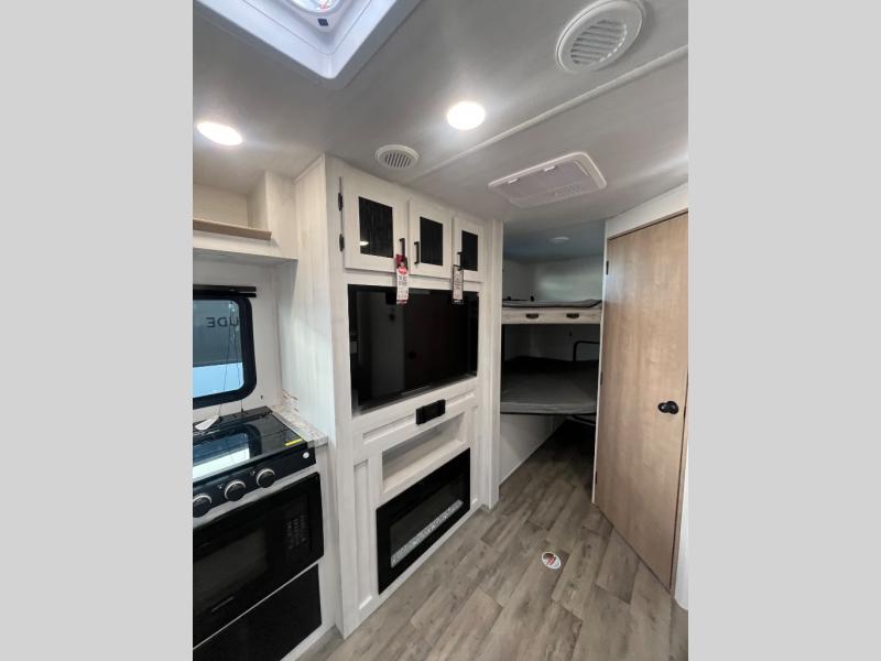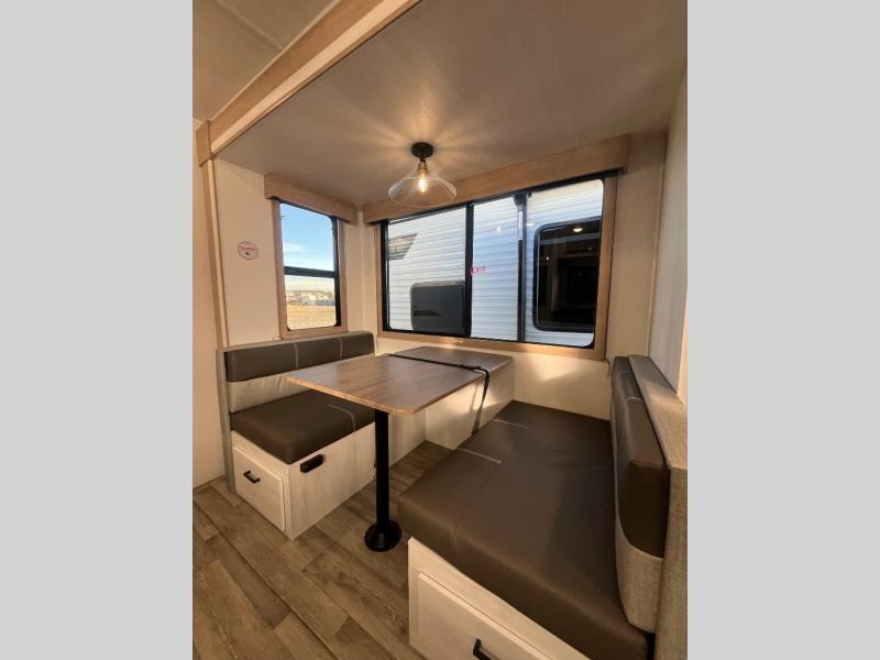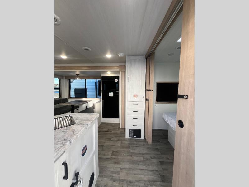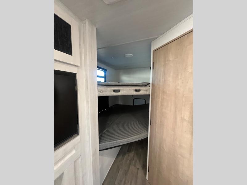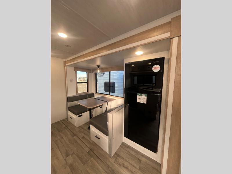 The whole family will have a fun time camping in this travel trailer! The kiddos or guests can sleep on the rear corner double over double bunk beds with optional bike storage, and you can sleep on the queen bed located in the front private bedroom. Everyone can rinse the sand out of their hair in the rear corner bathroom with the ABS tub surround. The hidden pantry behind the fireplace is a great place to store everyone's favorite snacks for movie night. With a countertop extension and air fryer microwave, the chef will have an easy time preparing delicious home cooked meals that can be enjoyed at the booth dinette slide. The dinette also has storage underneath it, and is next to the 10.7 cu. ft. residential inspired refrigerator. There is plenty of exterior storage and even an outside shower with hot and cold water!