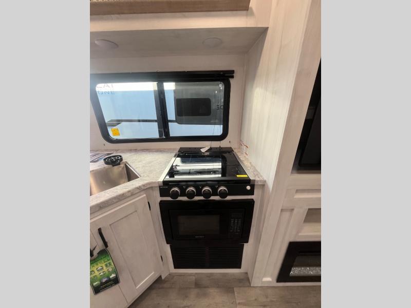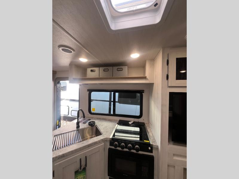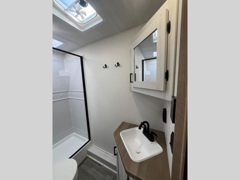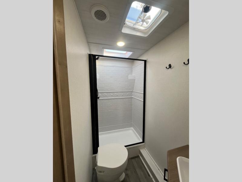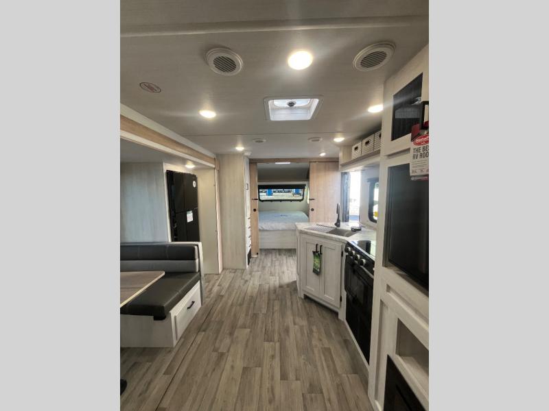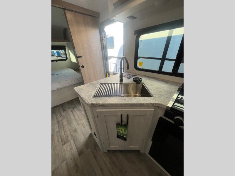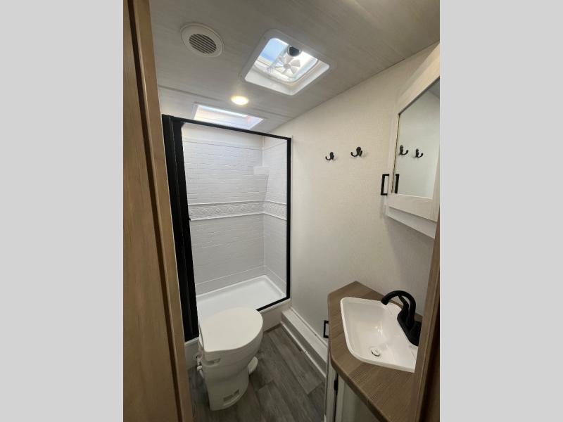 The whole family will have a fun time camping in this travel trailer! The kiddos or guests can sleep on the rear corner double over double bunk beds with optional bike storage, and you can sleep on the queen bed located in the front private bedroom. Everyone can rinse the sand out of their hair in the rear corner bathroom with the ABS tub surround. The hidden pantry behind the fireplace is a great place to store everyone's favorite snacks for movie night. With a countertop extension and air fryer microwave, the chef will have an easy time preparing delicious home cooked meals that can be enjoyed at the booth dinette slide. The dinette also has storage underneath it, and is next to the 10.7 cu. ft. residential inspired refrigerator. There is plenty of exterior storage and even an outside shower with hot and cold water!