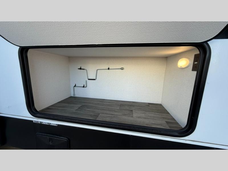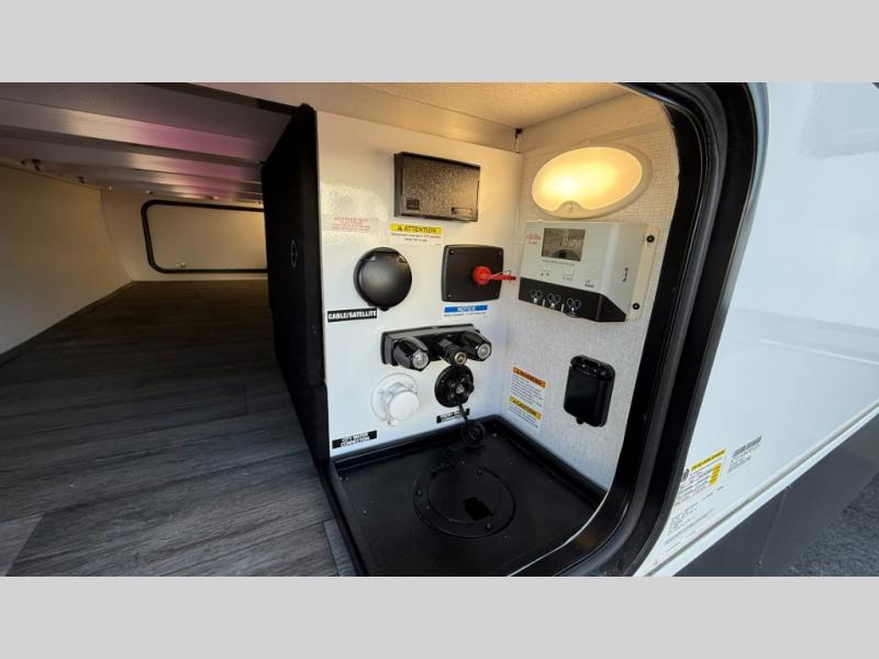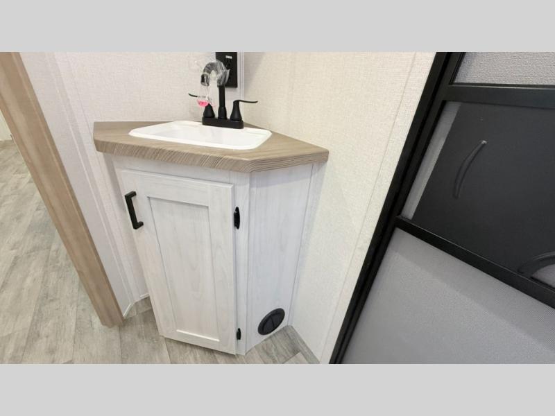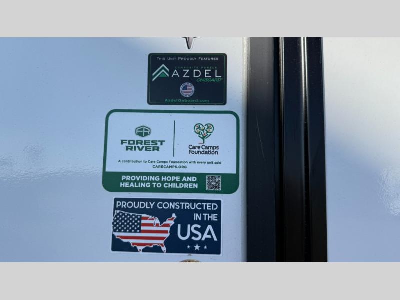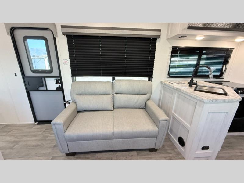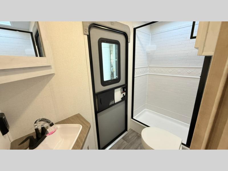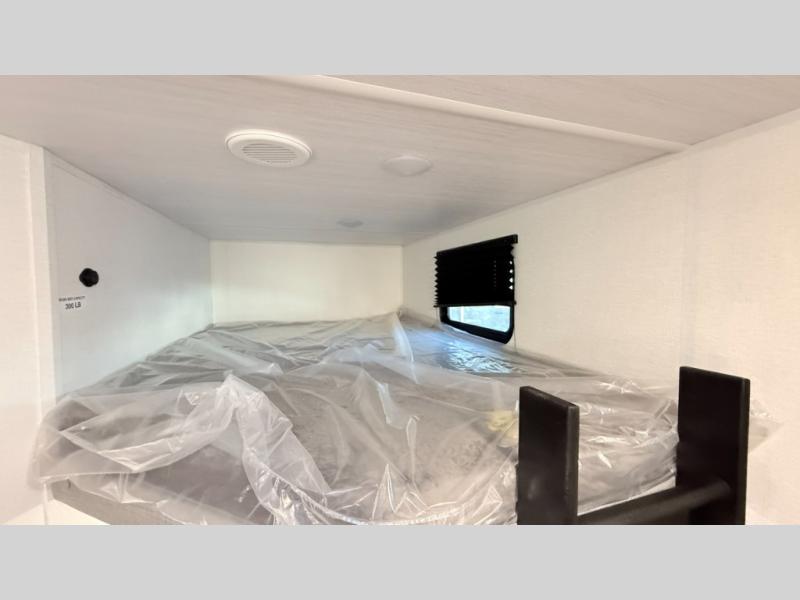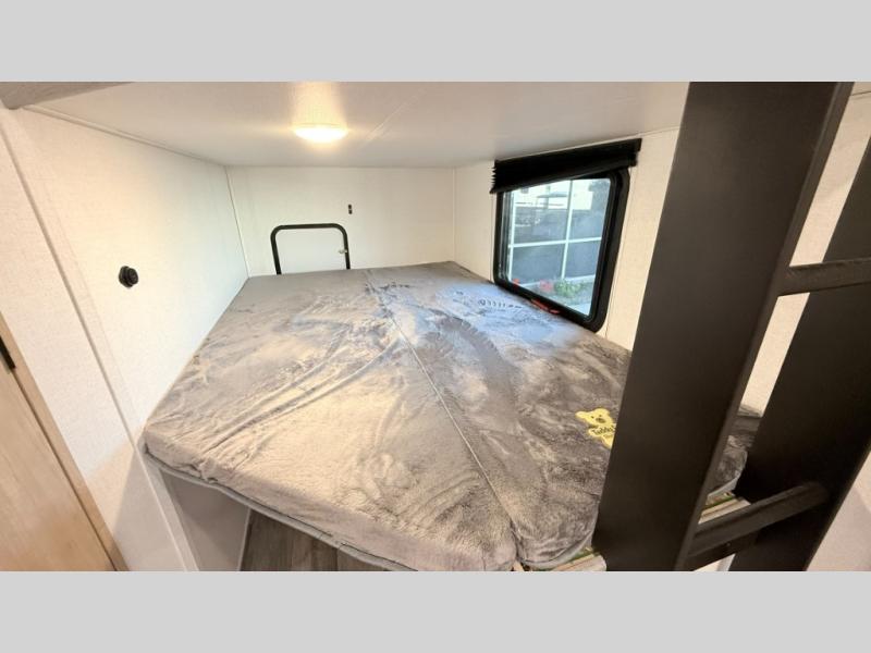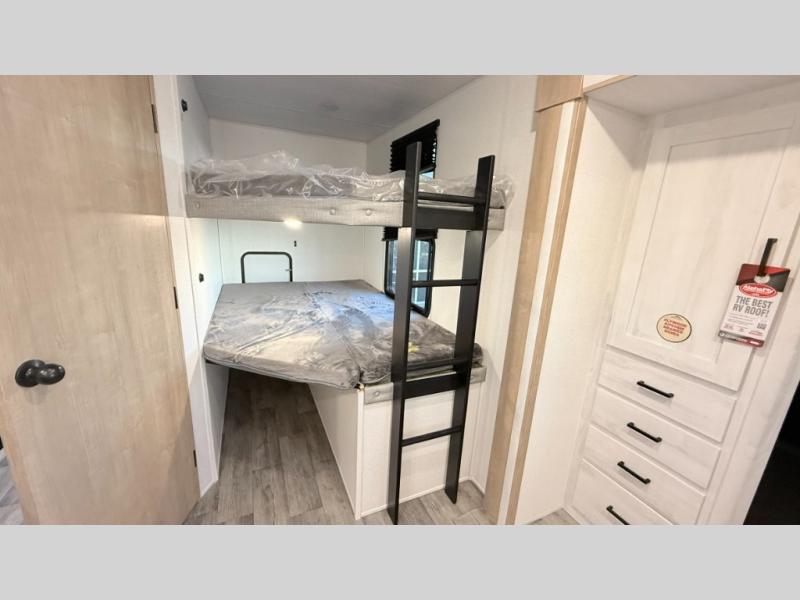 The whole family will have a fun time camping in this travel trailer! The kiddos or guests can sleep on the rear corner double over double bunk beds with additional storage, and you can sleep on the queen bed located in the front private bedroom. Everyone can rinse the sand out of their hair in the rear corner bathroom with the ABS tub surround, plus it has one of the dual entry doors. The fireplace adds comfort while you are relaxing on the tri-fold sofa which can be replaced for optional theater seating. With a countertop extension and air fryer microwave, the chef will have an easy time preparing delicious home cooked meals that can be enjoyed at the booth dinette with storage underneath. There is not only an interior 10.7 cu. ft. residential inspired refrigerator, but also an exterior 1.6 cu. ft. refrigerator. There is plenty of exterior storage and even an outside shower with hot and cold water!