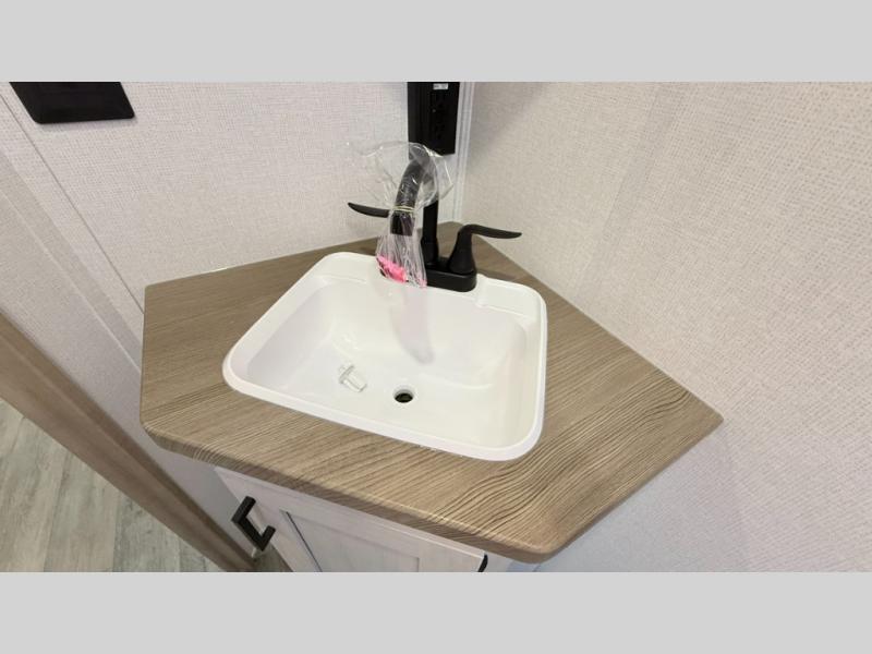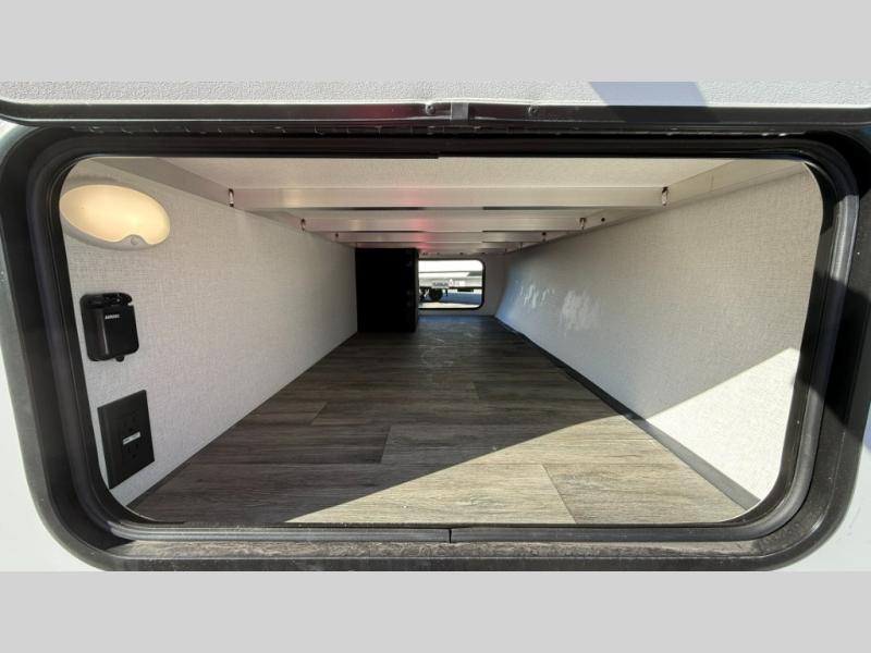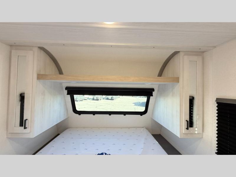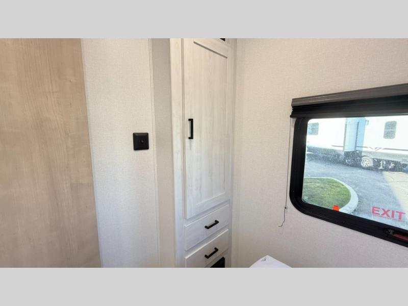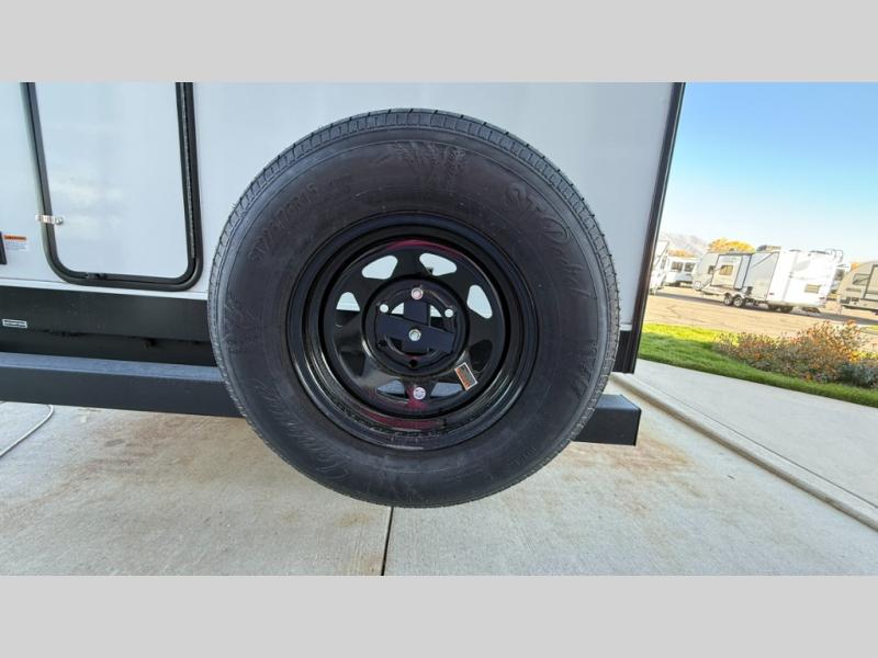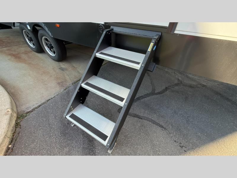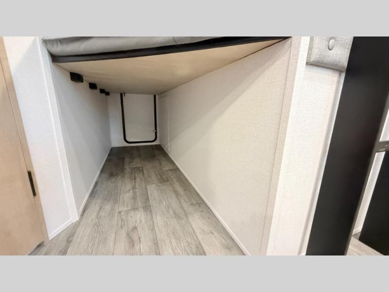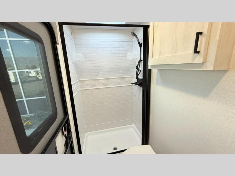The whole family will have a fun time camping in this travel trailer! The kiddos or guests can sleep on the rear corner double over double bunk beds with additional storage, and you can sleep on the queen bed located in the front private bedroom. Everyone can rinse the sand out of their hair in the rear corner bathroom with the ABS tub surround, plus it has one of the dual entry doors. The fireplace adds comfort while you are relaxing on the tri-fold sofa which can be replaced for optional theater seating. With a countertop extension and air fryer microwave, the chef will have an easy time preparing delicious home cooked meals that can be enjoyed at the booth dinette with storage underneath. There is not only an interior 10.7 cu. ft. residential inspired refrigerator, but also an exterior 1.6 cu. ft. refrigerator. There is plenty of exterior storage and even an outside shower with hot and cold water!