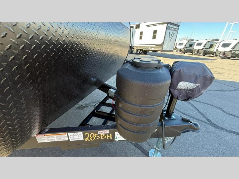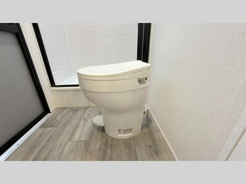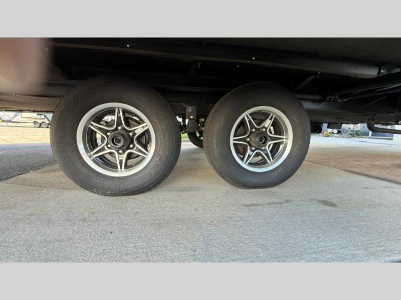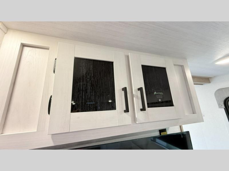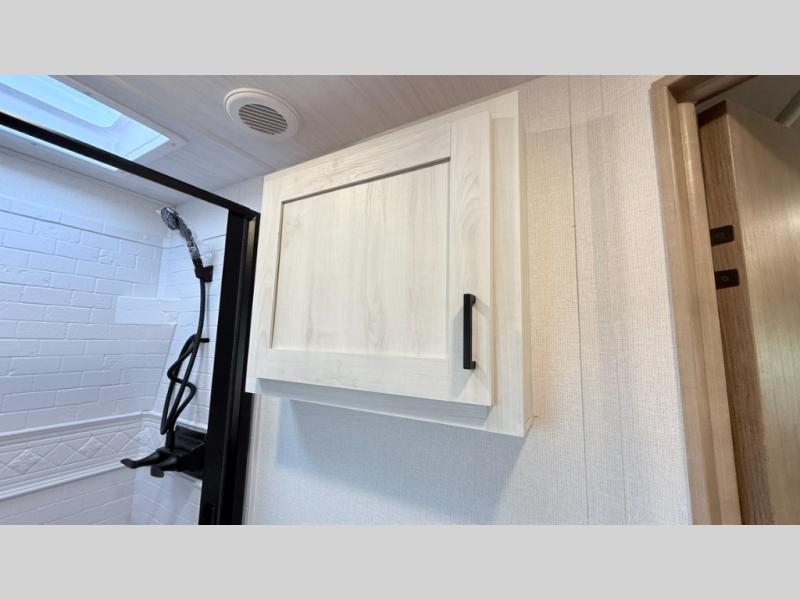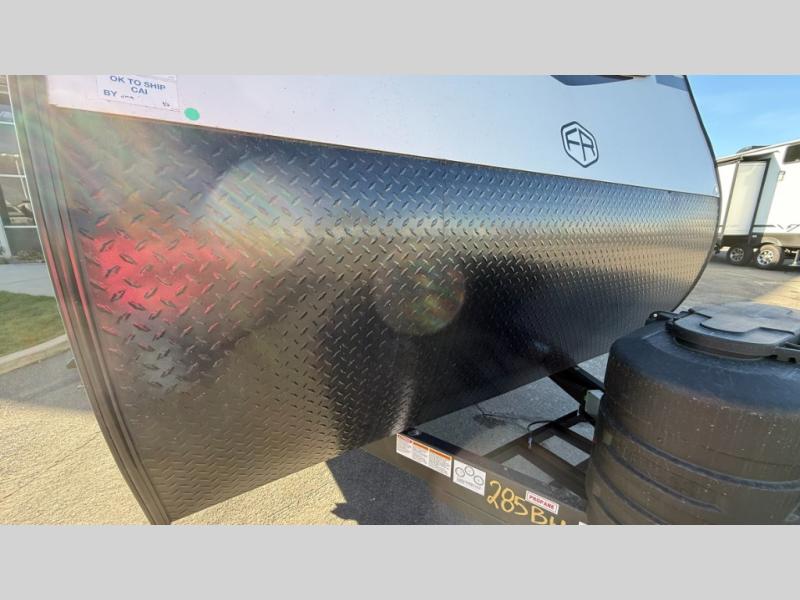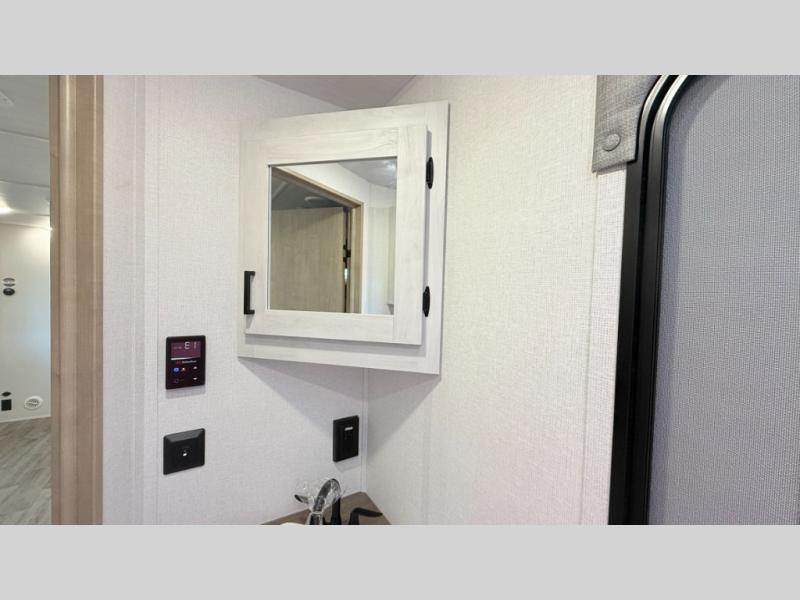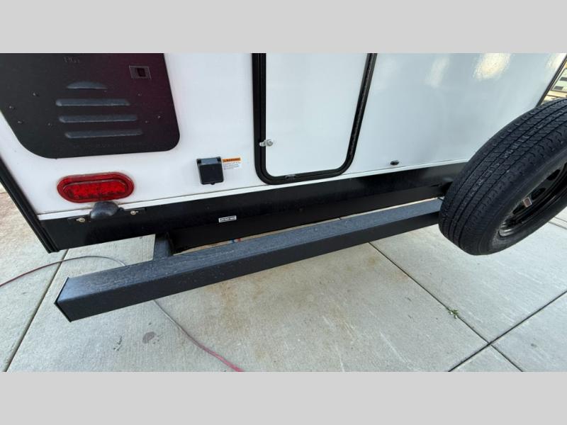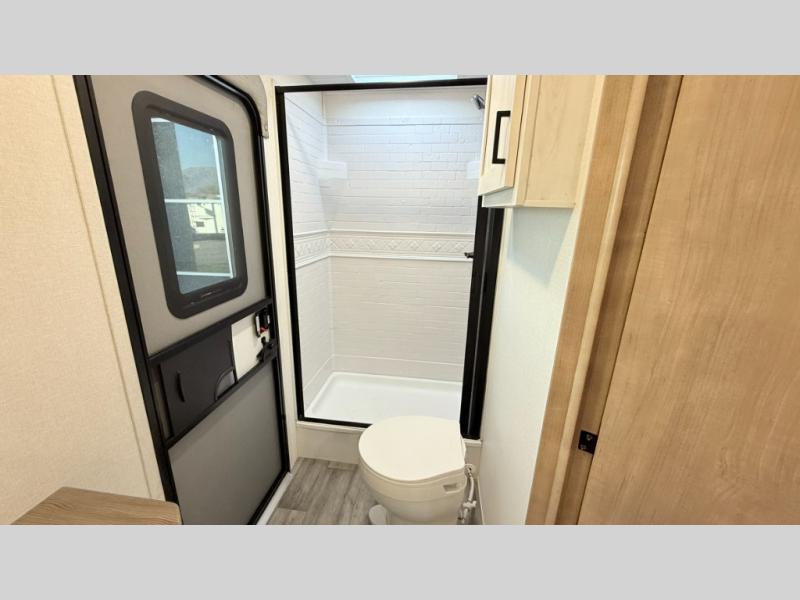 The whole family will have a fun time camping in this travel trailer! The kiddos or guests can sleep on the rear corner double over double bunk beds with additional storage, and you can sleep on the queen bed located in the front private bedroom. Everyone can rinse the sand out of their hair in the rear corner bathroom with the ABS tub surround, plus it has one of the dual entry doors. The fireplace adds comfort while you are relaxing on the tri-fold sofa which can be replaced for optional theater seating. With a countertop extension and air fryer microwave, the chef will have an easy time preparing delicious home cooked meals that can be enjoyed at the booth dinette with storage underneath. There is not only an interior 10.7 cu. ft. residential inspired refrigerator, but also an exterior 1.6 cu. ft. refrigerator. There is plenty of exterior storage and even an outside shower with hot and cold water!