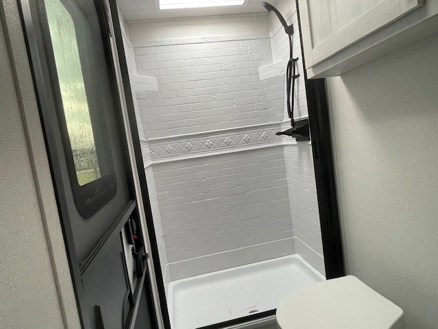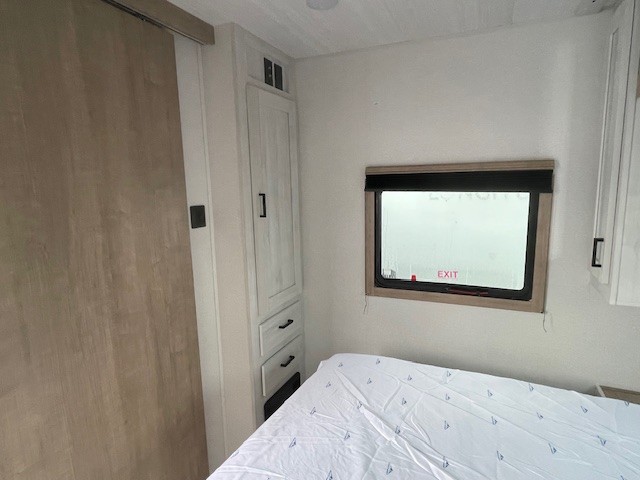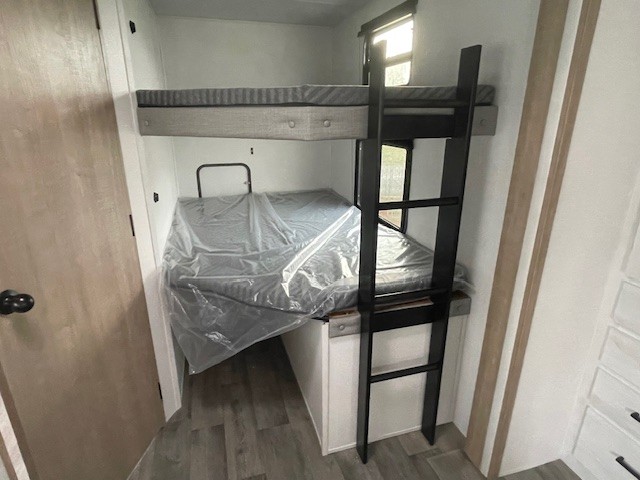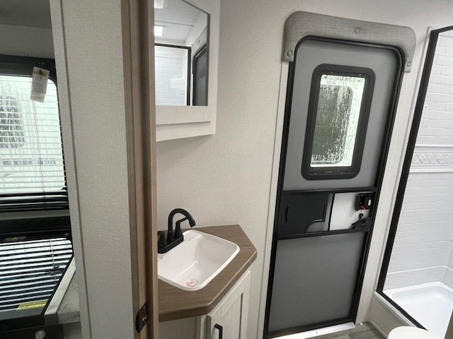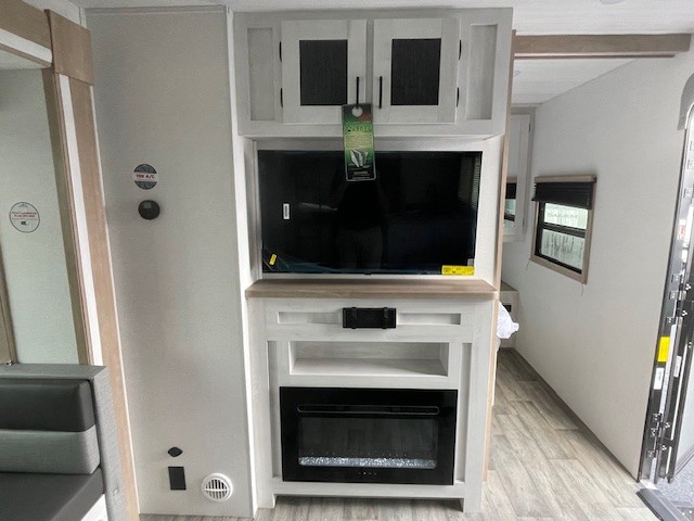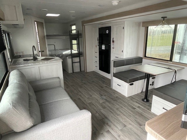 The whole family will have a fun time camping in this travel trailer! The kiddos or guests can sleep on the rear corner double over double bunk beds with additional storage, and you can sleep on the queen bed located in the front private bedroom. Everyone can rinse the sand out of their hair in the rear corner bathroom with the ABS tub surround, plus it has one of the dual entry doors. The fireplace adds comfort while you are relaxing on the tri-fold sofa which can be replaced for optional theater seating. With a countertop extension and air fryer microwave, the chef will have an easy time preparing delicious home cooked meals that can be enjoyed at the booth dinette with storage underneath. There is not only an interior 10.7 cu. ft. residential inspired refrigerator, but also an exterior 1.6 cu. ft. refrigerator. There is plenty of exterior storage and even an outside shower with hot and cold water!