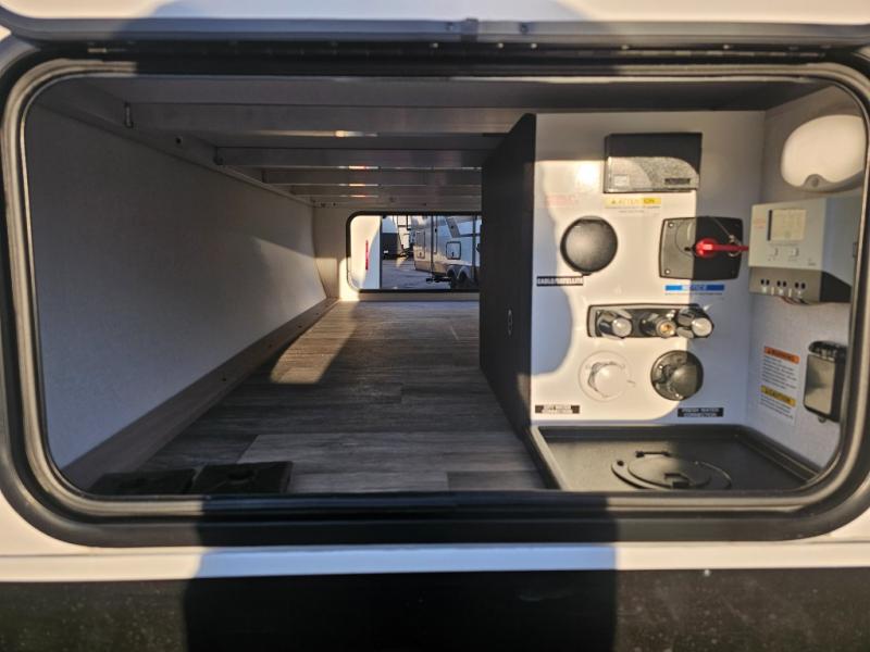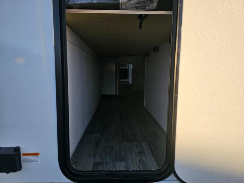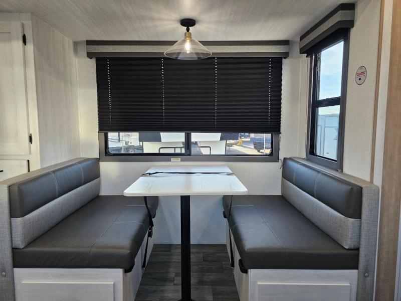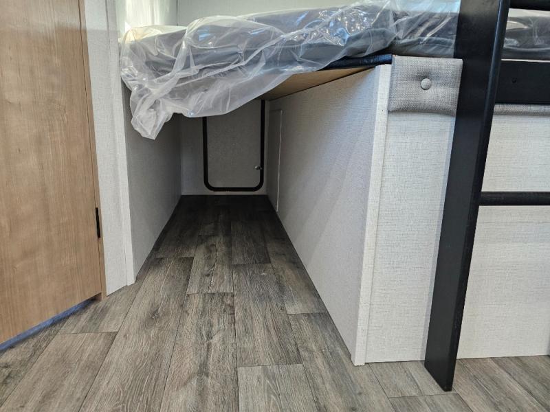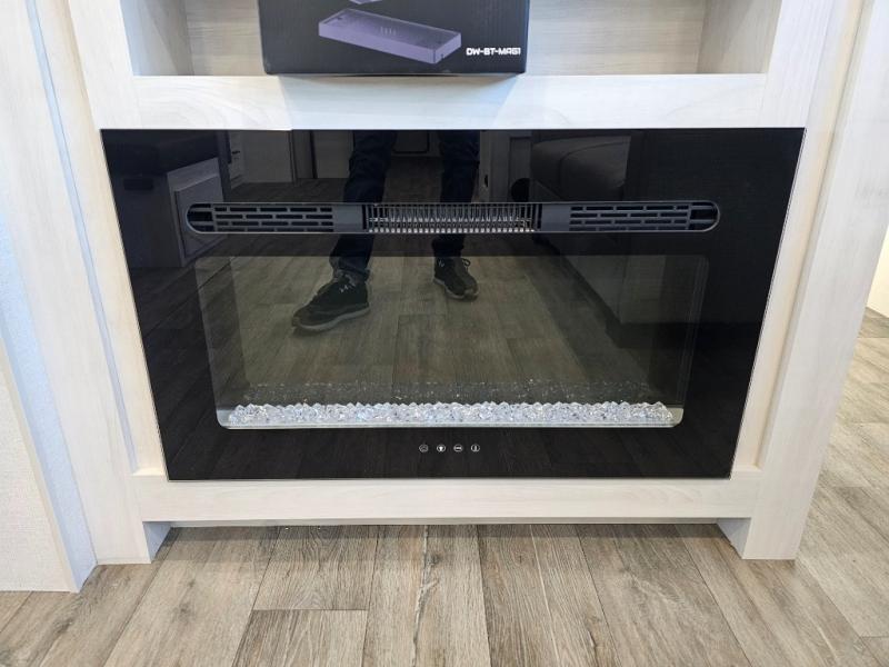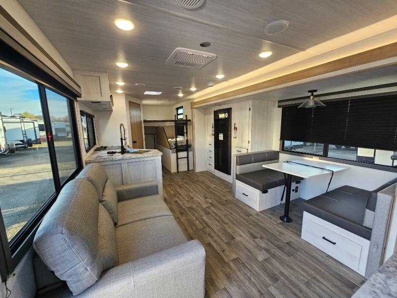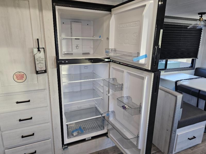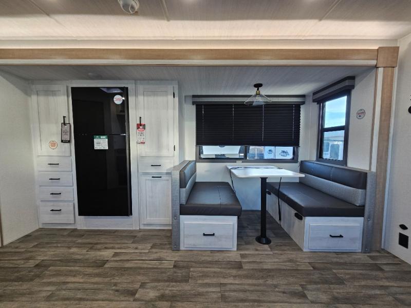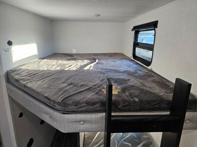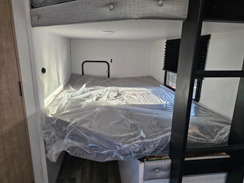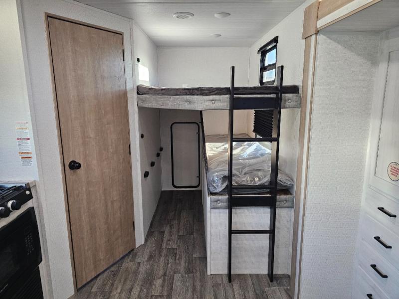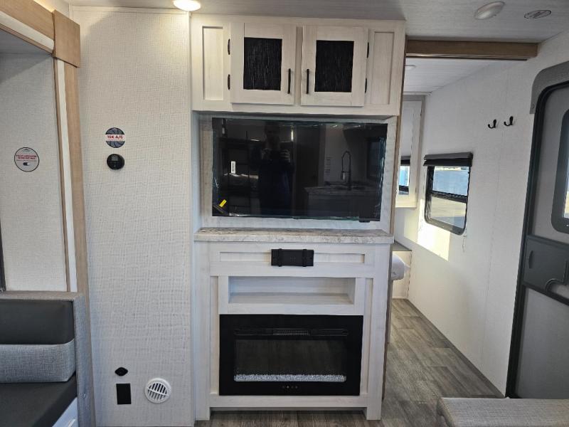 The whole family will have a fun time camping in this travel trailer! The kiddos or guests can sleep on the rear corner double over double bunk beds with additional storage, and you can sleep on the queen bed located in the front private bedroom. Everyone can rinse the sand out of their hair in the rear corner bathroom with the ABS tub surround, plus it has one of the dual entry doors. The fireplace adds comfort while you are relaxing on the tri-fold sofa which can be replaced for optional theater seating. With a countertop extension and air fryer microwave, the chef will have an easy time preparing delicious home cooked meals that can be enjoyed at the booth dinette with storage underneath. There is not only an interior 10.7 cu. ft. residential inspired refrigerator, but also an exterior 1.6 cu. ft. refrigerator. There is plenty of exterior storage and even an outside shower with hot and cold water!
