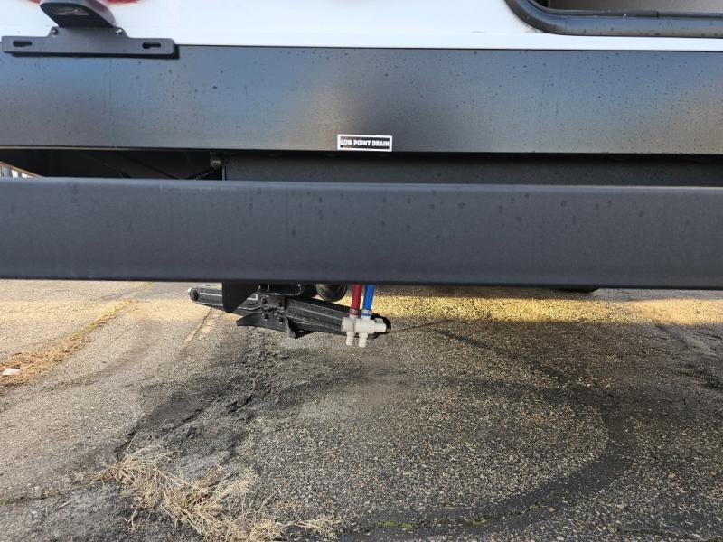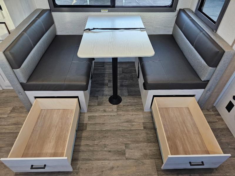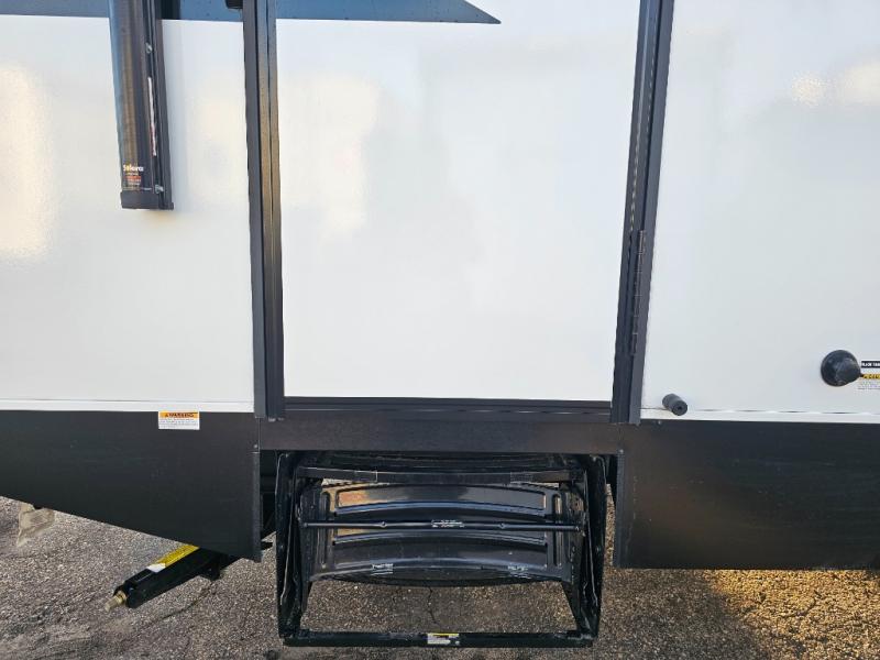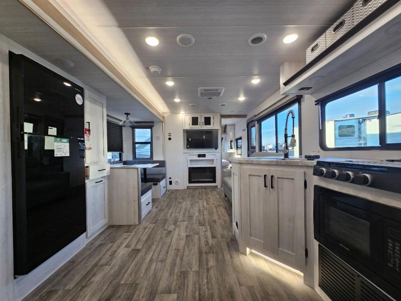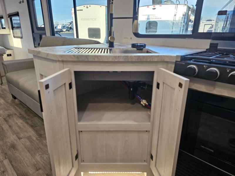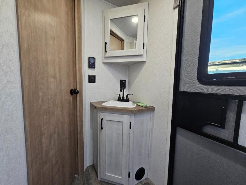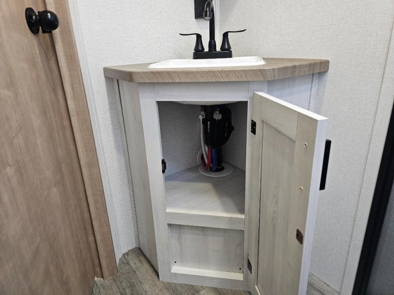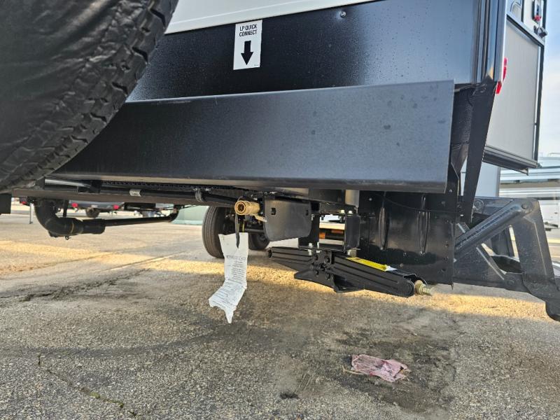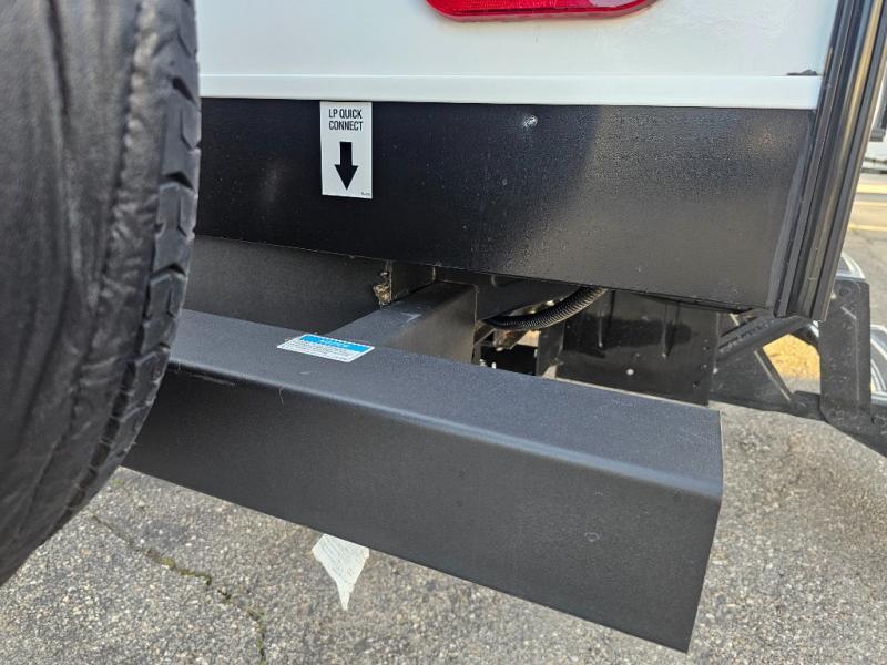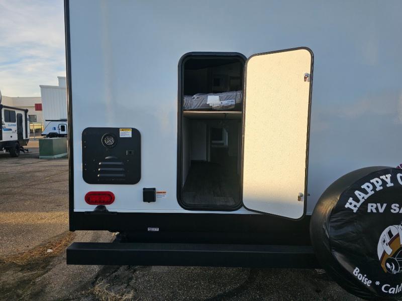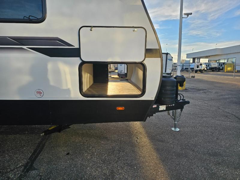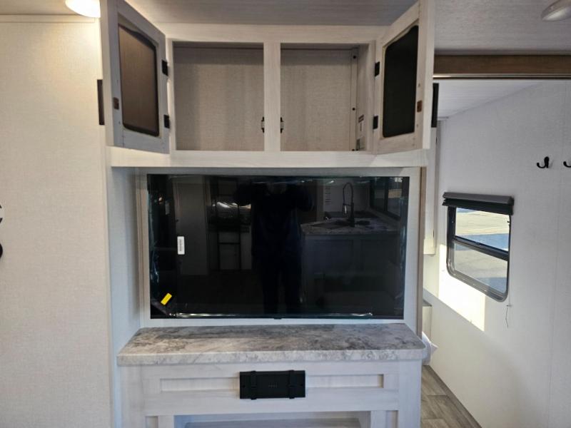 The whole family will have a fun time camping in this travel trailer! The kiddos or guests can sleep on the rear corner double over double bunk beds with additional storage, and you can sleep on the queen bed located in the front private bedroom. Everyone can rinse the sand out of their hair in the rear corner bathroom with the ABS tub surround, plus it has one of the dual entry doors. The fireplace adds comfort while you are relaxing on the tri-fold sofa which can be replaced for optional theater seating. With a countertop extension and air fryer microwave, the chef will have an easy time preparing delicious home cooked meals that can be enjoyed at the booth dinette with storage underneath. There is not only an interior 10.7 cu. ft. residential inspired refrigerator, but also an exterior 1.6 cu. ft. refrigerator. There is plenty of exterior storage and even an outside shower with hot and cold water!