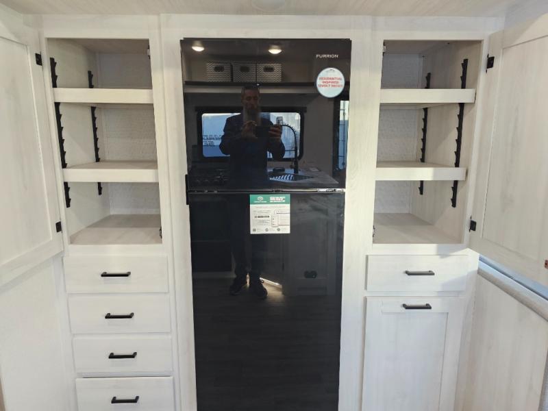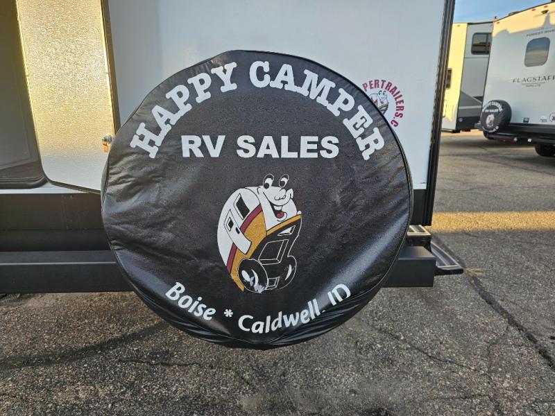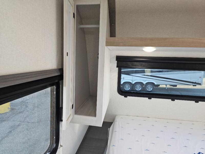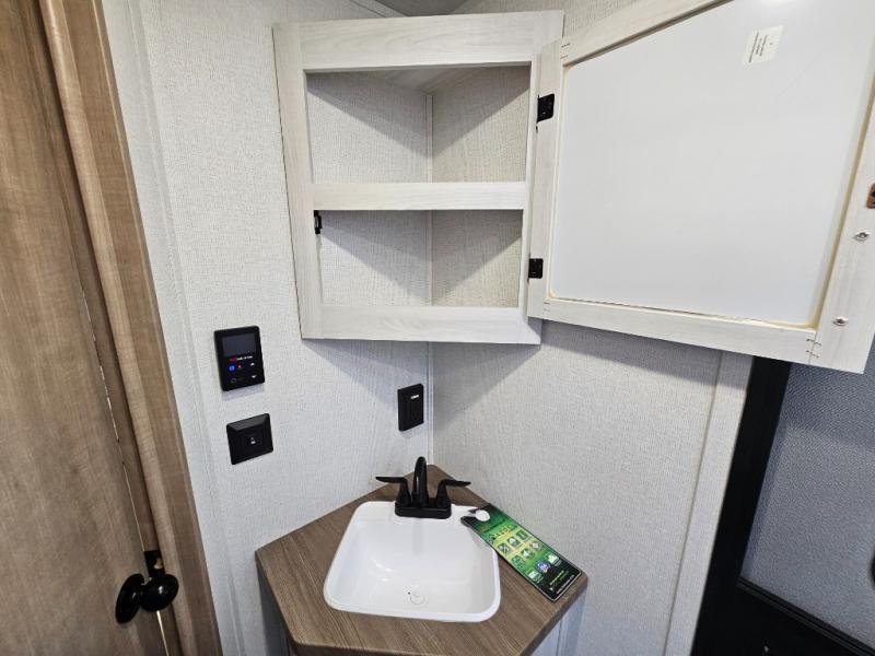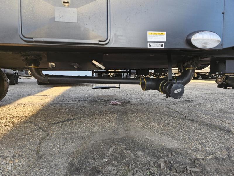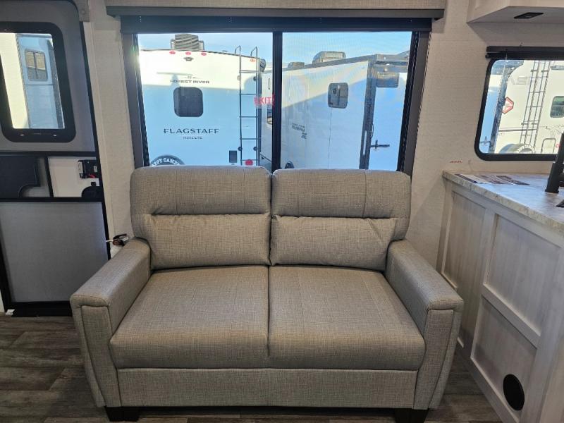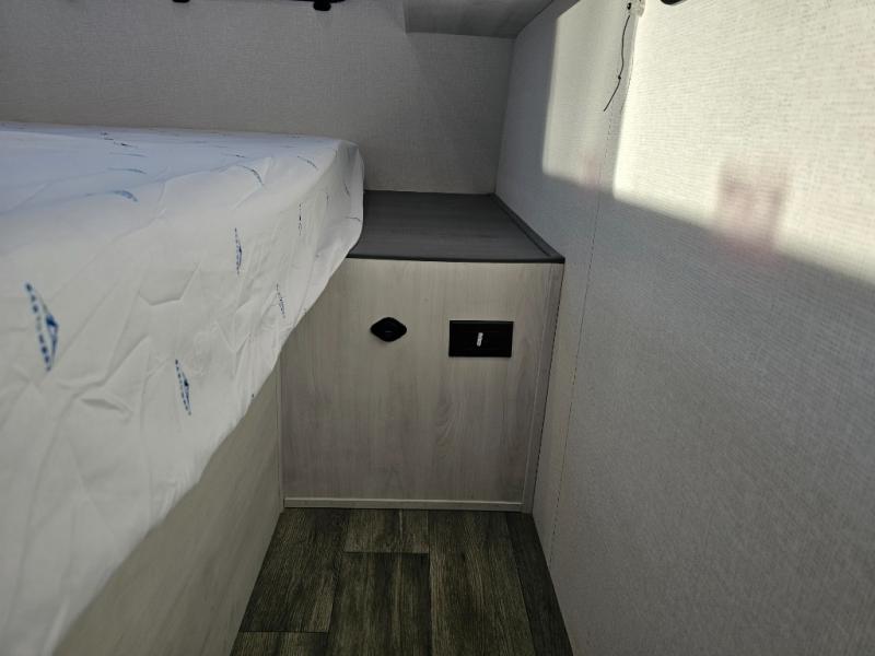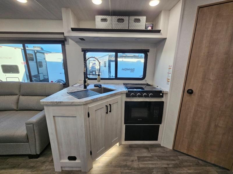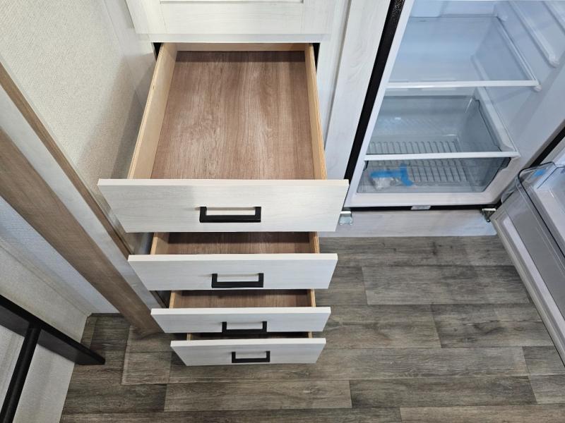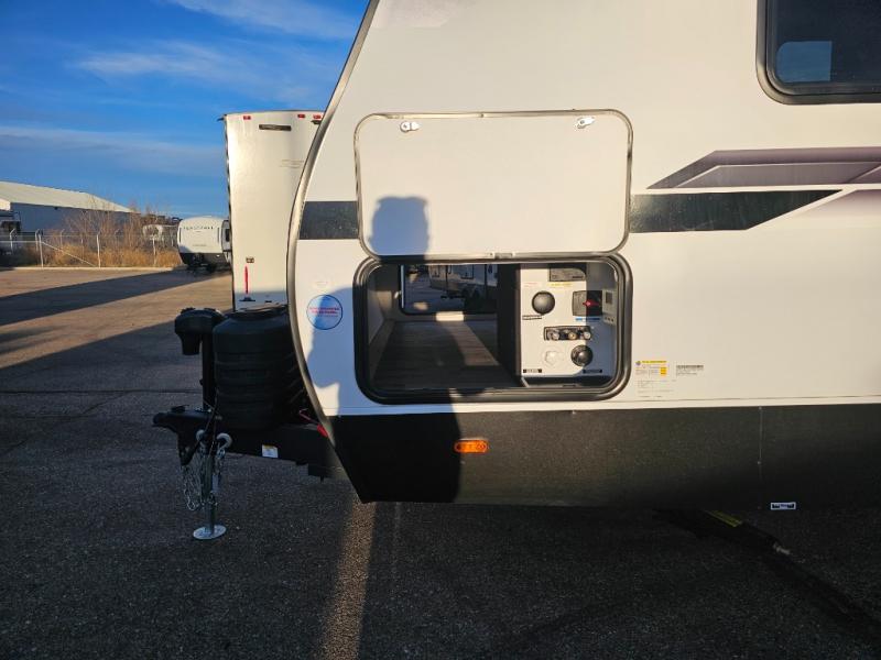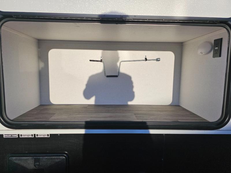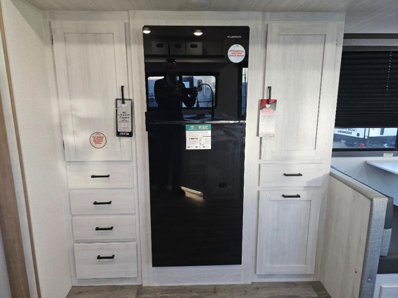 The whole family will have a fun time camping in this travel trailer! The kiddos or guests can sleep on the rear corner double over double bunk beds with additional storage, and you can sleep on the queen bed located in the front private bedroom. Everyone can rinse the sand out of their hair in the rear corner bathroom with the ABS tub surround, plus it has one of the dual entry doors. The fireplace adds comfort while you are relaxing on the tri-fold sofa which can be replaced for optional theater seating. With a countertop extension and air fryer microwave, the chef will have an easy time preparing delicious home cooked meals that can be enjoyed at the booth dinette with storage underneath. There is not only an interior 10.7 cu. ft. residential inspired refrigerator, but also an exterior 1.6 cu. ft. refrigerator. There is plenty of exterior storage and even an outside shower with hot and cold water!