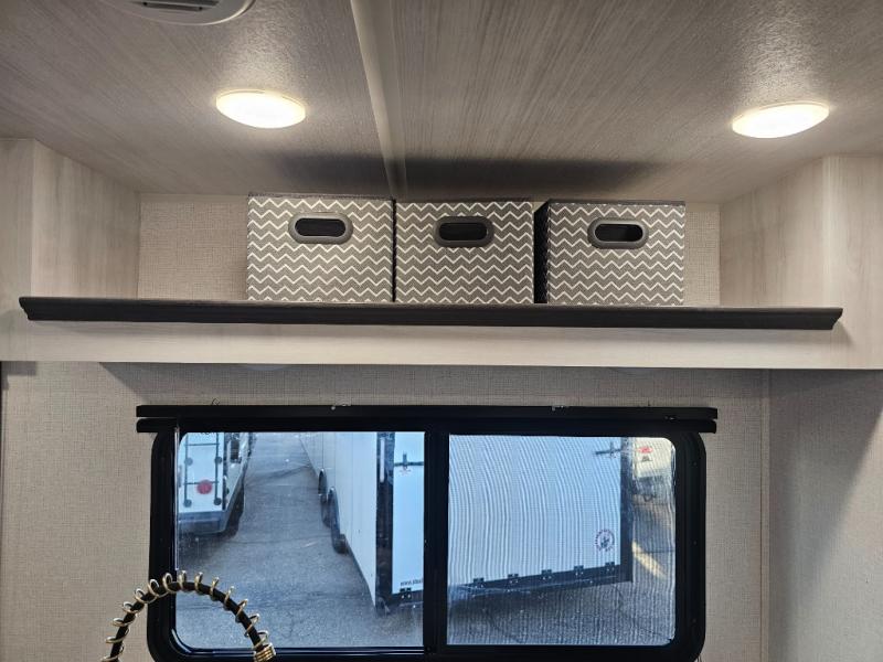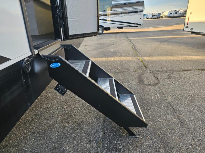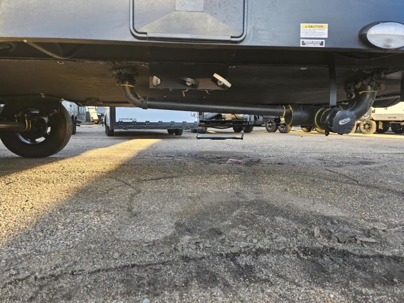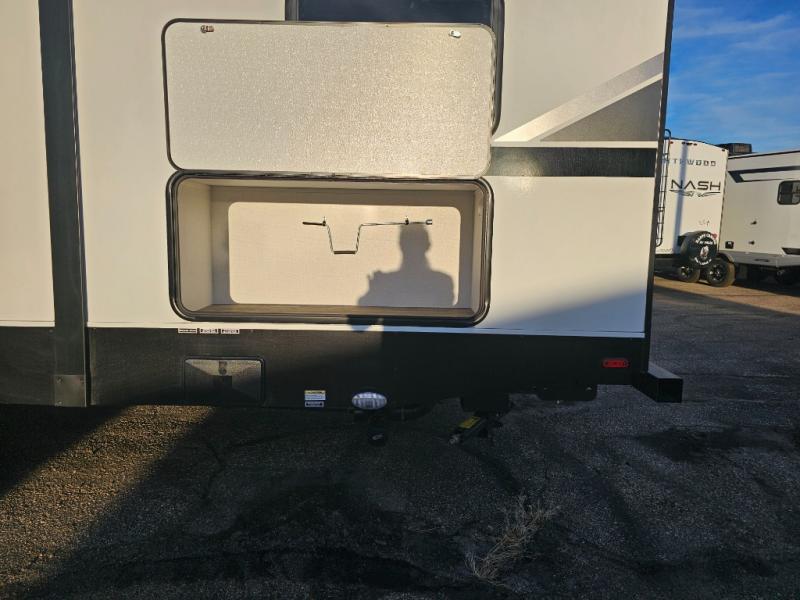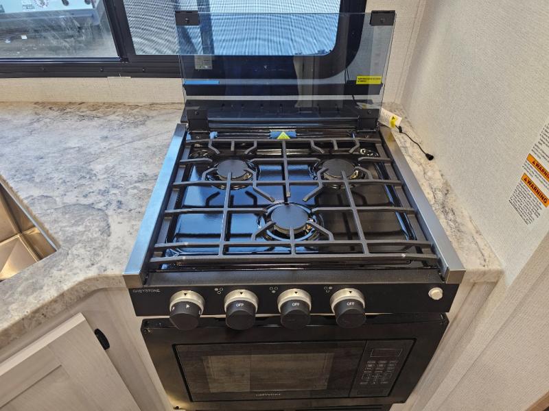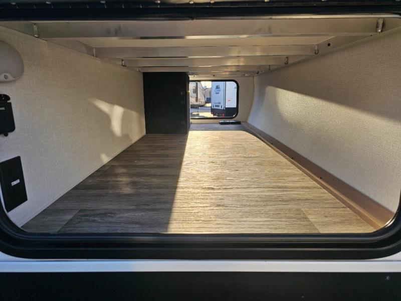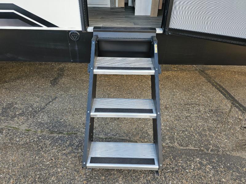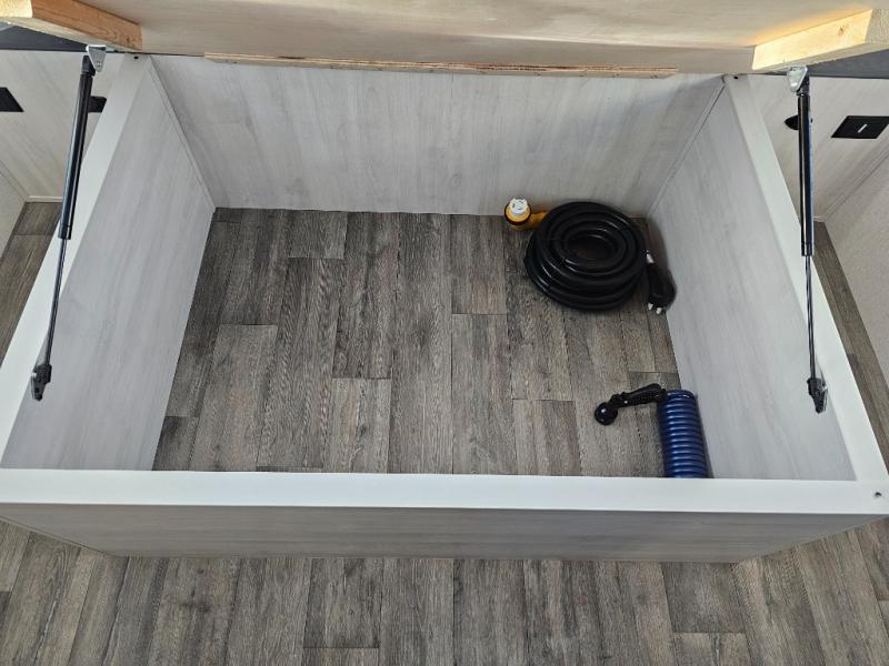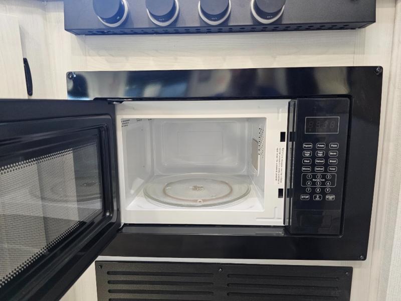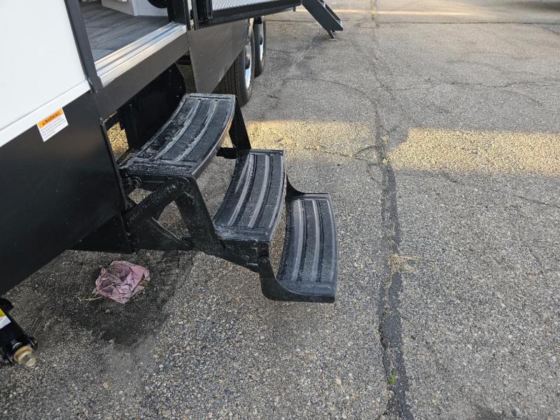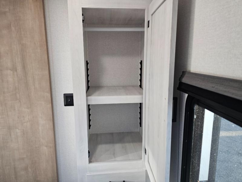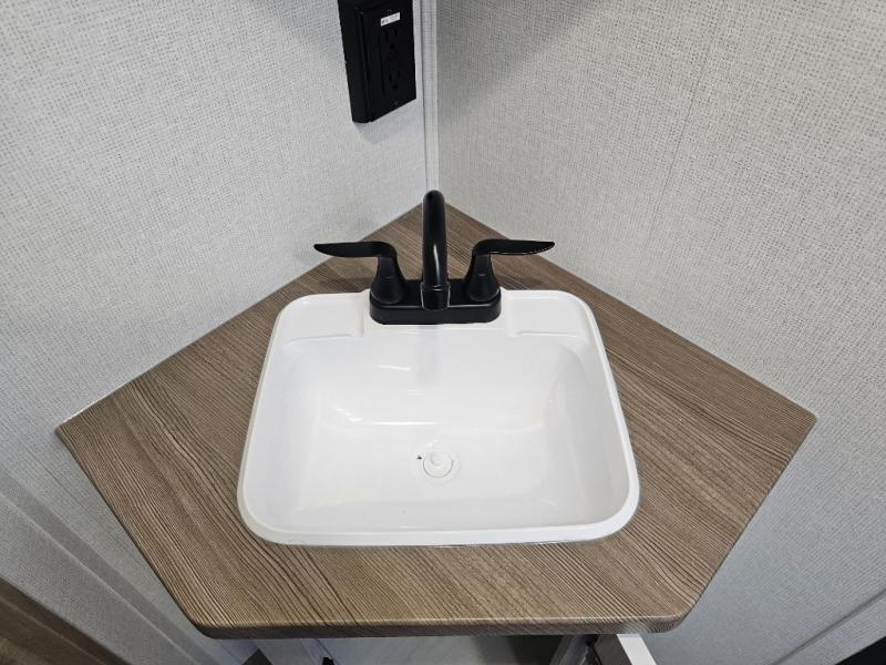 The whole family will have a fun time camping in this travel trailer! The kiddos or guests can sleep on the rear corner double over double bunk beds with additional storage, and you can sleep on the queen bed located in the front private bedroom. Everyone can rinse the sand out of their hair in the rear corner bathroom with the ABS tub surround, plus it has one of the dual entry doors. The fireplace adds comfort while you are relaxing on the tri-fold sofa which can be replaced for optional theater seating. With a countertop extension and air fryer microwave, the chef will have an easy time preparing delicious home cooked meals that can be enjoyed at the booth dinette with storage underneath. There is not only an interior 10.7 cu. ft. residential inspired refrigerator, but also an exterior 1.6 cu. ft. refrigerator. There is plenty of exterior storage and even an outside shower with hot and cold water!