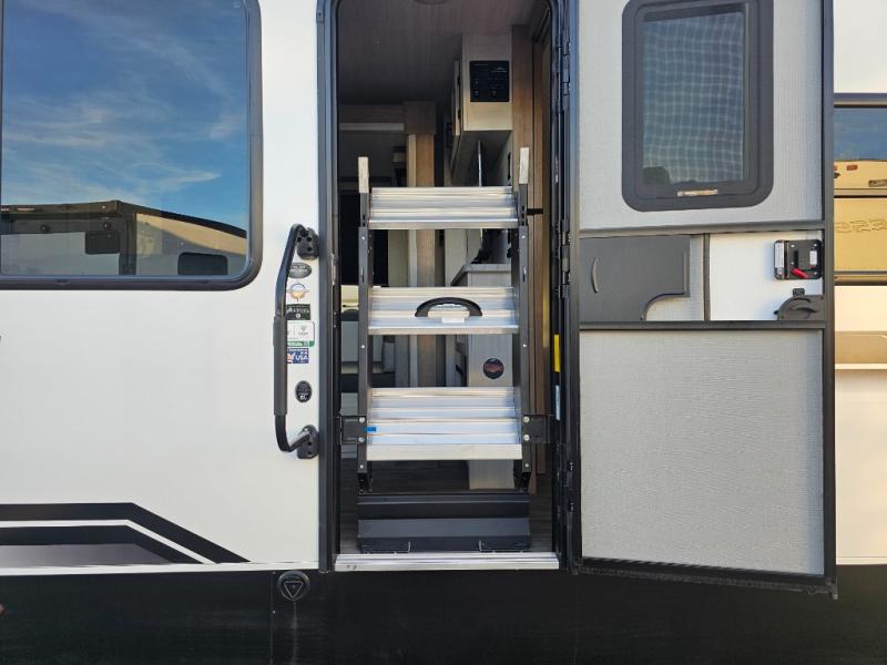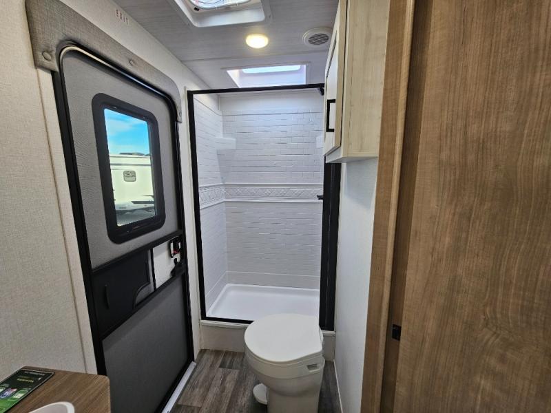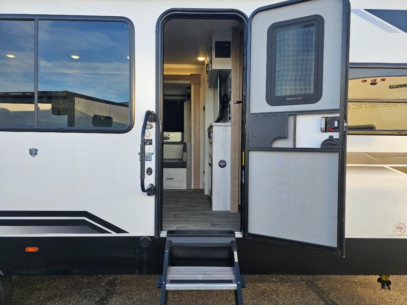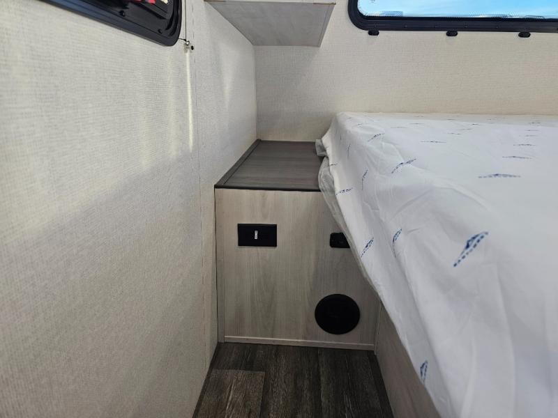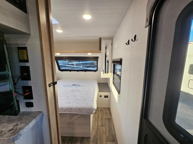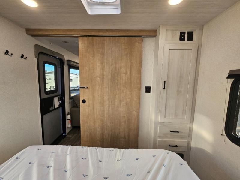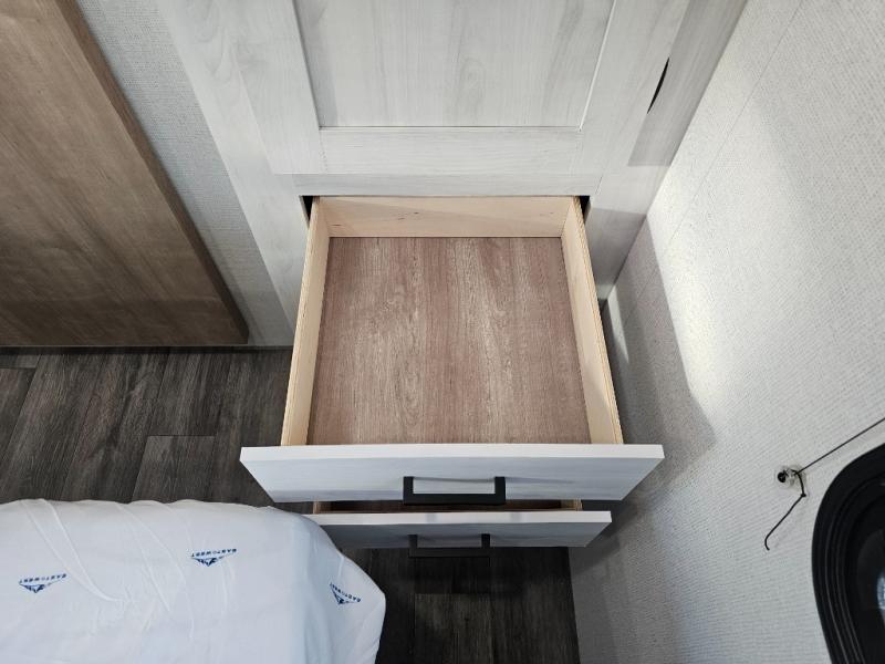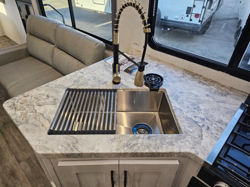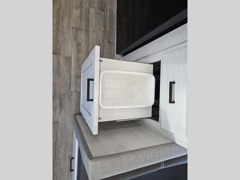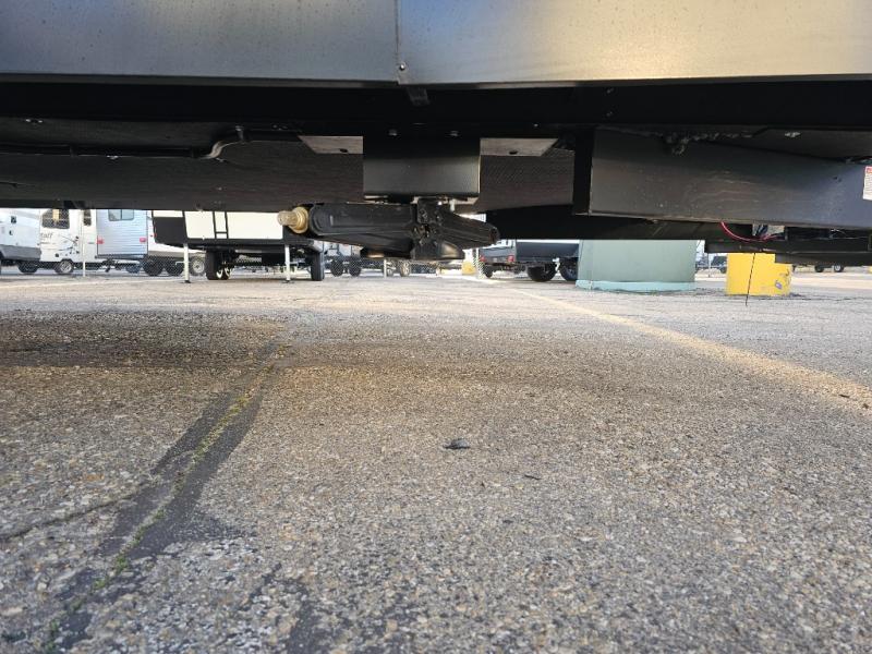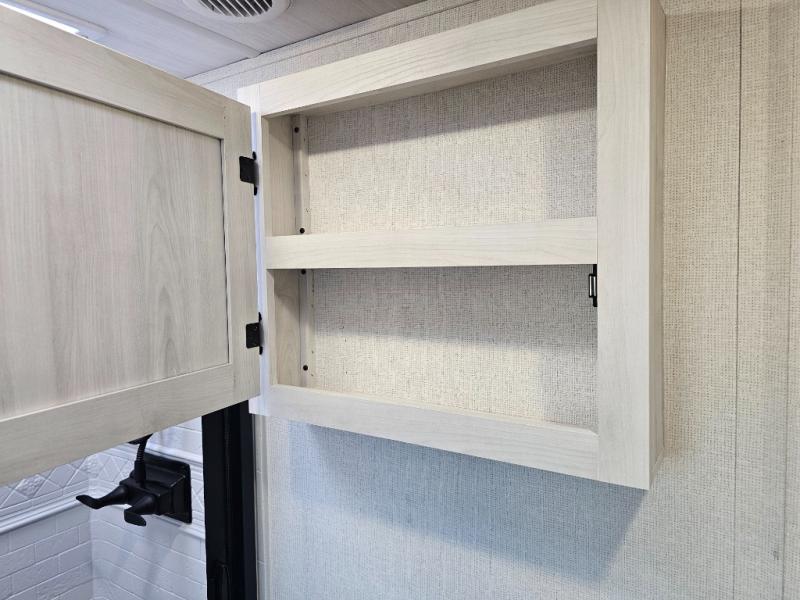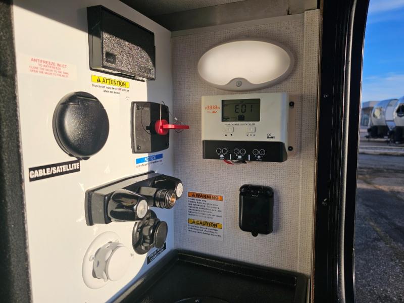 The whole family will have a fun time camping in this travel trailer! The kiddos or guests can sleep on the rear corner double over double bunk beds with additional storage, and you can sleep on the queen bed located in the front private bedroom. Everyone can rinse the sand out of their hair in the rear corner bathroom with the ABS tub surround, plus it has one of the dual entry doors. The fireplace adds comfort while you are relaxing on the tri-fold sofa which can be replaced for optional theater seating. With a countertop extension and air fryer microwave, the chef will have an easy time preparing delicious home cooked meals that can be enjoyed at the booth dinette with storage underneath. There is not only an interior 10.7 cu. ft. residential inspired refrigerator, but also an exterior 1.6 cu. ft. refrigerator. There is plenty of exterior storage and even an outside shower with hot and cold water!