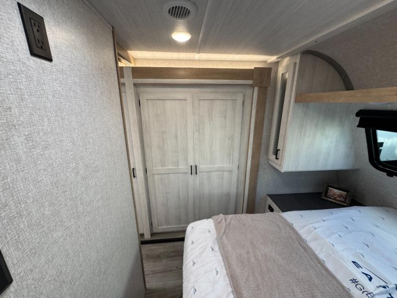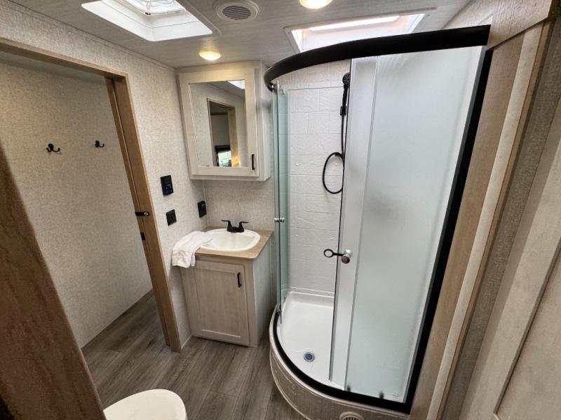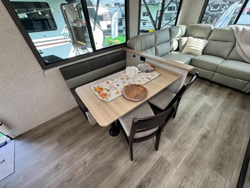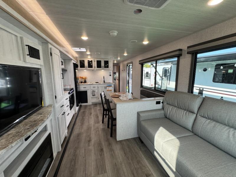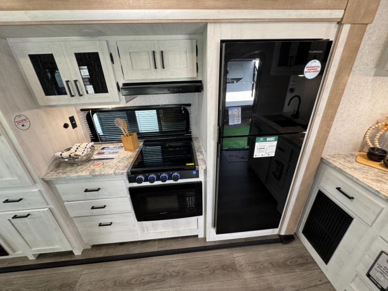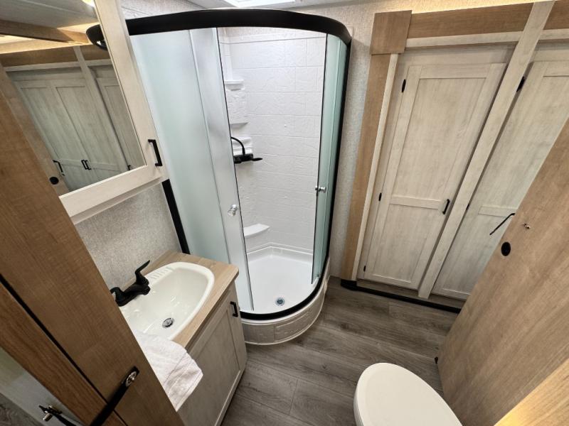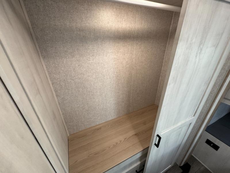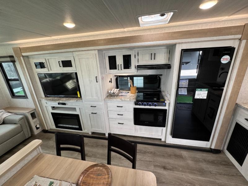 You won't believe the comfort that is found in this travel trailer! The rear living area will be a favorite place to relax with its large L-shaped sofa and fireplace, and the large slide out here will give the chef plenty of space to prepare meals in the kitchen. A 48" dinette with bench seating on one side and two chairs on the other provide a place to dine together, or you may just find yourselves eating outdoors under the 21' patio awning. There is also storage under the dinette, a large countertop with a sink, plus a kitchen pantry to keep snacks stocked. The front of this unit includes the master bedroom, complete with a queen bed, dual nightstands, and a second slide out with the bedroom wardrobe and bath linen closet!