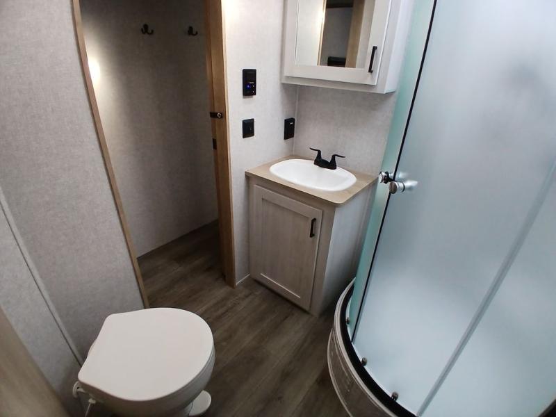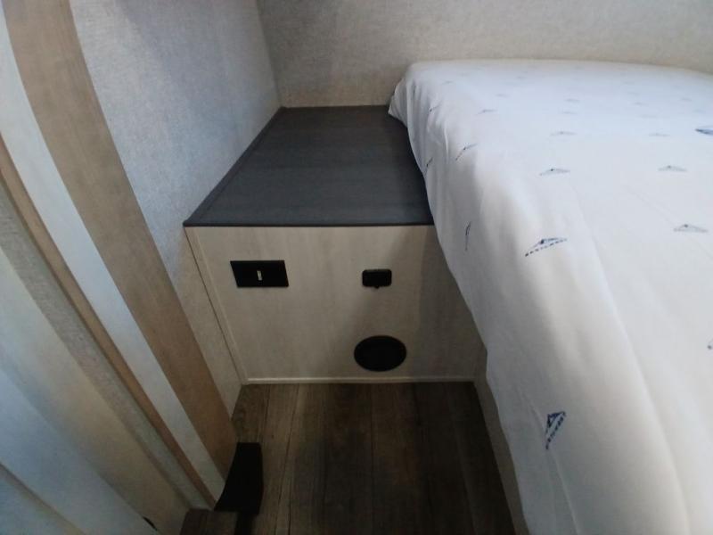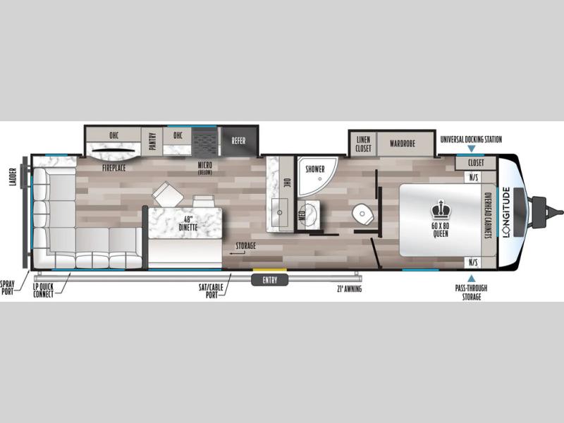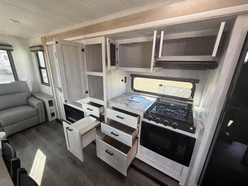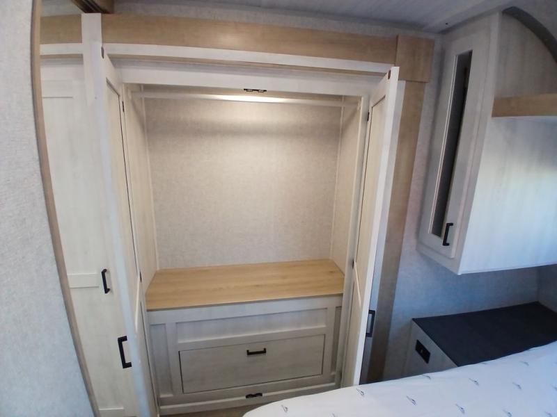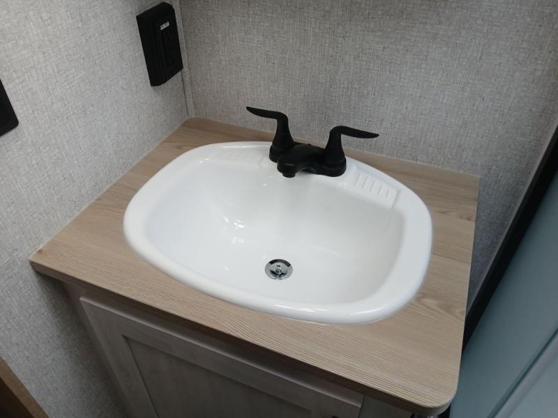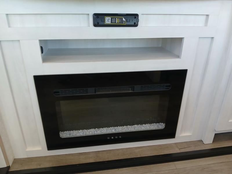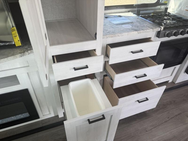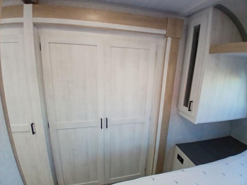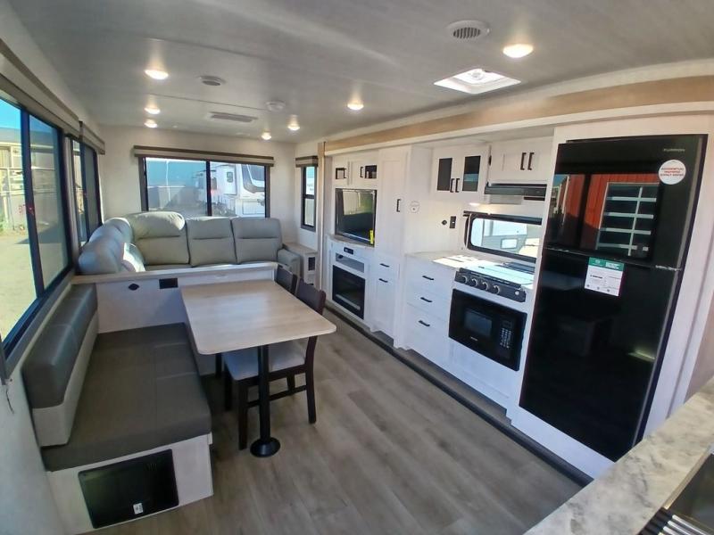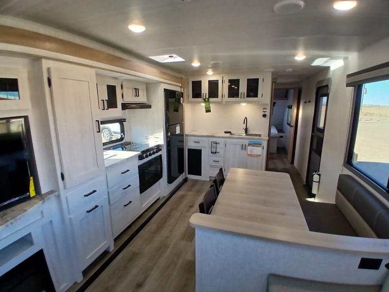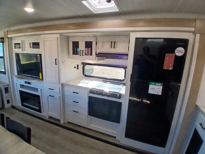 You won't believe the comfort that is found in this travel trailer! The rear living area will be a favorite place to relax with its large L-shaped sofa and fireplace, and the large slide out here will give the chef plenty of space to prepare meals in the kitchen. A 48" dinette with bench seating on one side and two chairs on the other provide a place to dine together, or you may just find yourselves eating outdoors under the 21' patio awning. There is also storage under the dinette, a large countertop with a sink, plus a kitchen pantry to keep snacks stocked. The front of this unit includes the master bedroom, complete with a queen bed, dual nightstands, and a second slide out with the bedroom wardrobe and bath linen closet!
