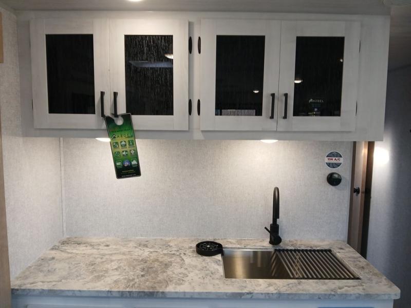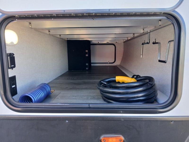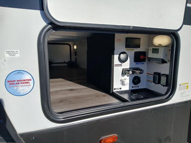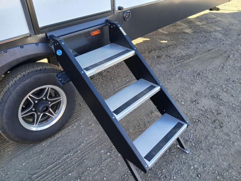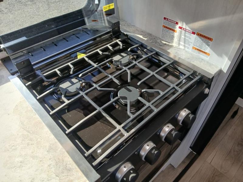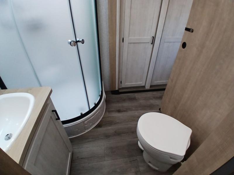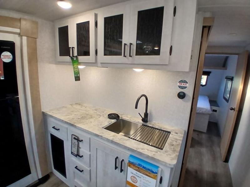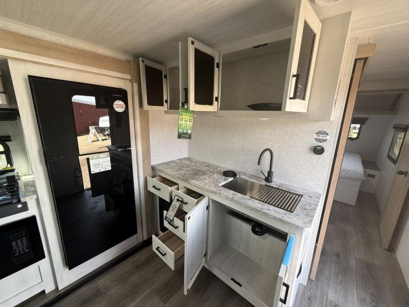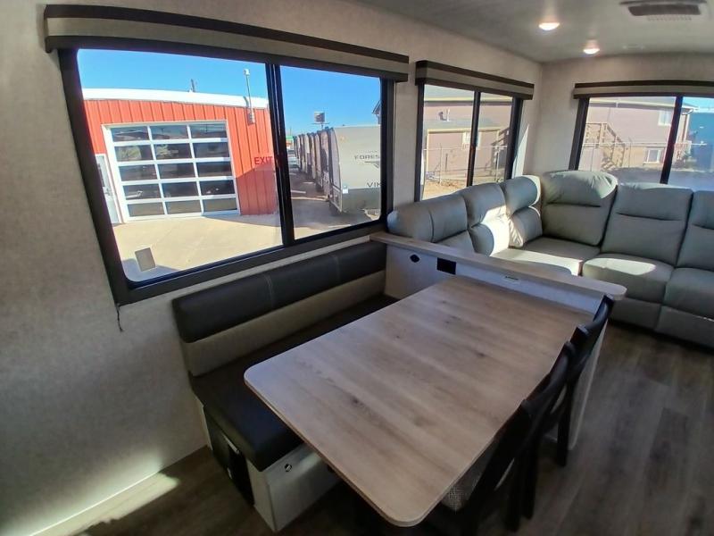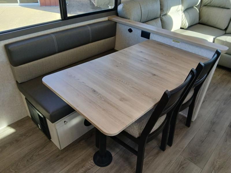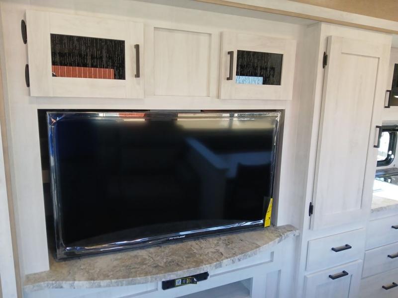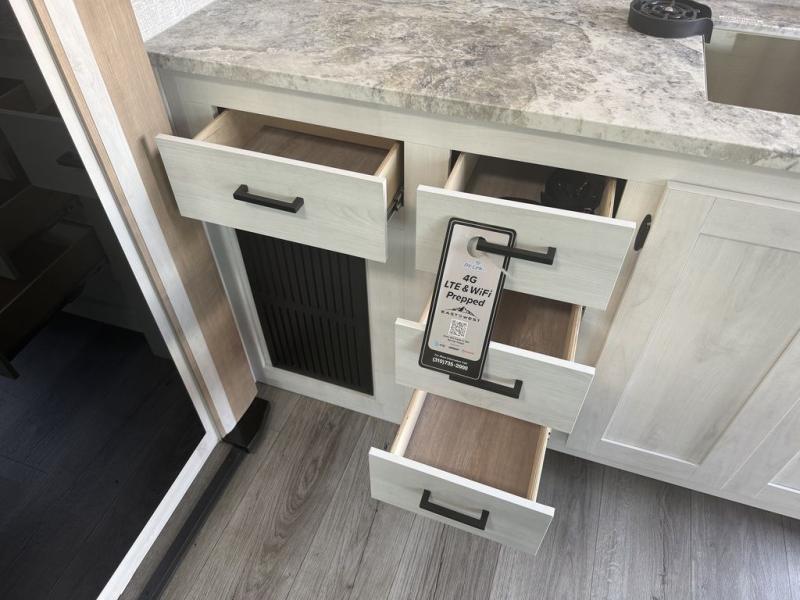 You won't believe the comfort that is found in this travel trailer! The rear living area will be a favorite place to relax with its large L-shaped sofa and fireplace, and the large slide out here will give the chef plenty of space to prepare meals in the kitchen. A 48" dinette with bench seating on one side and two chairs on the other provide a place to dine together, or you may just find yourselves eating outdoors under the 21' patio awning. There is also storage under the dinette, a large countertop with a sink, plus a kitchen pantry to keep snacks stocked. The front of this unit includes the master bedroom, complete with a queen bed, dual nightstands, and a second slide out with the bedroom wardrobe and bath linen closet!
