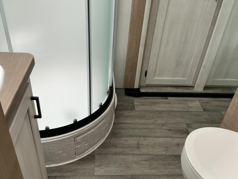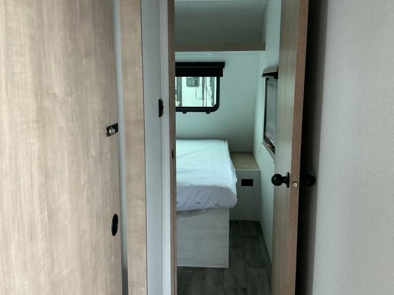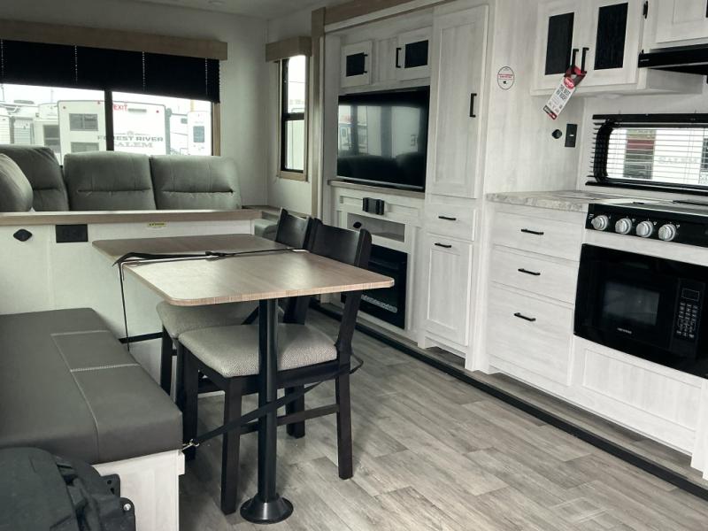 You won't believe the comfort that is found in this travel trailer! The rear living area will be a favorite place to relax with its large L-shaped sofa and fireplace, and the large slide out here will give the chef plenty of space to prepare meals in the kitchen. A 48" dinette with bench seating on one side and two chairs on the other provide a place to dine together, or you may just find yourselves eating outdoors under the 21' patio awning. There is also storage under the dinette, a large countertop with a sink, plus a kitchen pantry to keep snacks stocked. The front of this unit includes the master bedroom, complete with a queen bed, dual nightstands, and a second slide out with the bedroom wardrobe and bath linen closet!