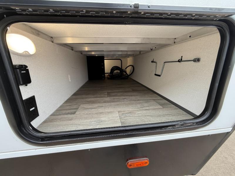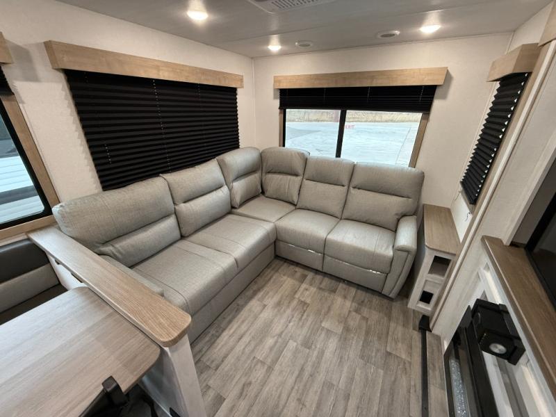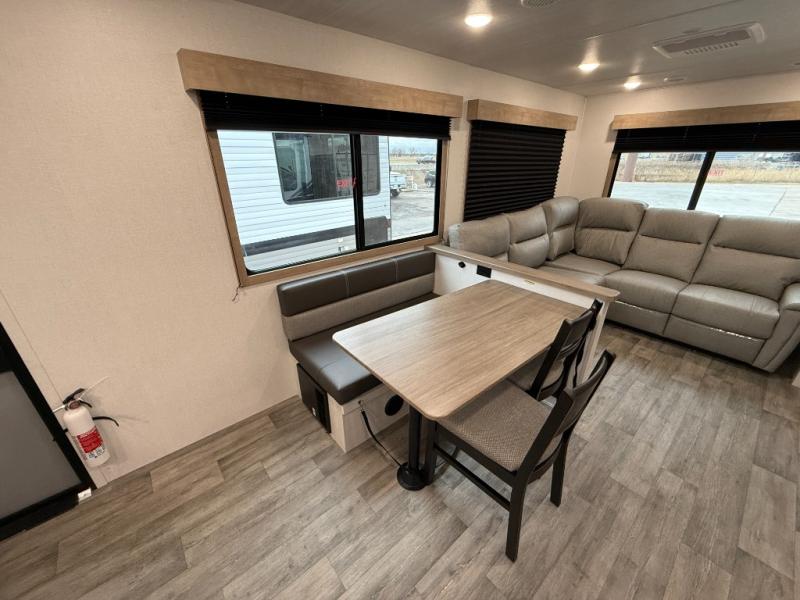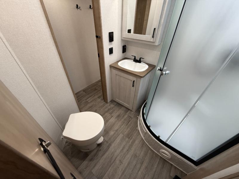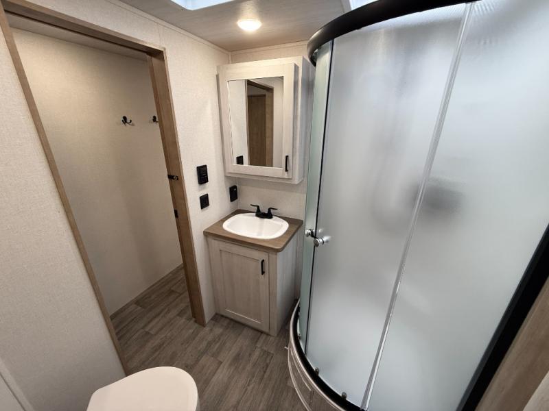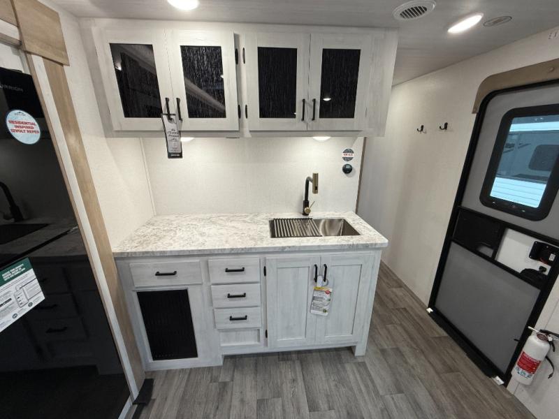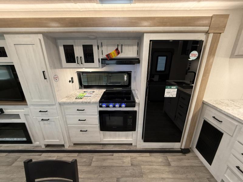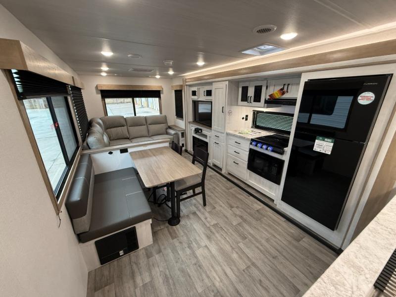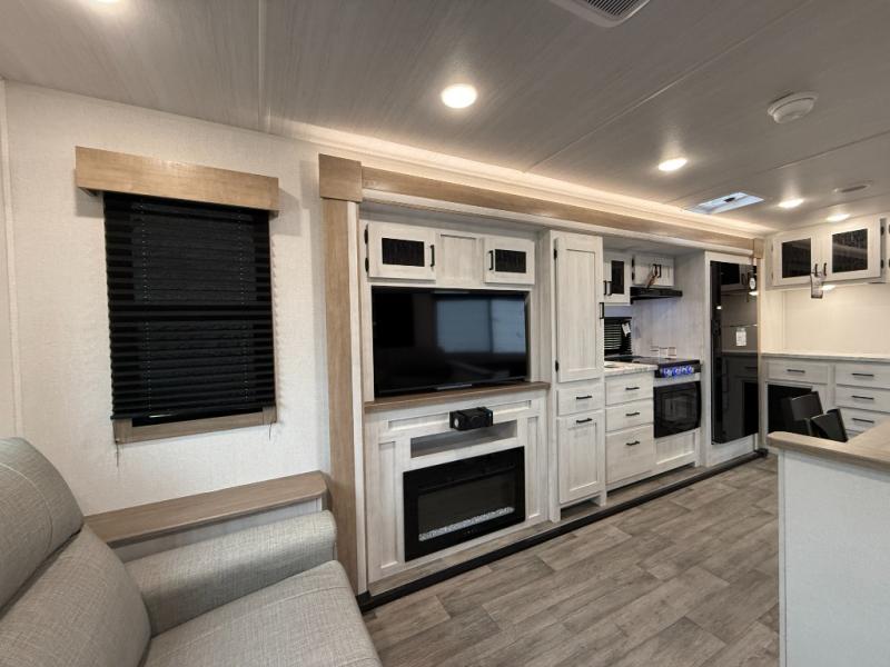 You won't believe the comfort that is found in this travel trailer! The rear living area will be a favorite place to relax with its large L-shaped sofa and fireplace, and the large slide out here will give the chef plenty of space to prepare meals in the kitchen. A 48" dinette with bench seating on one side and two chairs on the other provide a place to dine together, or you may just find yourselves eating outdoors under the 21' patio awning. There is also storage under the dinette, a large countertop with a sink, plus a kitchen pantry to keep snacks stocked. The front of this unit includes the master bedroom, complete with a queen bed, dual nightstands, and a second slide out with the bedroom wardrobe and bath linen closet!