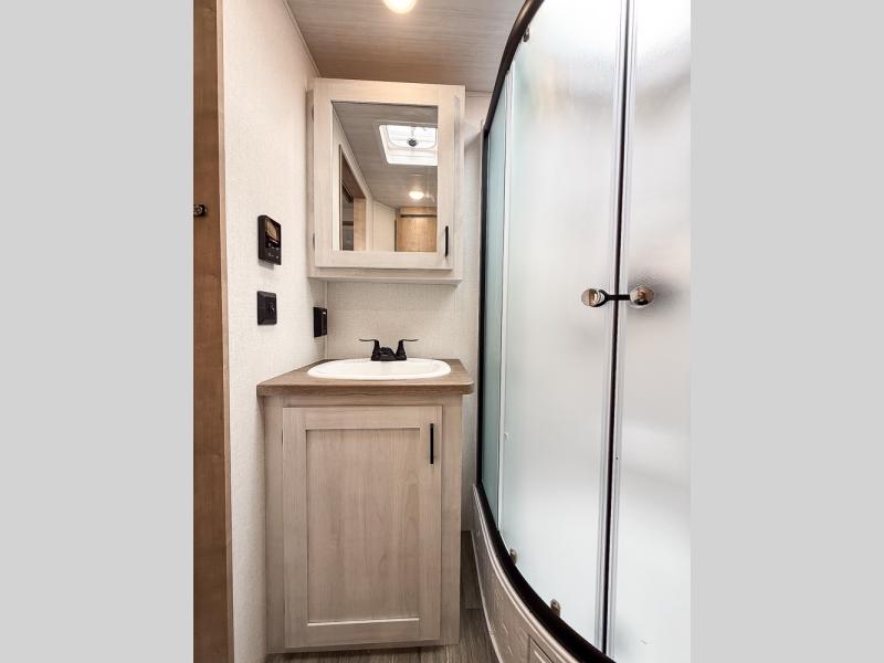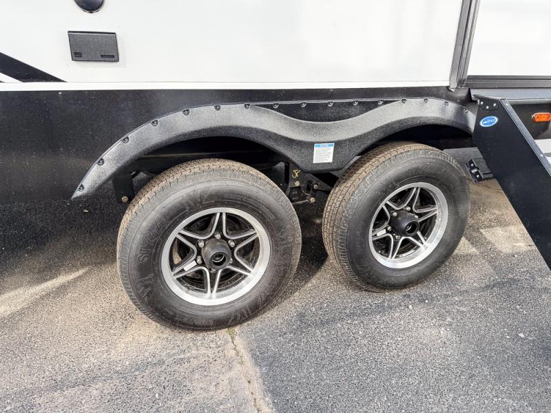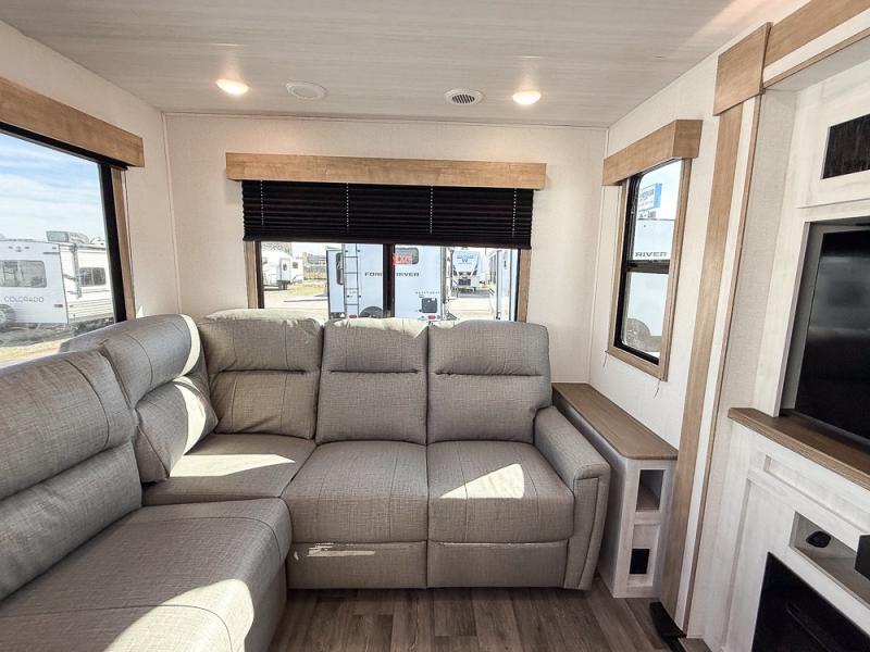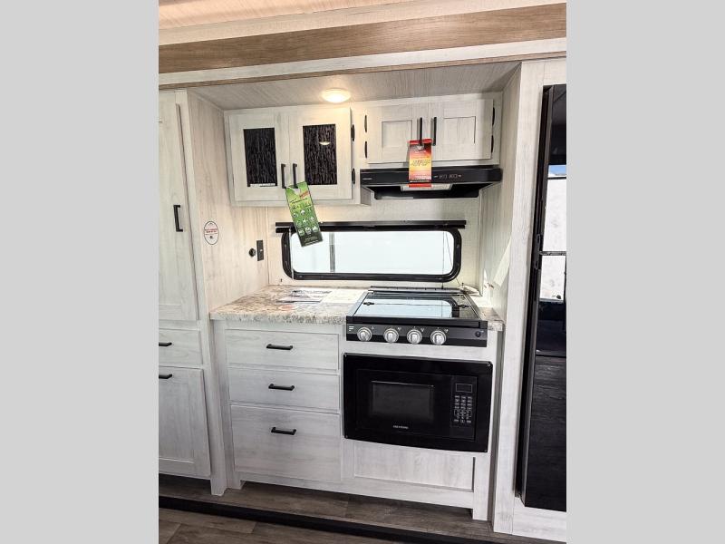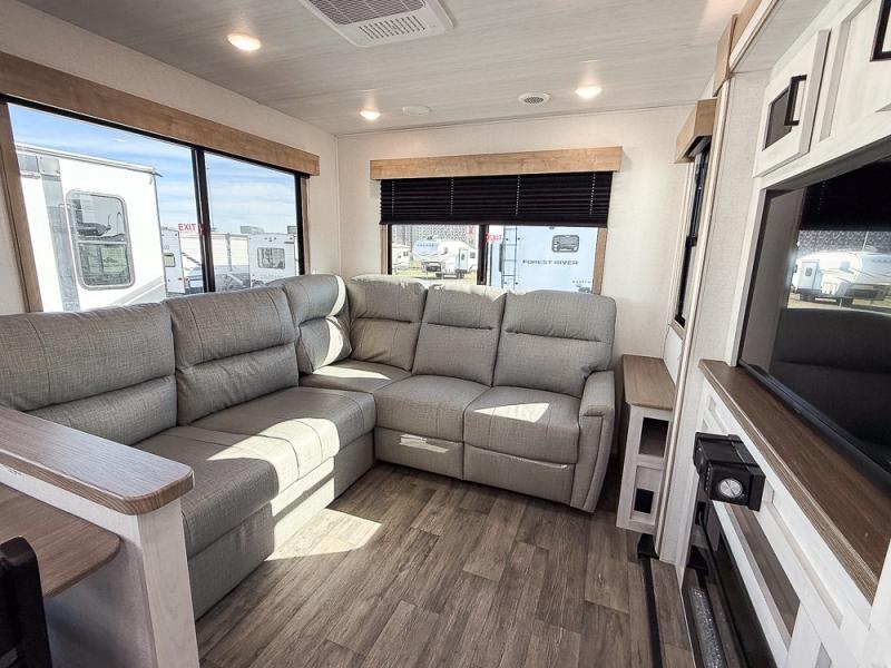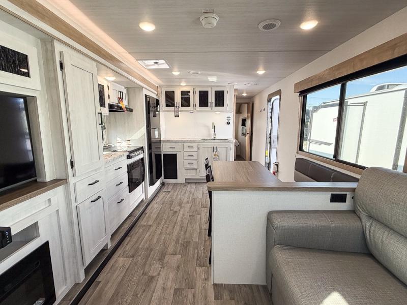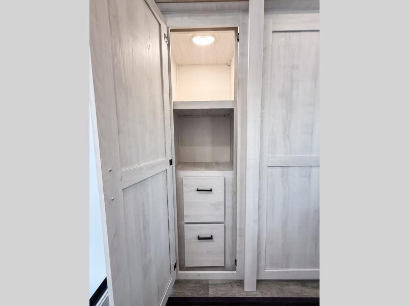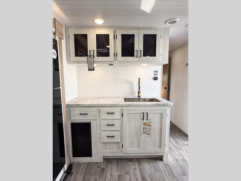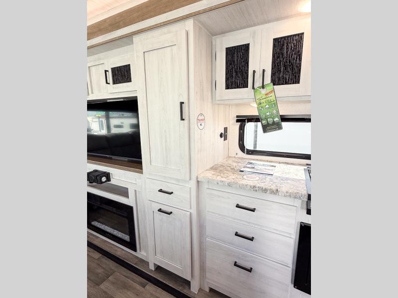 You won't believe the comfort that is found in this travel trailer! The rear living area will be a favorite place to relax with its large L-shaped sofa and fireplace, and the large slide out here will give the chef plenty of space to prepare meals in the kitchen. A 48" dinette with bench seating on one side and two chairs on the other provide a place to dine together, or you may just find yourselves eating outdoors under the 21' patio awning. There is also storage under the dinette, a large countertop with a sink, plus a kitchen pantry to keep snacks stocked. The front of this unit includes the master bedroom, complete with a queen bed, dual nightstands, and a second slide out with the bedroom wardrobe and bath linen closet!
