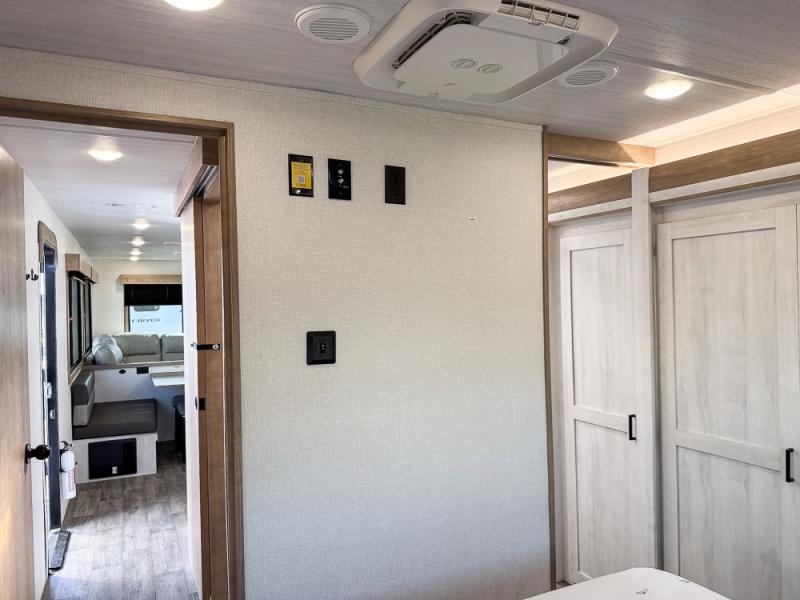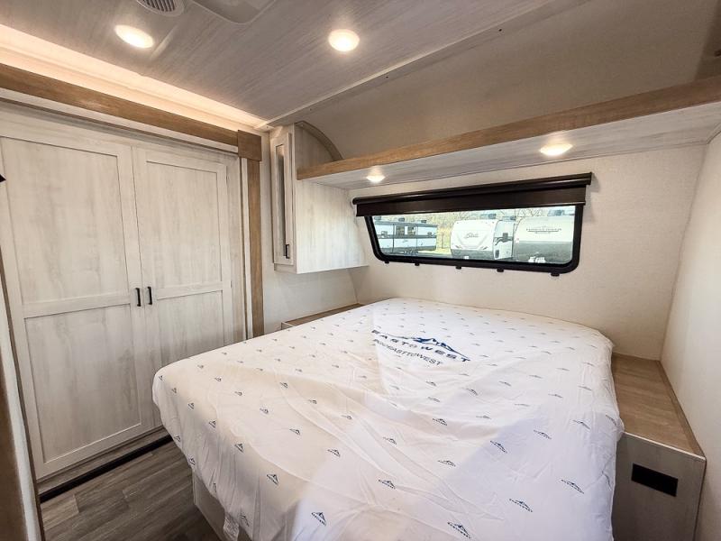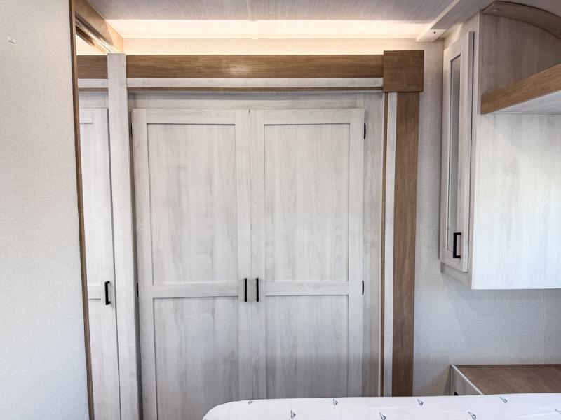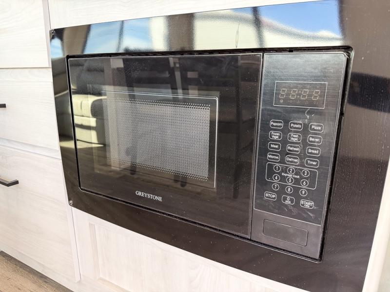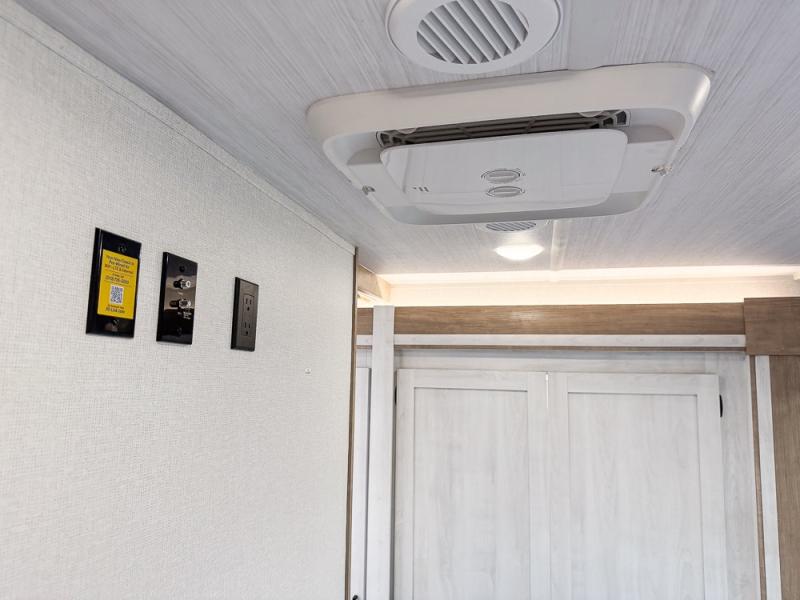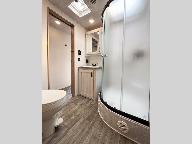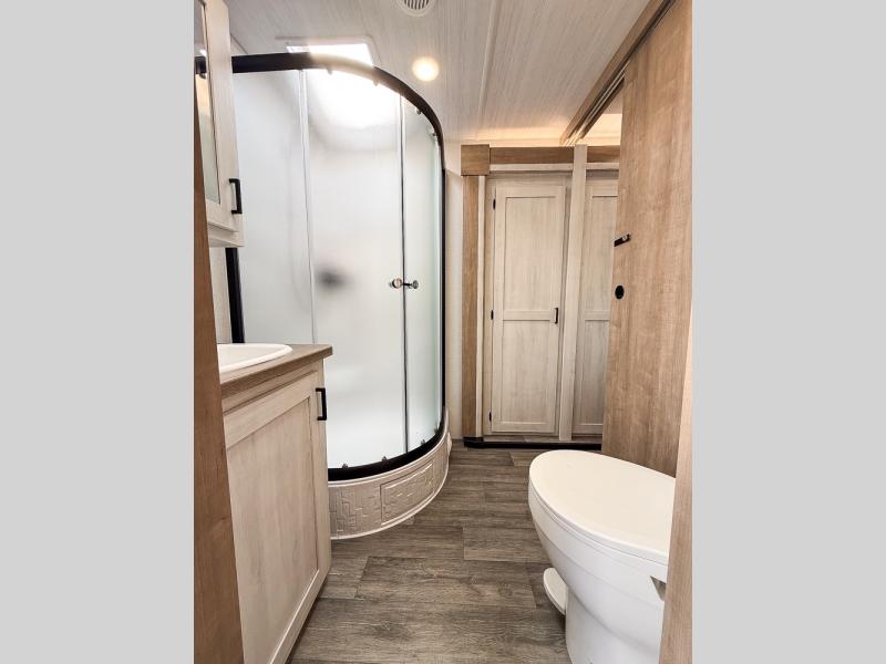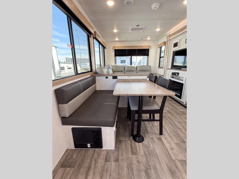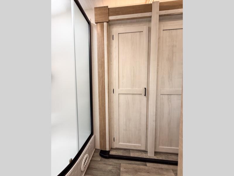 You won't believe the comfort that is found in this travel trailer! The rear living area will be a favorite place to relax with its large L-shaped sofa and fireplace, and the large slide out here will give the chef plenty of space to prepare meals in the kitchen. A 48" dinette with bench seating on one side and two chairs on the other provide a place to dine together, or you may just find yourselves eating outdoors under the 21' patio awning. There is also storage under the dinette, a large countertop with a sink, plus a kitchen pantry to keep snacks stocked. The front of this unit includes the master bedroom, complete with a queen bed, dual nightstands, and a second slide out with the bedroom wardrobe and bath linen closet!