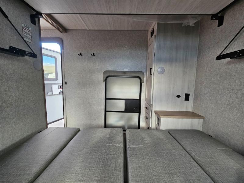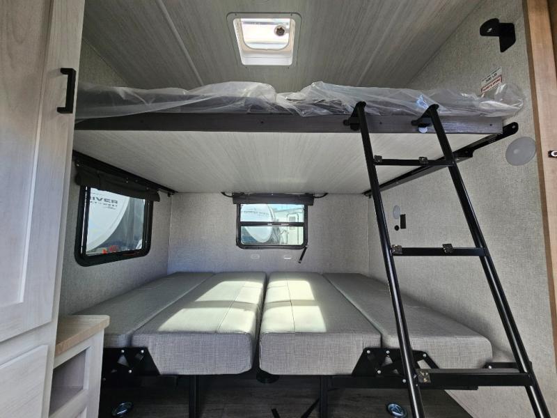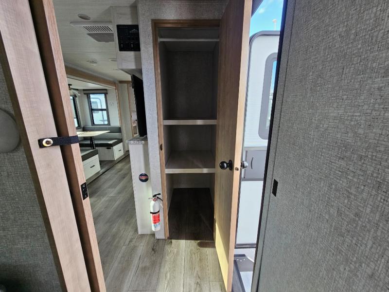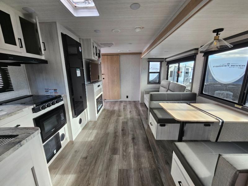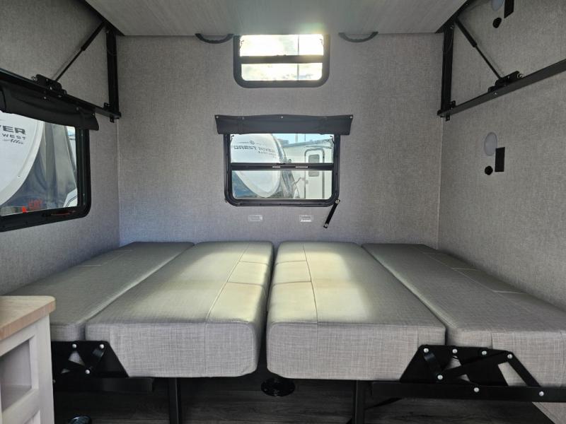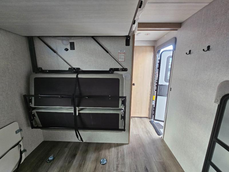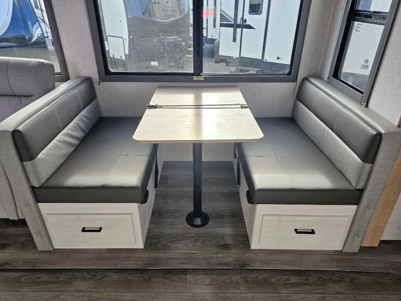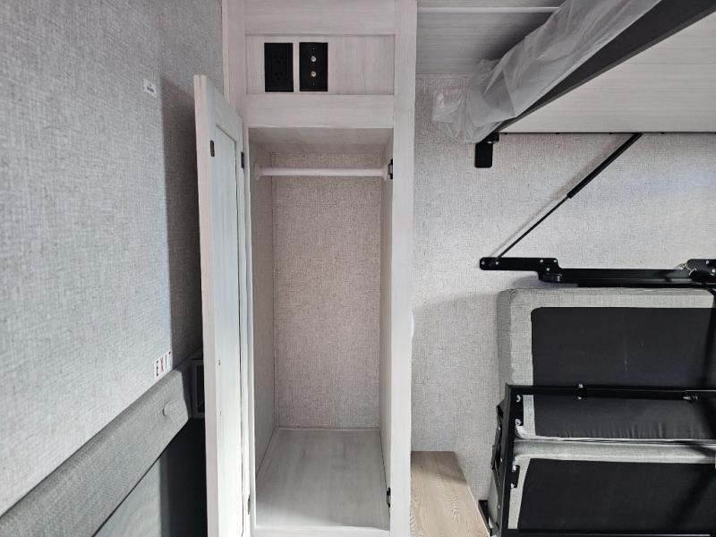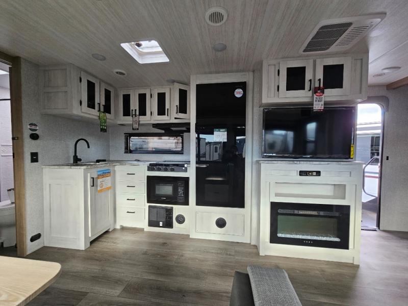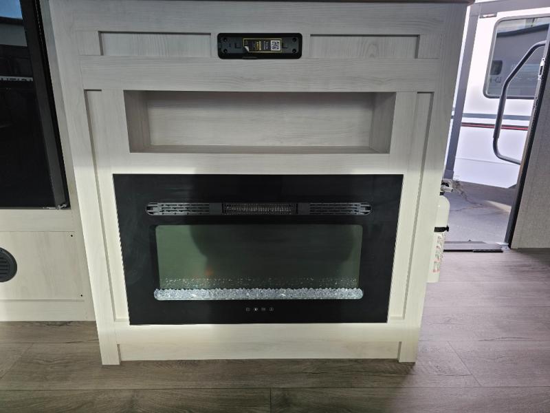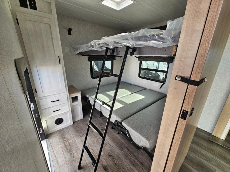 You won't want to pass up this spacious travel trailer that can sleep eight people thanks to the rear bunkhouse! Here, you'll find two flip-up sofas with a stowable bunk system, an end table and wardrobe, plus a bike door for easy access to camp gear. The owners will love the front master bedroom with its queen bed, dual wardrobes and overhead cabinets for their things. Everyone can meet in the combined kitchen and living room to relax on the sofa or booth dinette. The fireplace will make this space feel more like home, and the full kitchen will let you cook your favorite meals!