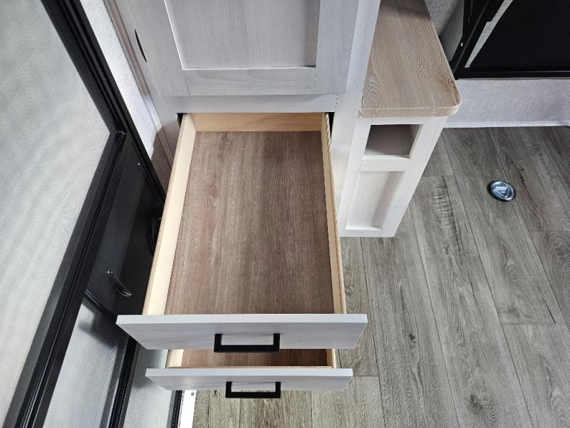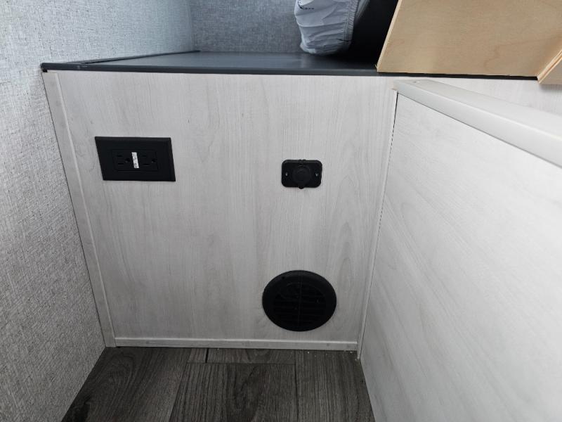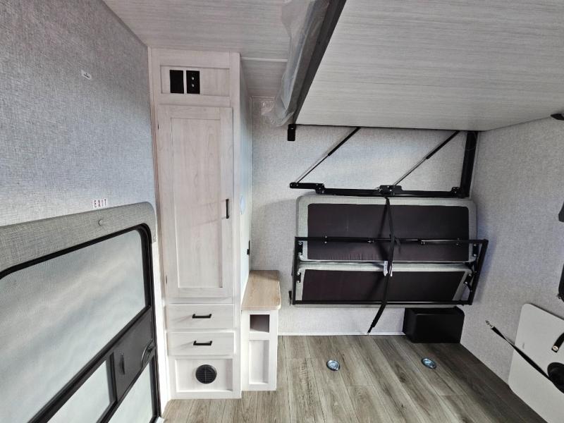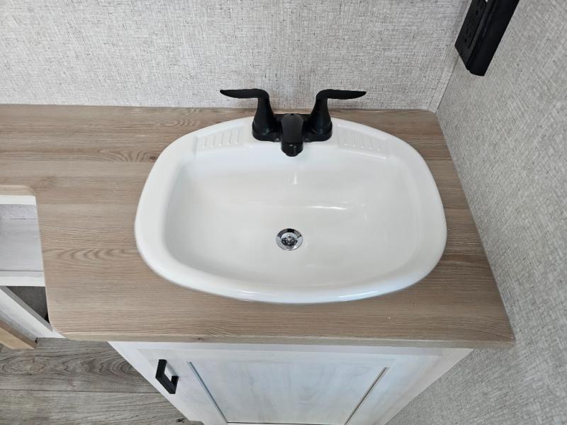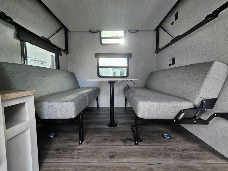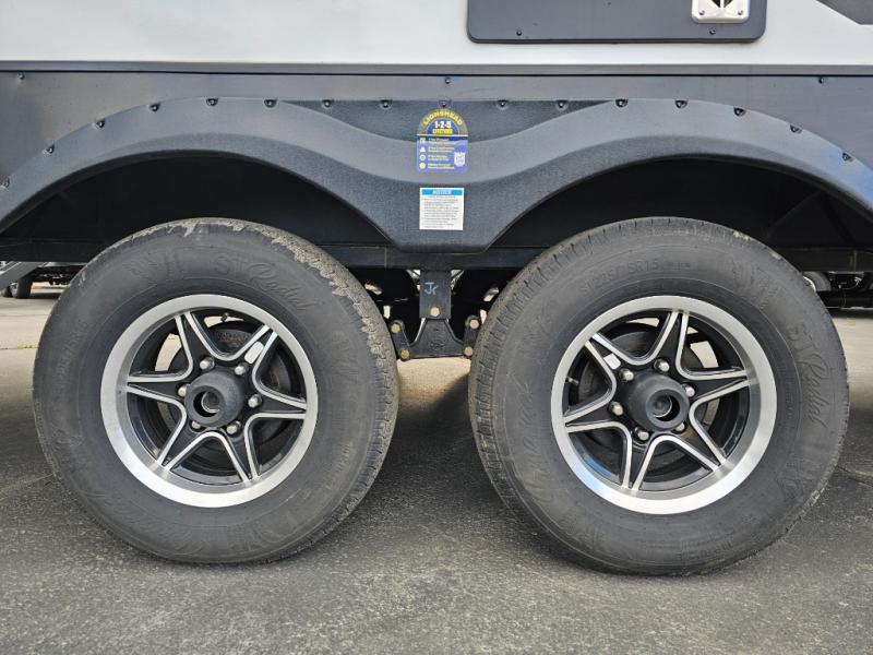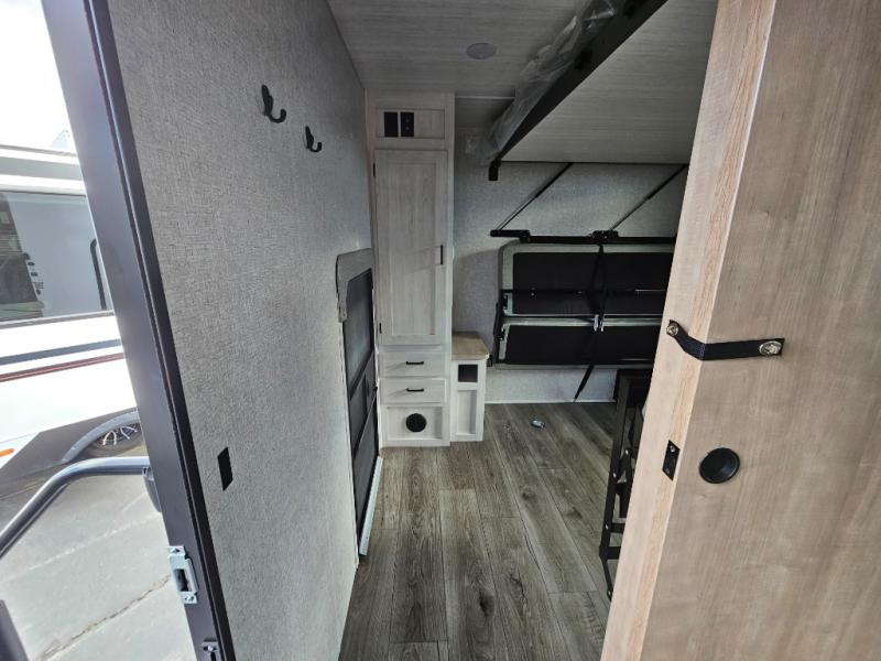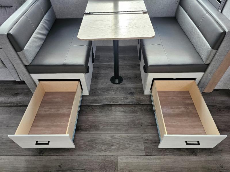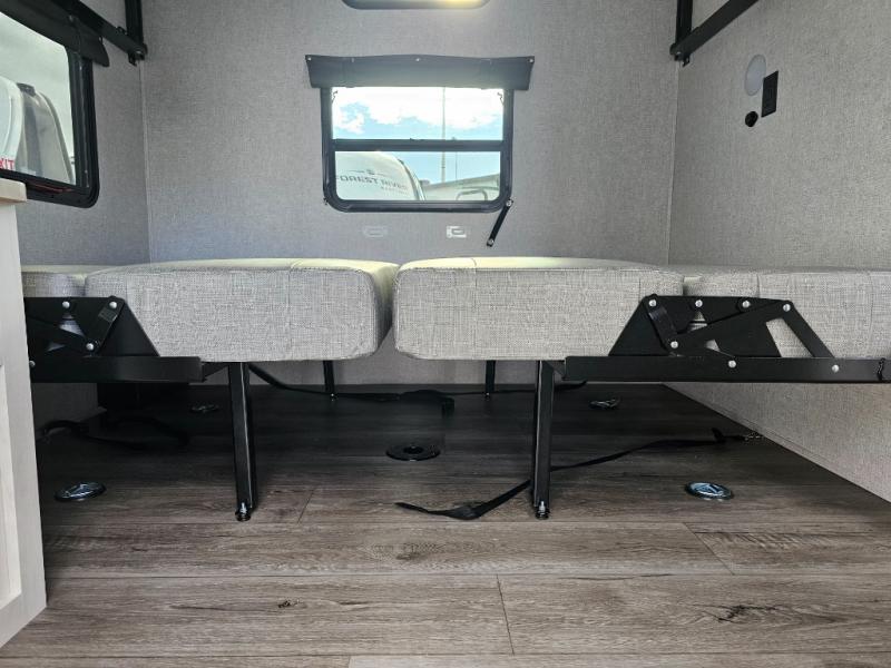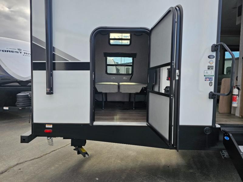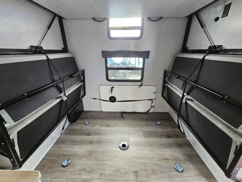 You won't want to pass up this spacious travel trailer that can sleep eight people thanks to the rear bunkhouse! Here, you'll find two flip-up sofas with a stowable bunk system, an end table and wardrobe, plus a bike door for easy access to camp gear. The owners will love the front master bedroom with its queen bed, dual wardrobes and overhead cabinets for their things. Everyone can meet in the combined kitchen and living room to relax on the sofa or booth dinette. The fireplace will make this space feel more like home, and the full kitchen will let you cook your favorite meals!
