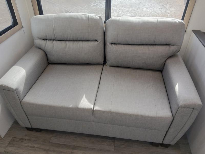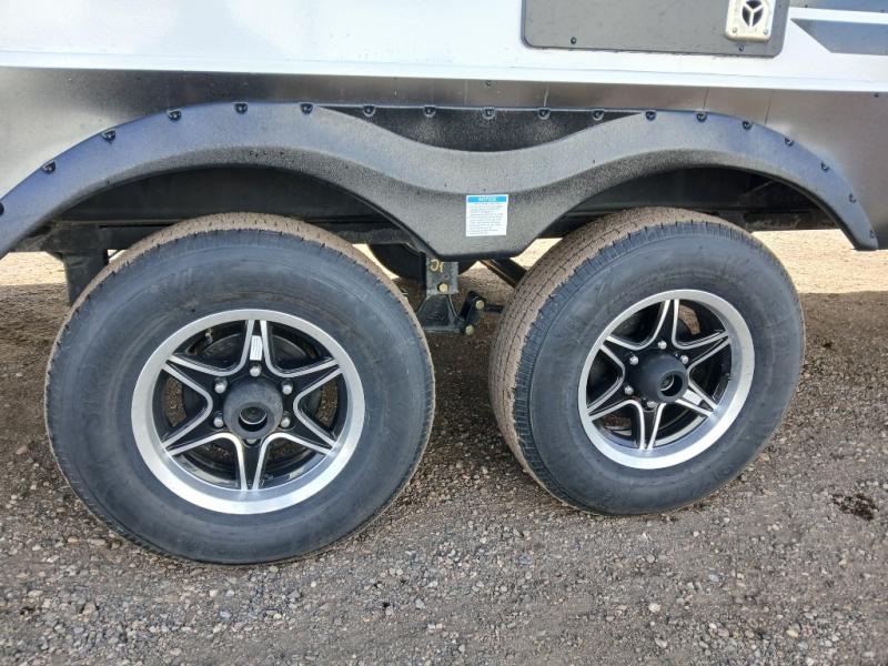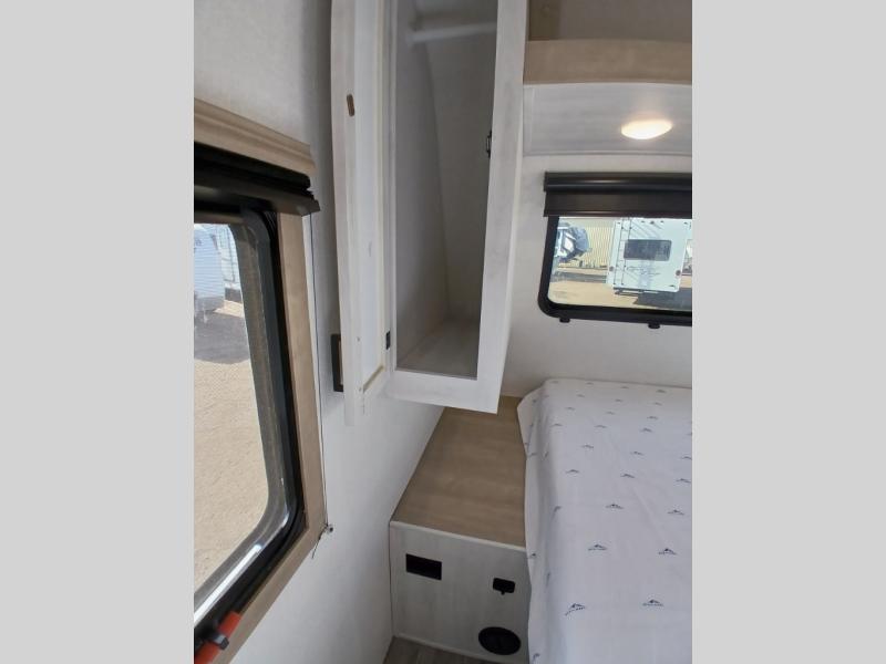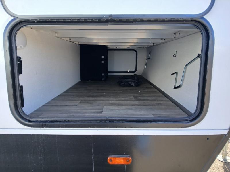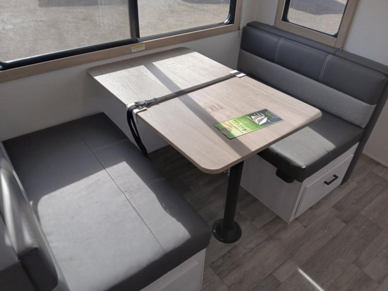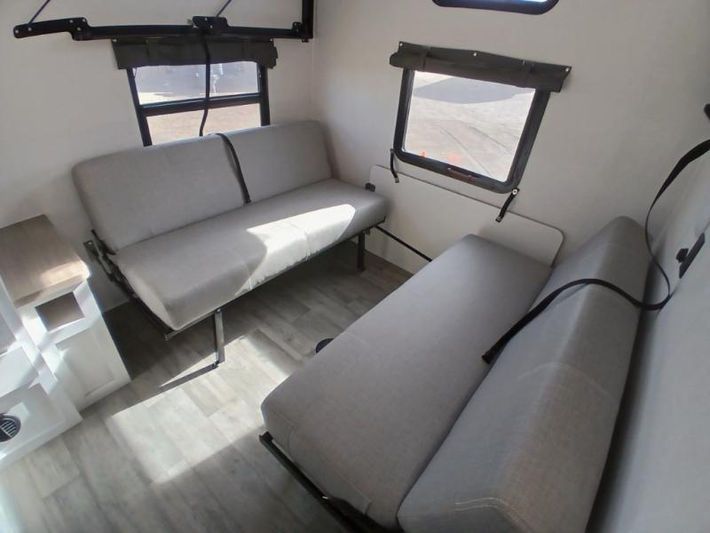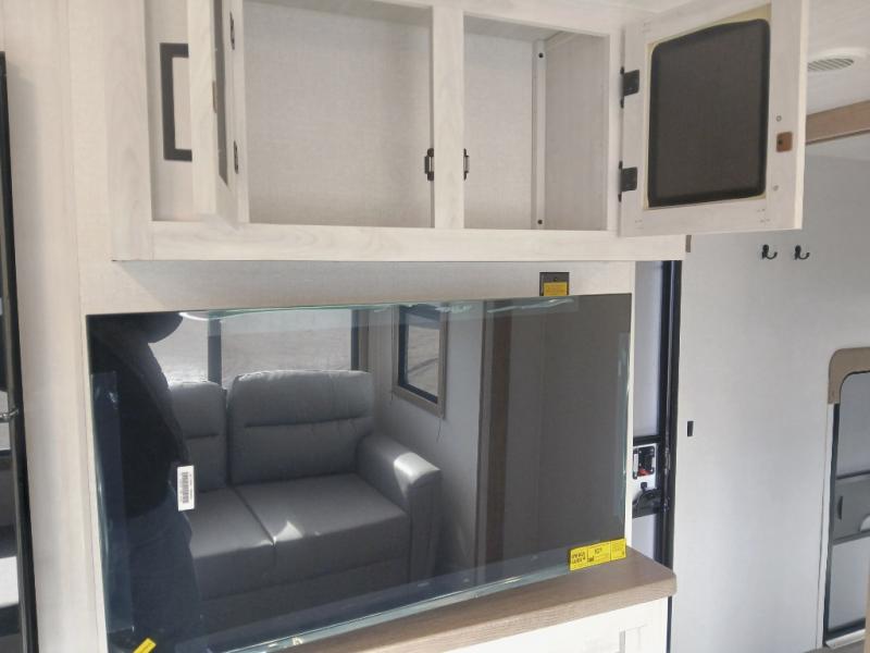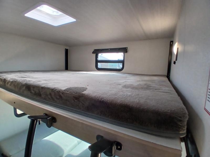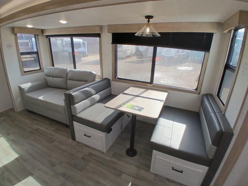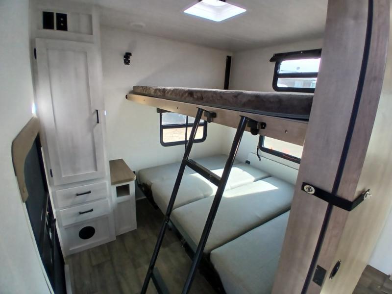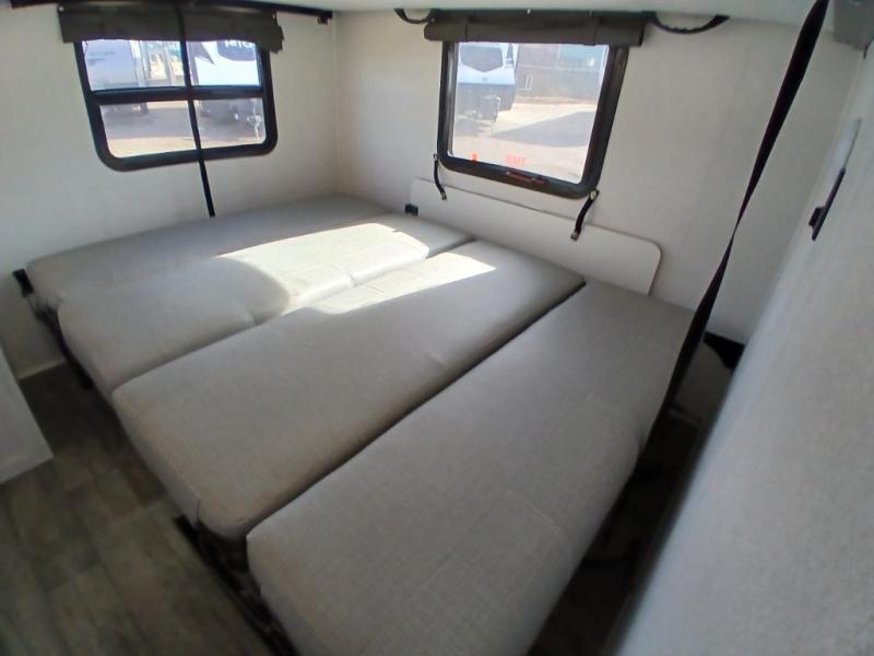 You won't want to pass up this spacious travel trailer that can sleep eight people thanks to the rear bunkhouse! Here, you'll find two flip-up sofas with a stowable bunk system, an end table and wardrobe, plus a bike door for easy access to camp gear. The owners will love the front master bedroom with its queen bed, dual wardrobes and overhead cabinets for their things. Everyone can meet in the combined kitchen and living room to relax on the sofa or booth dinette. The fireplace will make this space feel more like home, and the full kitchen will let you cook your favorite meals!