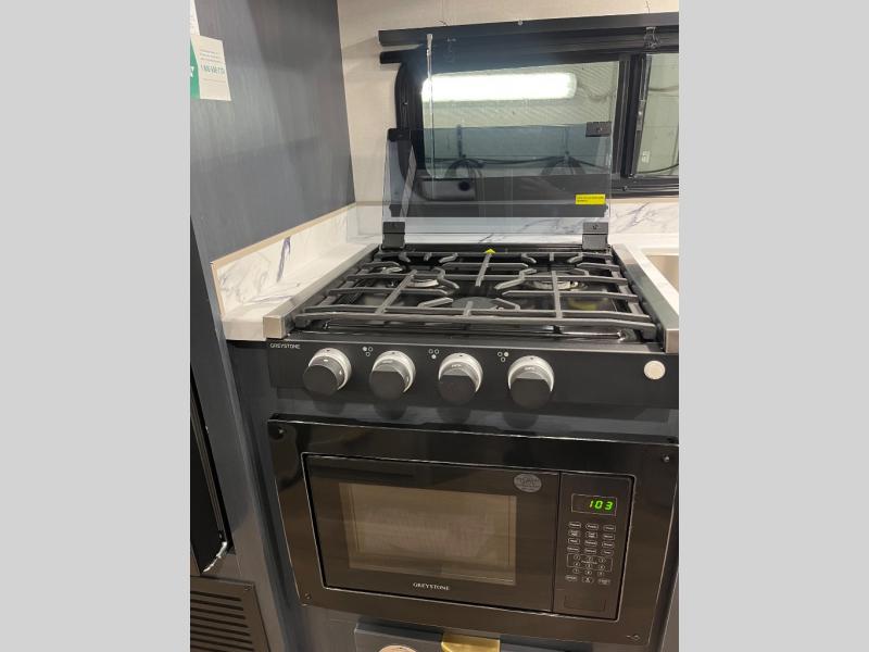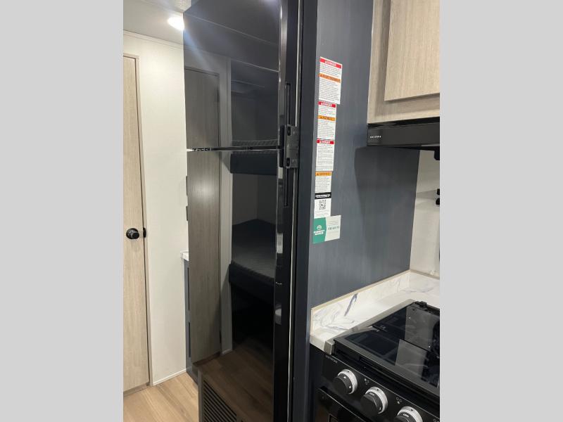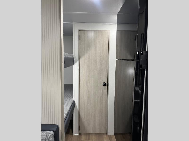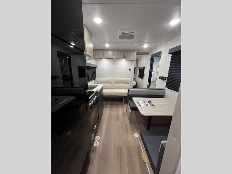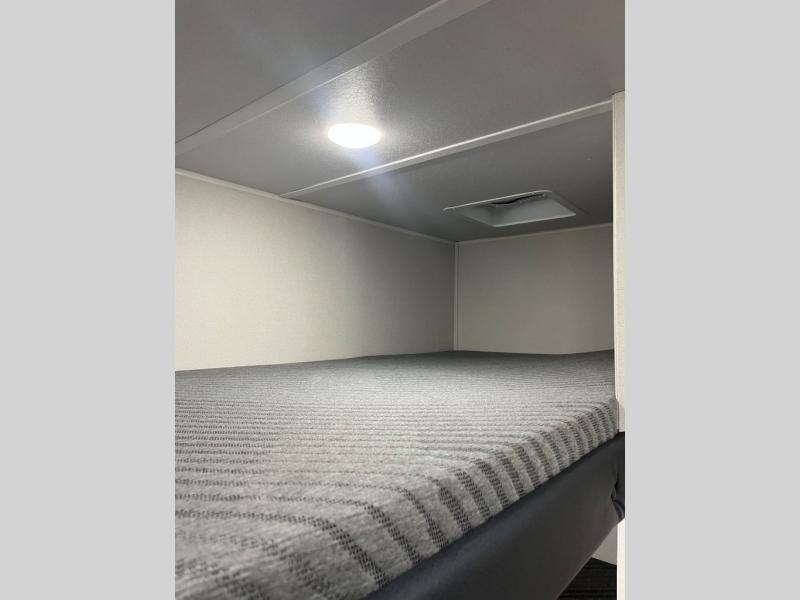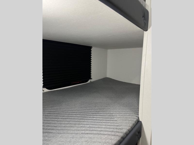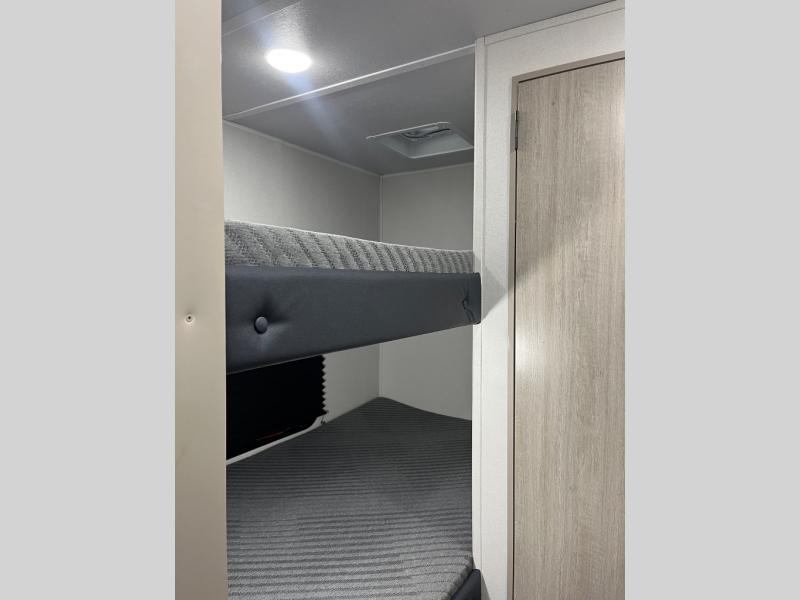 Your crew will love spending time in this travel trailer! Once you've unloaded the pass-through storage, you can put out the 14' power awning and relax. The three burner cooktop and microwave oven inside will let you make lunch for everyone, and there is a booth dinette to dine at. A private front bedroom includes a comfy king-size bed for a great night's rest, plus dual wardrobes and nightstands to keep your things tidy. Your guests can sleep on the living area furniture, along with the bunk beds in the back. There is also a private bath with a 24" x 40" shower and toilet, with the sink just outside the door!
