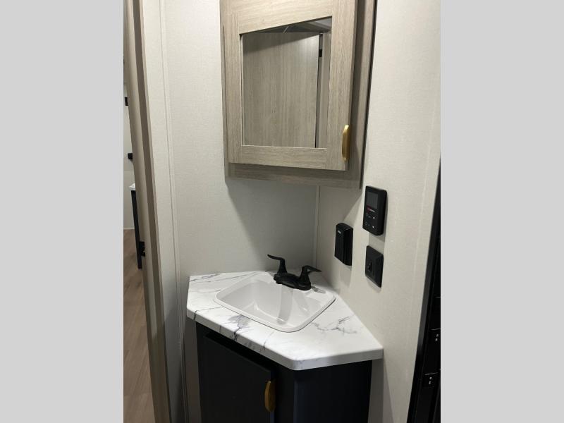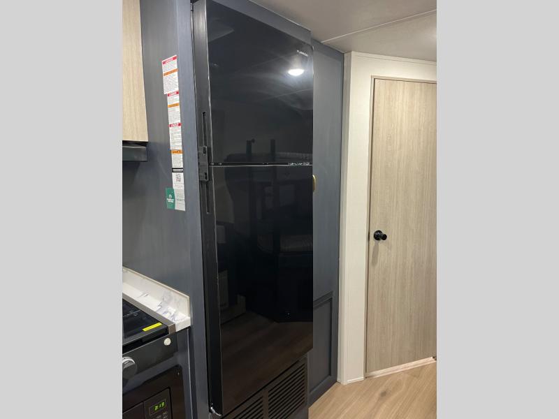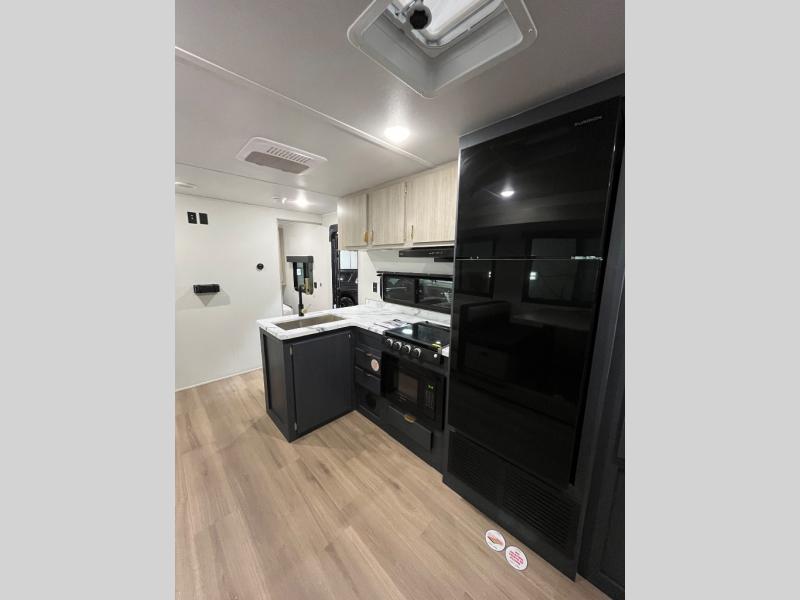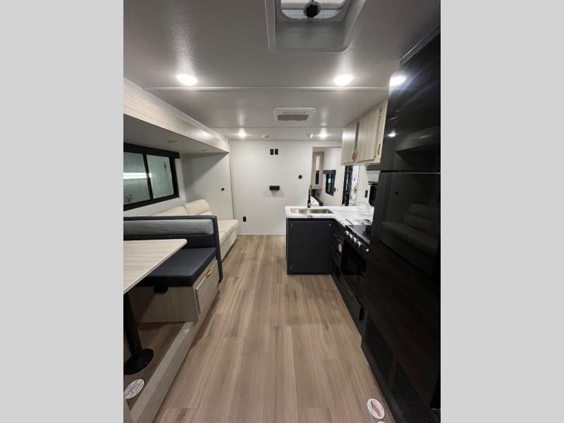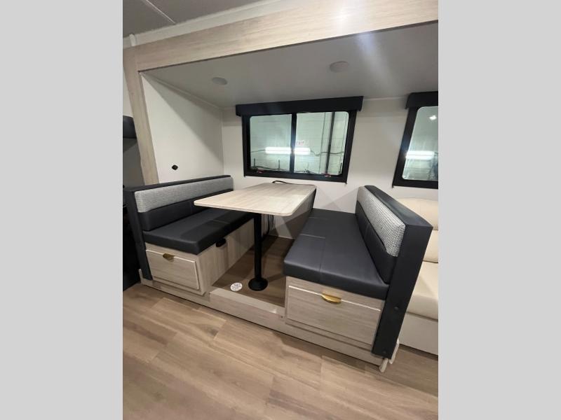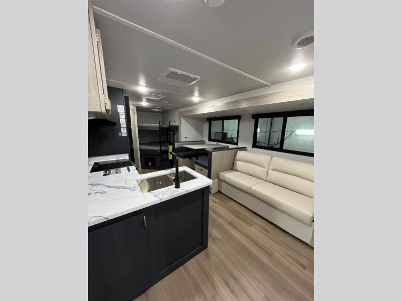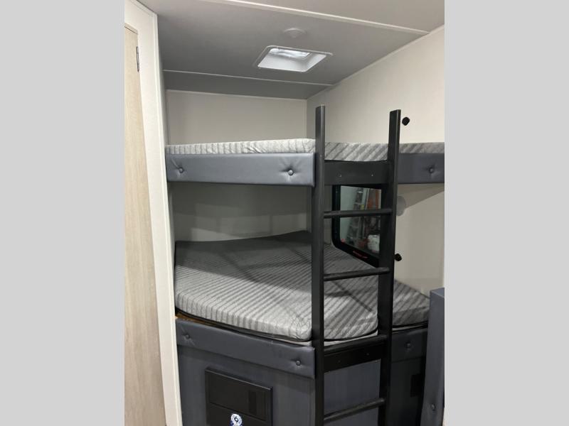 You'll love the amount of space you have in this dual entry travel trailer thanks to the large slide out. You'll find the booth dinette and jack knife sofa here, and the full kitchen is in the same room for an open floorplan. Just like at home, you'll enjoy a private bedroom, complete with a king-size bed and generous storage space. Your guests or little ones will love the double-size bunks with a ladder, and the full bath with its own exterior entry door is right next to the bunks for easy access!