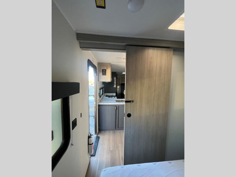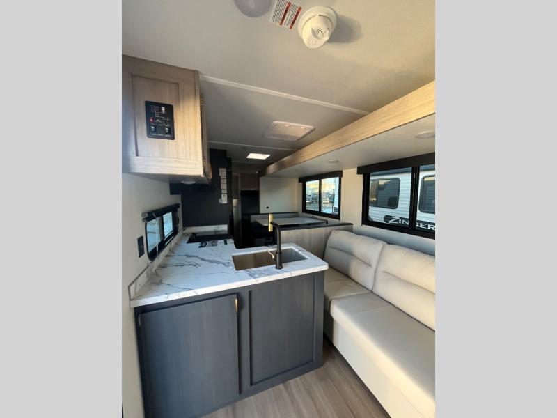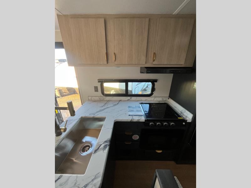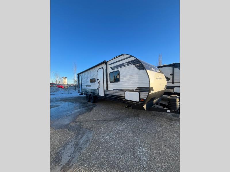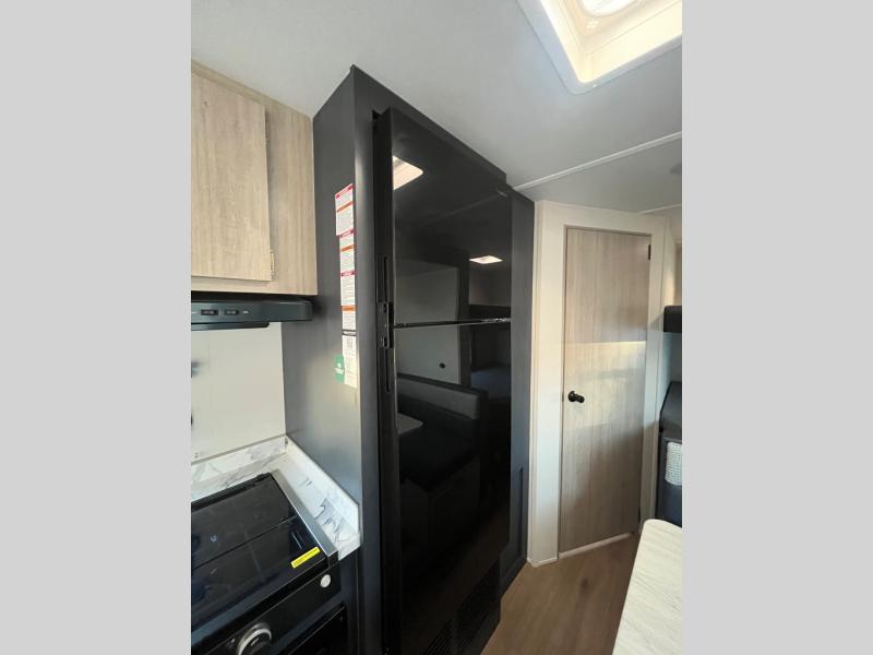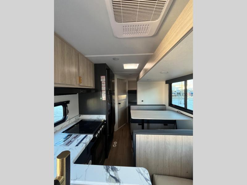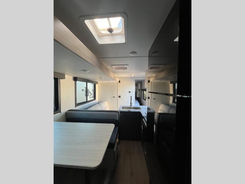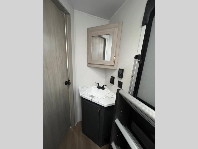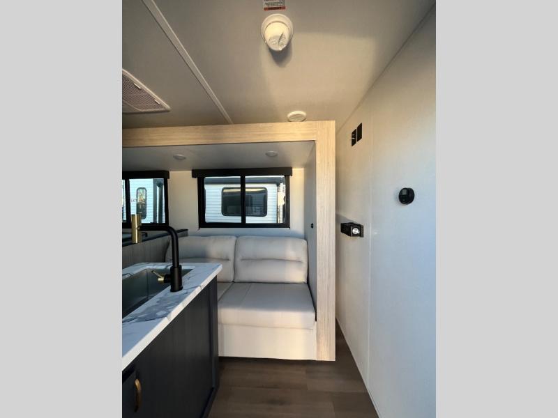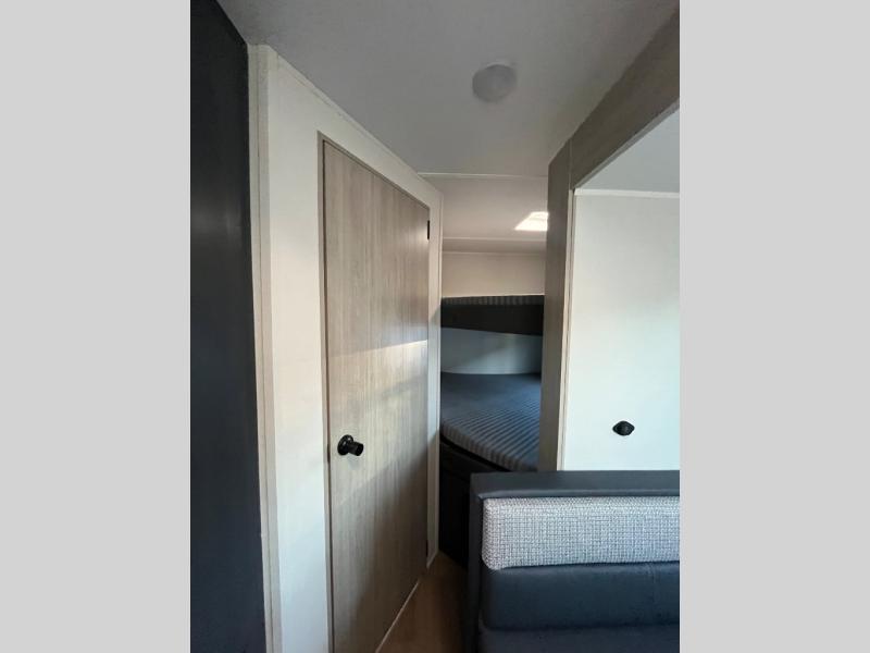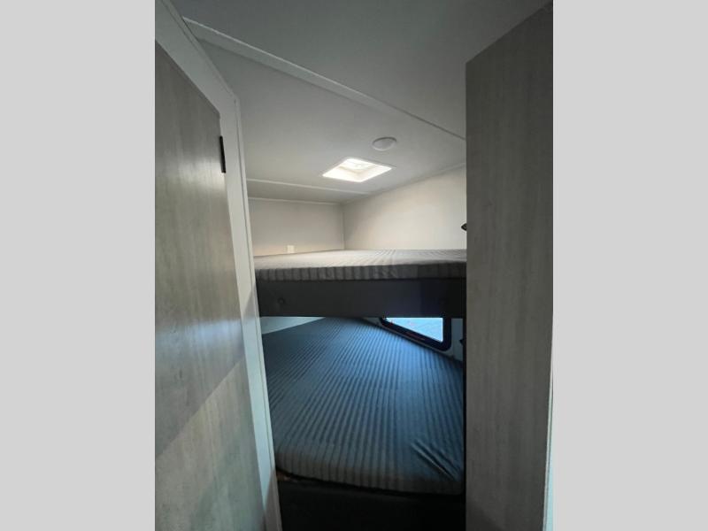 You'll love the amount of space you have in this dual entry travel trailer thanks to the large slide out. You'll find the booth dinette and jack knife sofa here, and the full kitchen is in the same room for an open floorplan. Just like at home, you'll enjoy a private bedroom, complete with a king-size bed and generous storage space. Your guests or little ones will love the double-size bunks with a ladder, and the full bath with its own exterior entry door is right next to the bunks for easy access!