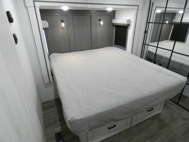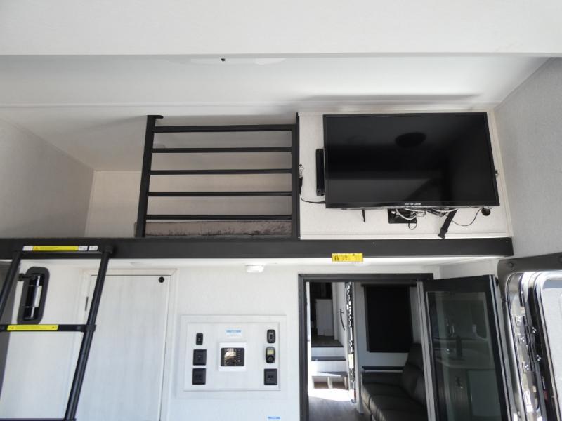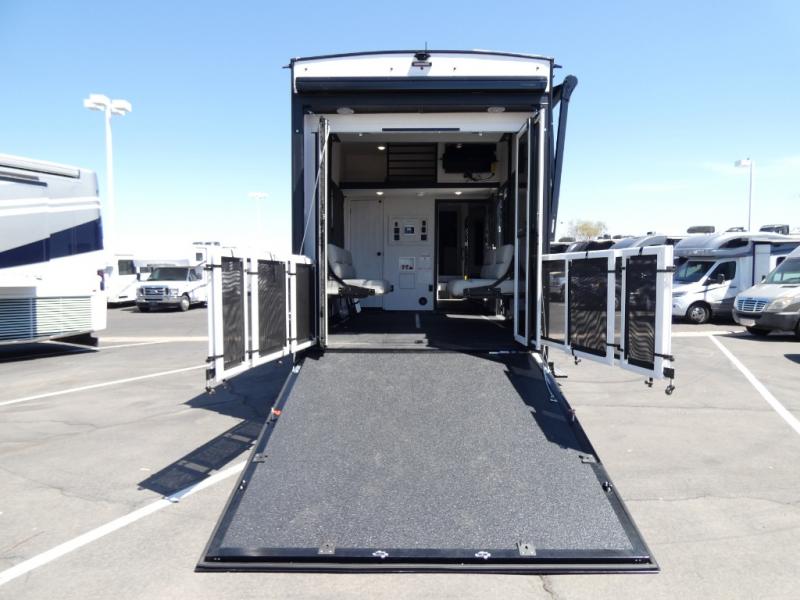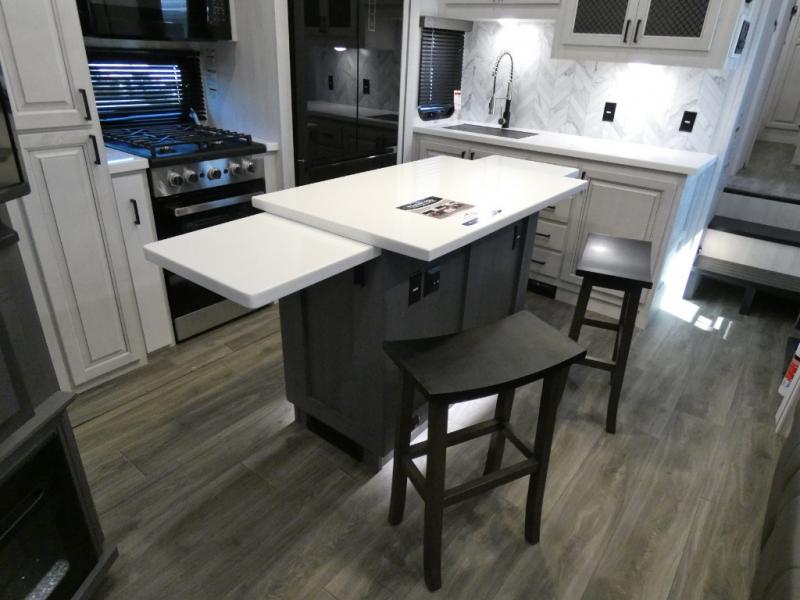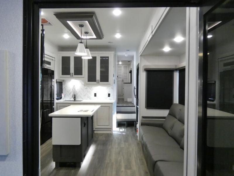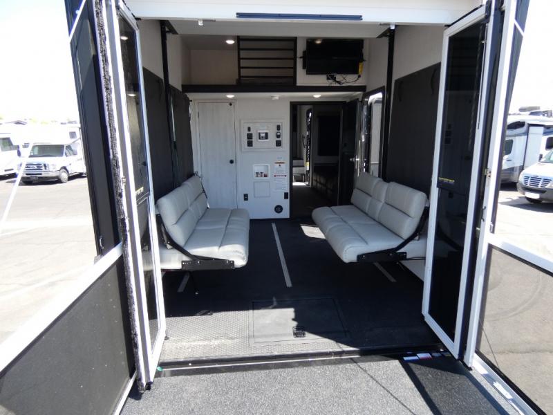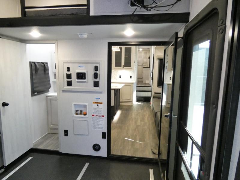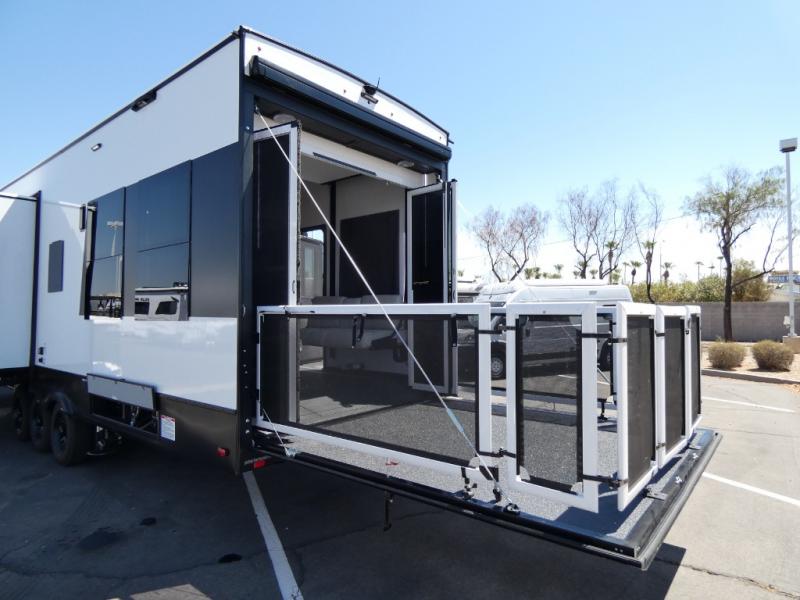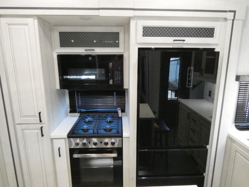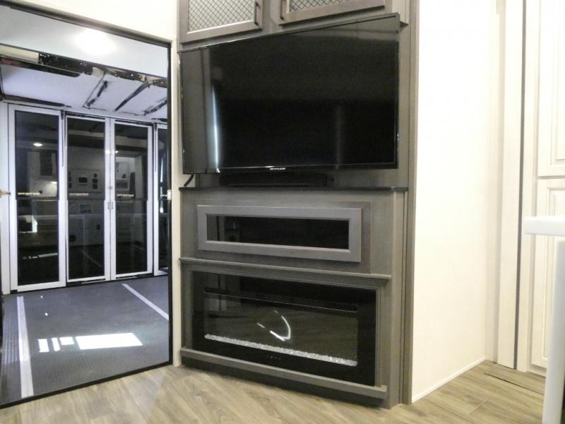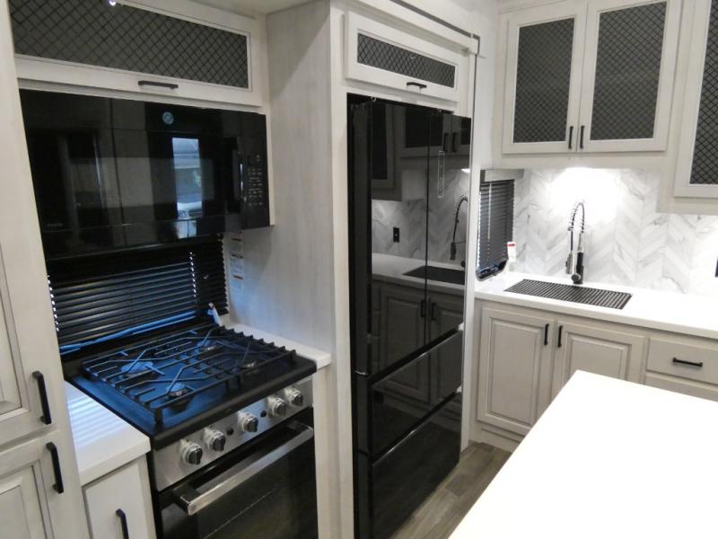 Your friends and family will be begging you to take them with you camping in this feature-packed fifth wheel! Once your toys are unloaded from the separate garage, you can enjoy the 3-seasons door with tinted sliding windows and the rear deck system with an awning and steps. Your guests can sleep here at night since there is a drop-down queen bed, two happijac sofas, plus a loft with a ladder and a 28" x 70" mat. There is even a half bath here for convenience! The main living area will be a favorite place to visit together with its large sofa, 50" TV with a fireplace, and spacious kitchen island with two stools and countertop extensions. The chef of your group will also love the additional counter space and deep-seated stainless steel farmhouse sink, the GE Profile free-standing gas range and convection microwave/air fryer, plus the 16 cu. ft. 12V French door refrigerator with a double drawer freezer. Everyone can take turns cleaning up in the full bath towards the front, and you are sure to enjoy the front private bedroom all to yourselves. Here, you'll find a king bed slide out with bedside shelves and underbed storage, a dresser with a 32" TV, plus a front wardrobe and a wardrobe with washer/dryer prep!