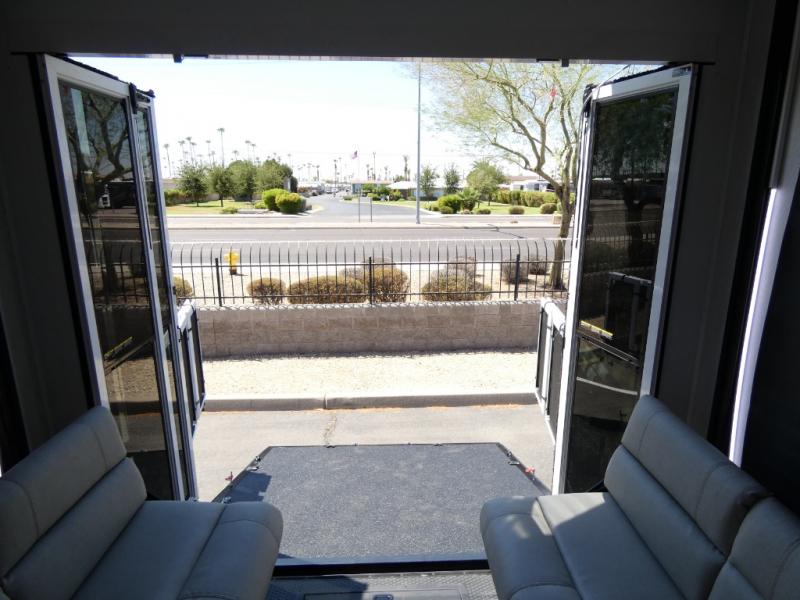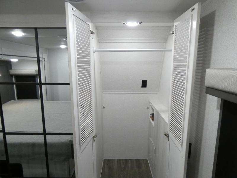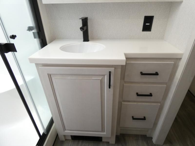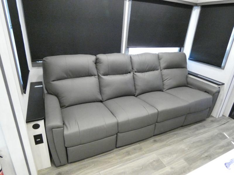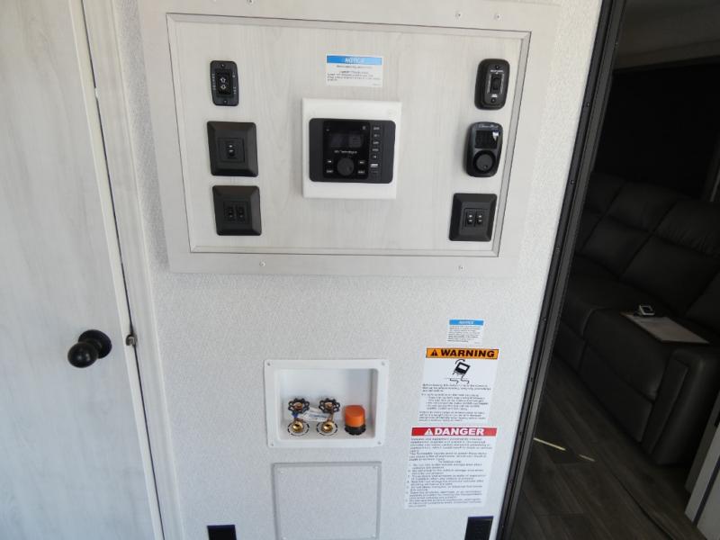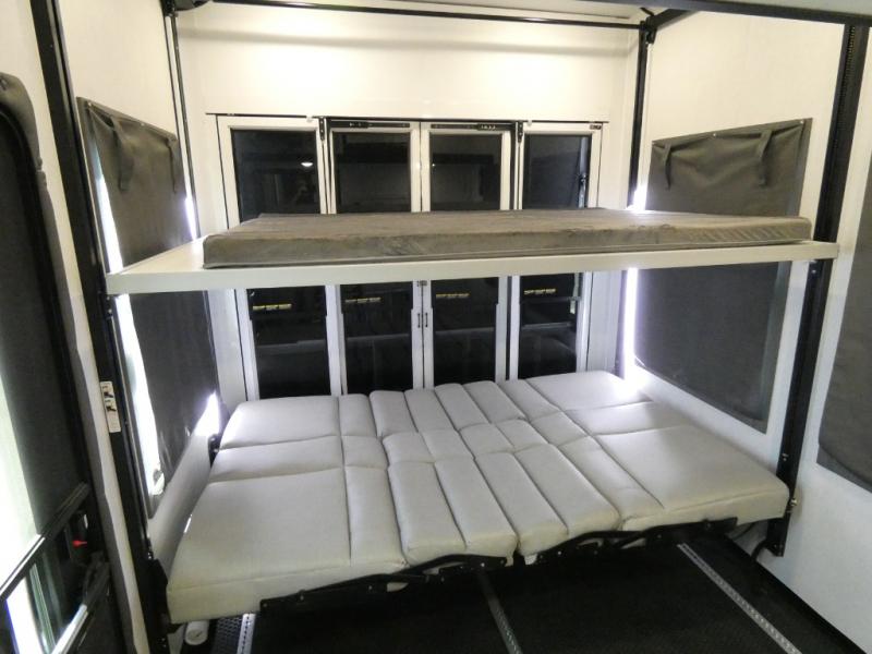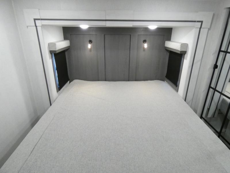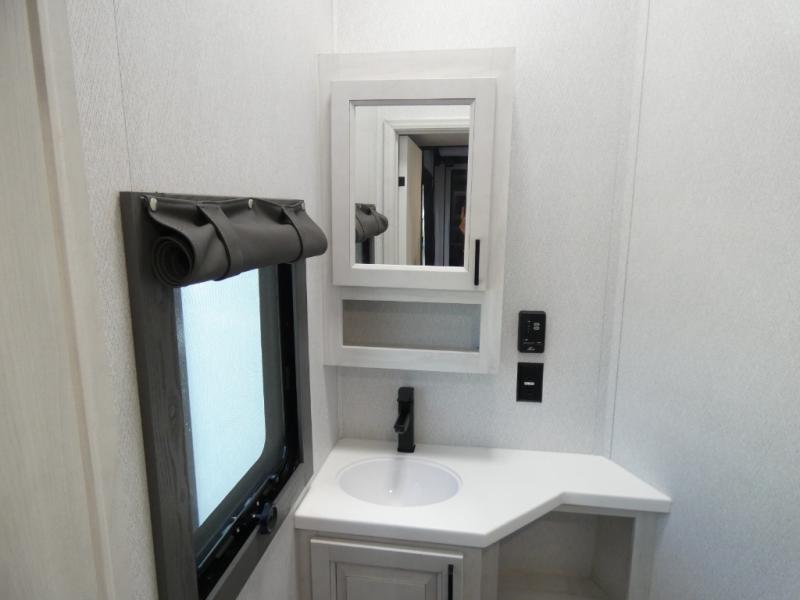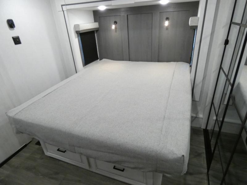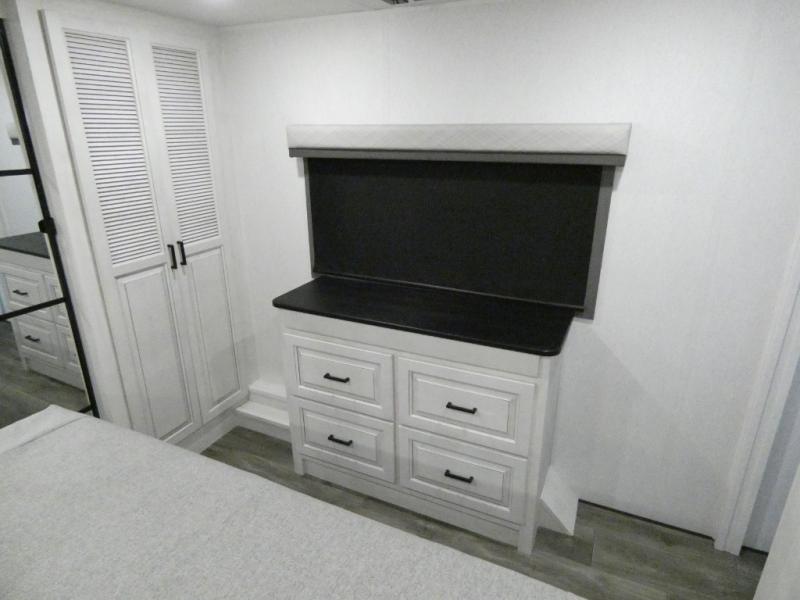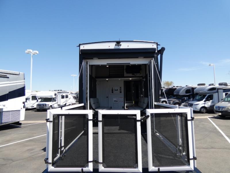 Your friends and family will be begging you to take them with you camping in this feature-packed fifth wheel! Once your toys are unloaded from the separate garage, you can enjoy the 3-seasons door with tinted sliding windows and the rear deck system with an awning and steps. Your guests can sleep here at night since there is a drop-down queen bed, two happijac sofas, plus a loft with a ladder and a 28" x 70" mat. There is even a half bath here for convenience! The main living area will be a favorite place to visit together with its large sofa, 50" TV with a fireplace, and spacious kitchen island with two stools and countertop extensions. The chef of your group will also love the additional counter space and deep-seated stainless steel farmhouse sink, the GE Profile free-standing gas range and convection microwave/air fryer, plus the 16 cu. ft. 12V French door refrigerator with a double drawer freezer. Everyone can take turns cleaning up in the full bath towards the front, and you are sure to enjoy the front private bedroom all to yourselves. Here, you'll find a king bed slide out with bedside shelves and underbed storage, a dresser with a 32" TV, plus a front wardrobe and a wardrobe with washer/dryer prep!