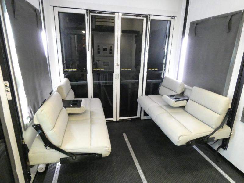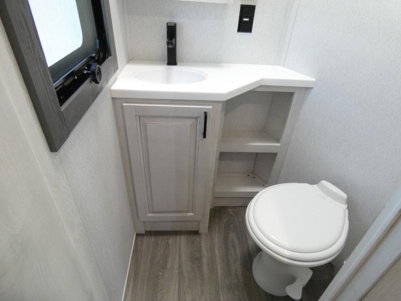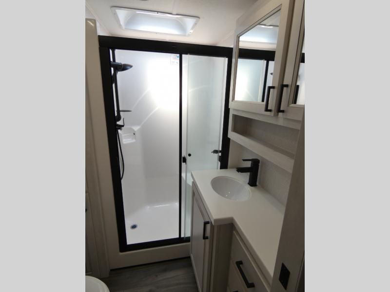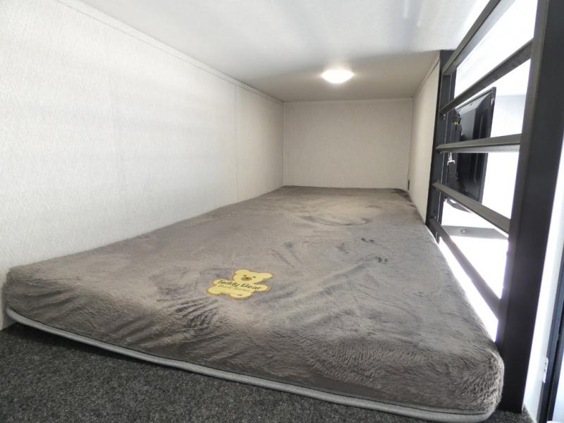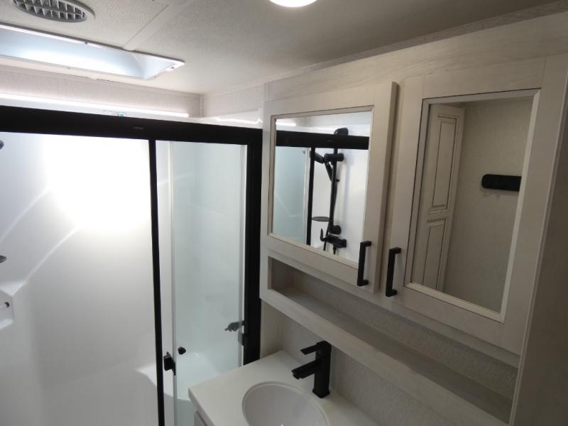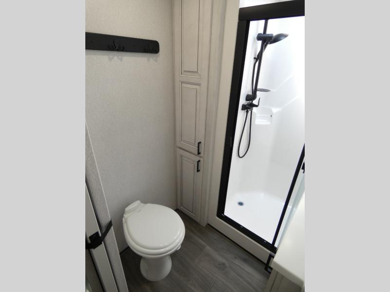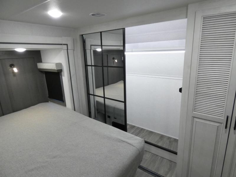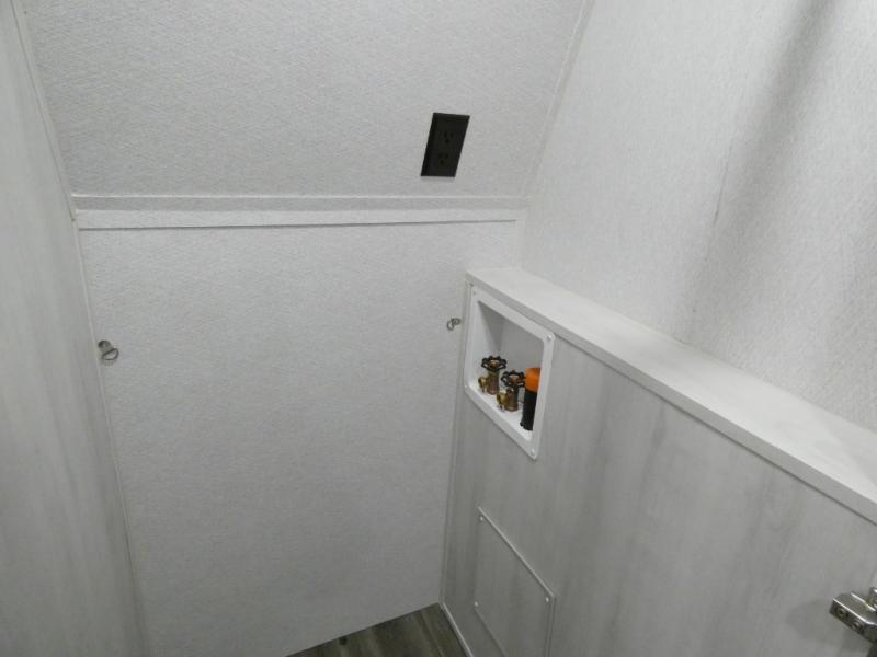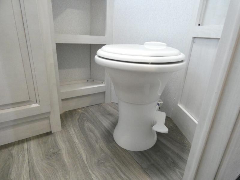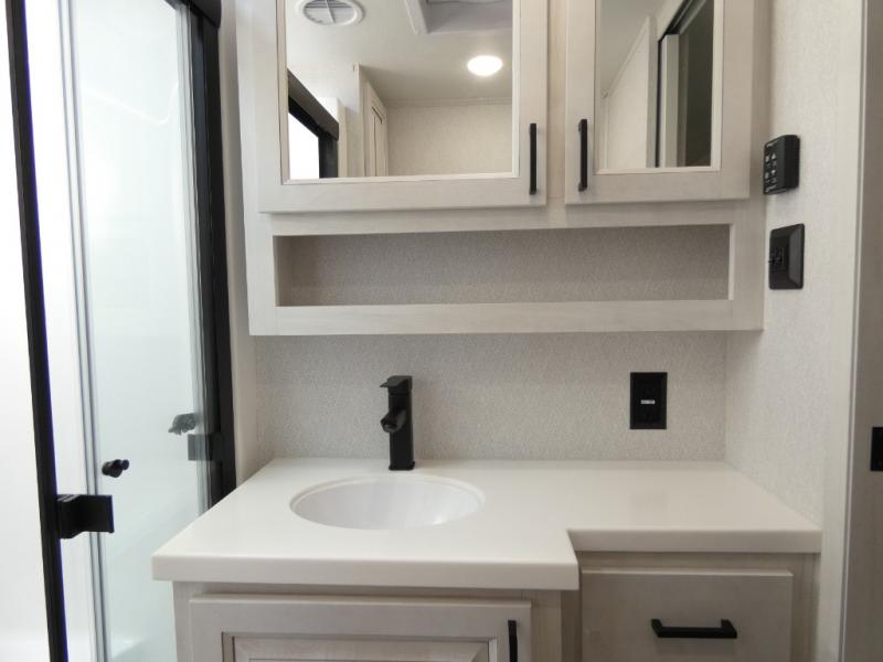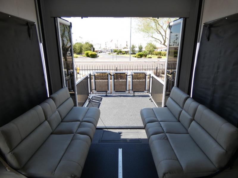 Your friends and family will be begging you to take them with you camping in this feature-packed fifth wheel! Once your toys are unloaded from the separate garage, you can enjoy the 3-seasons door with tinted sliding windows and the rear deck system with an awning and steps. Your guests can sleep here at night since there is a drop-down queen bed, two happijac sofas, plus a loft with a ladder and a 28" x 70" mat. There is even a half bath here for convenience! The main living area will be a favorite place to visit together with its large sofa, 50" TV with a fireplace, and spacious kitchen island with two stools and countertop extensions. The chef of your group will also love the additional counter space and deep-seated stainless steel farmhouse sink, the GE Profile free-standing gas range and convection microwave/air fryer, plus the 16 cu. ft. 12V French door refrigerator with a double drawer freezer. Everyone can take turns cleaning up in the full bath towards the front, and you are sure to enjoy the front private bedroom all to yourselves. Here, you'll find a king bed slide out with bedside shelves and underbed storage, a dresser with a 32" TV, plus a front wardrobe and a wardrobe with washer/dryer prep!