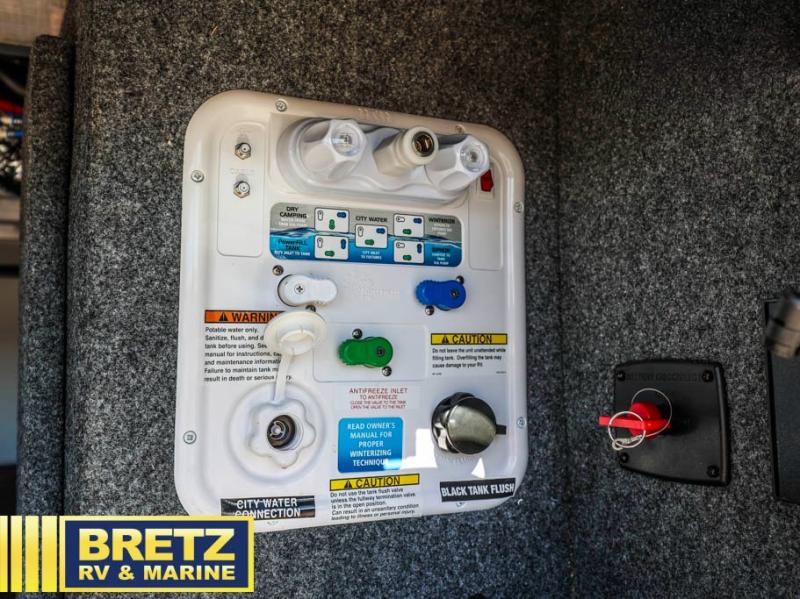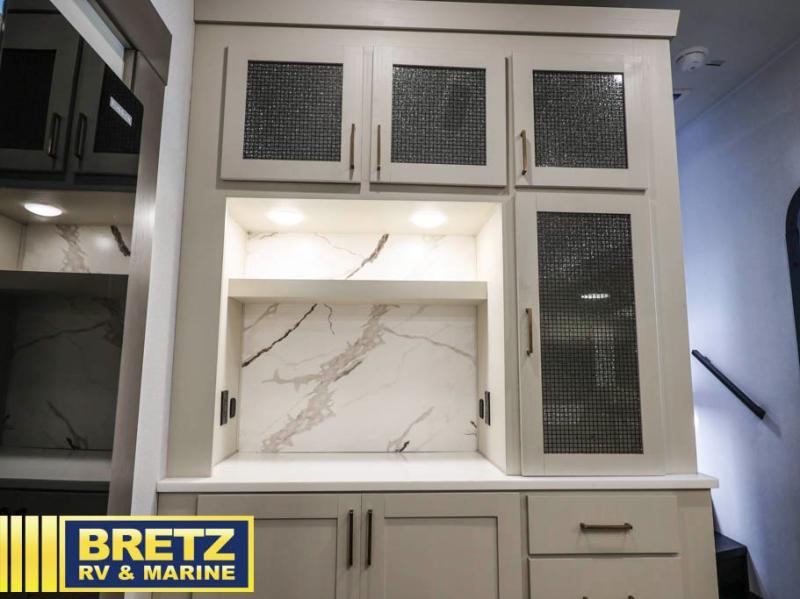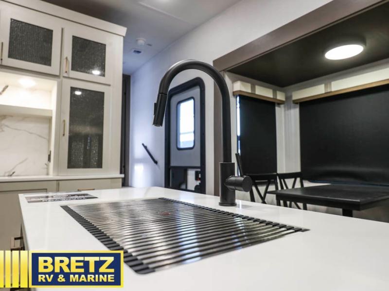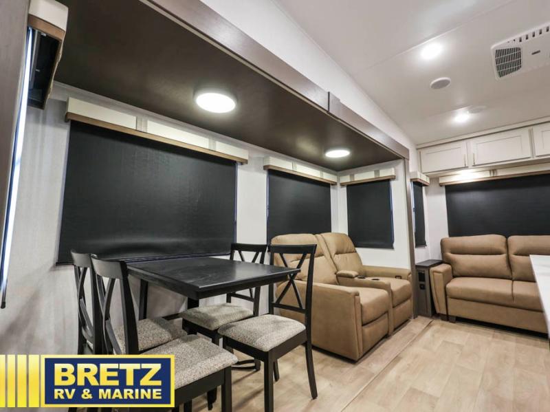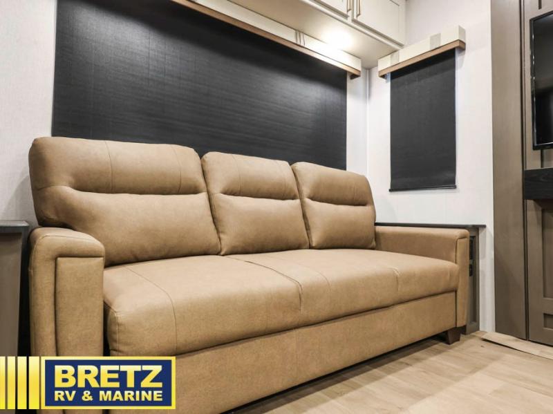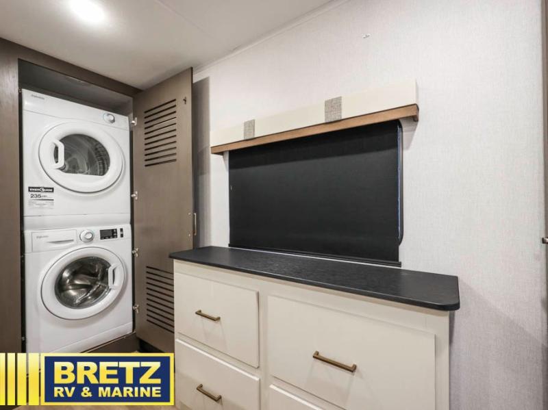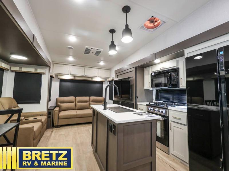 Enjoy luxury camping trips in this triple slide out fifth wheel! Once you've unloaded your gear, you can make lunch on the four burner 24" range, and the chef is sure to appreciate the kitchen island for more counter space. Your crew can dine at the free-standing dinette and relax on the theater seating across from the 50" TV and fireplace. There is also a hidden pantry behind the TV, and the queen bed hide-a-bed sofa will provide a place for guests to sleep! You'll find your own space up front in the private bedroom, complete with a king bed slide out with storage underneath, a dresser, plus a front wardrobe and stackable washer/dryer prep!
