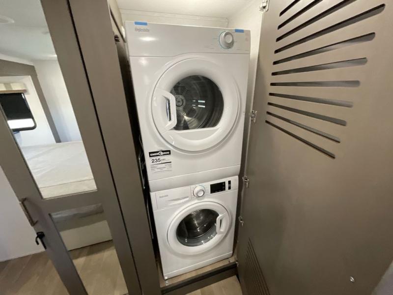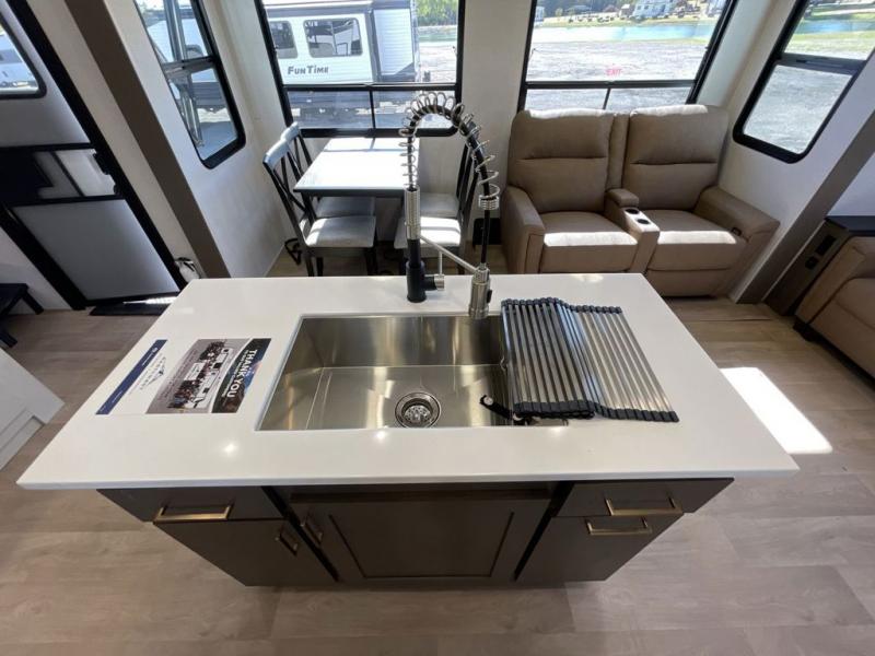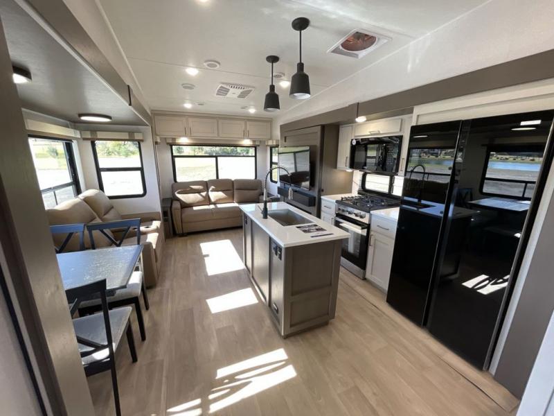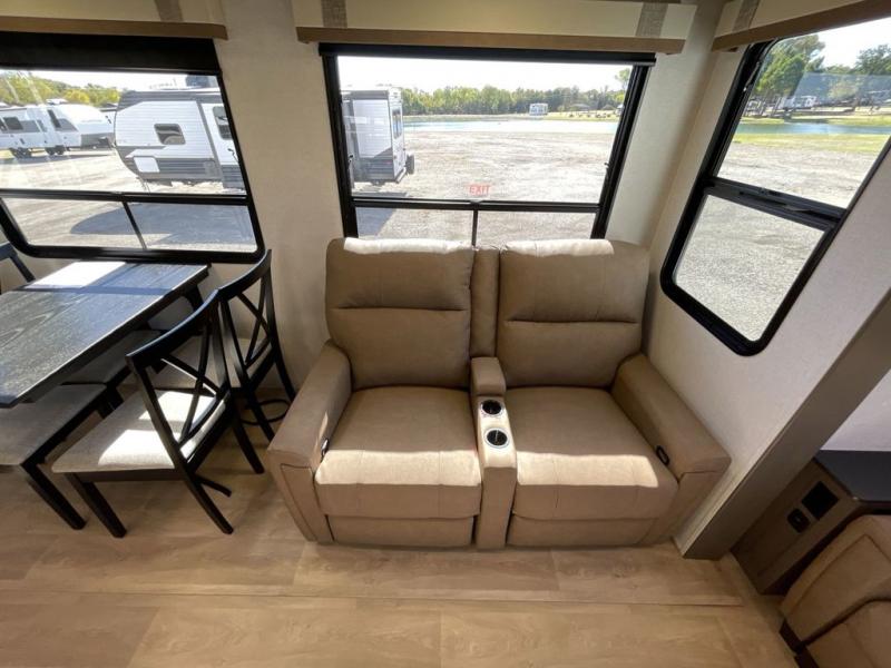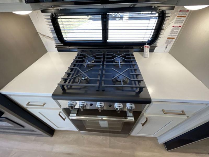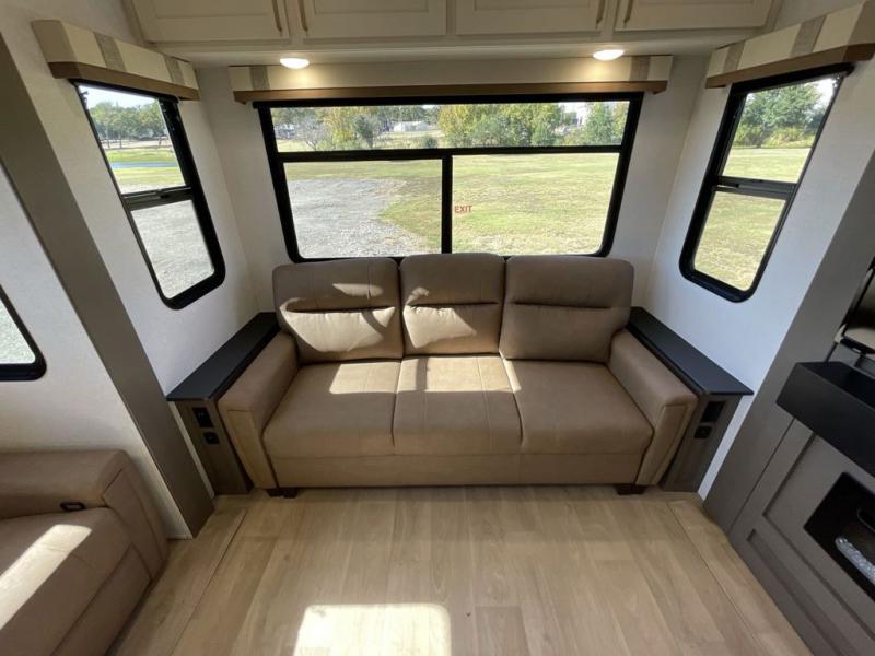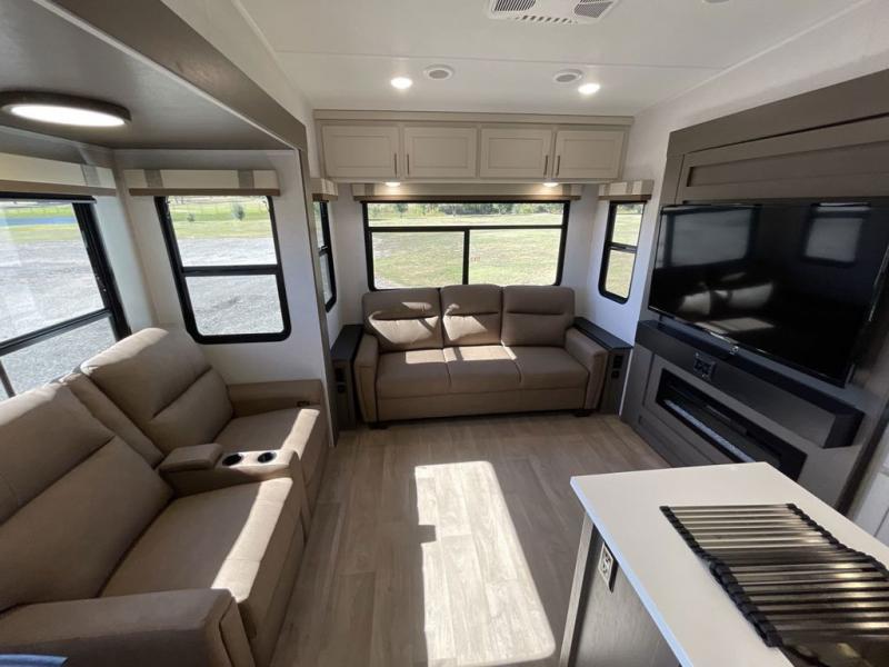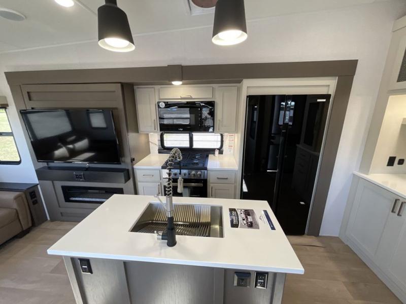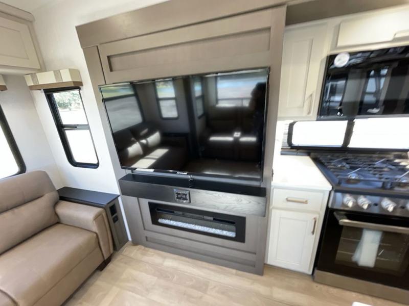 Enjoy luxury camping trips in this triple slide out fifth wheel! Once you've unloaded your gear, you can make lunch on the four burner 24" range, and the chef is sure to appreciate the kitchen island for more counter space. Your crew can dine at the free-standing dinette and relax on the theater seating across from the 50" TV and fireplace. There is also a hidden pantry behind the TV, and the queen bed hide-a-bed sofa will provide a place for guests to sleep! You'll find your own space up front in the private bedroom, complete with a king bed slide out with storage underneath, a dresser, plus a front wardrobe and stackable washer/dryer prep!