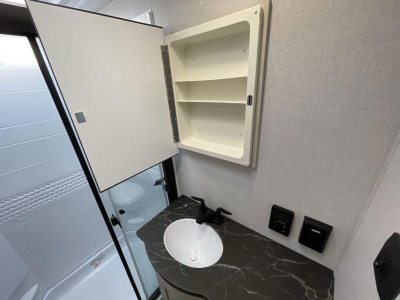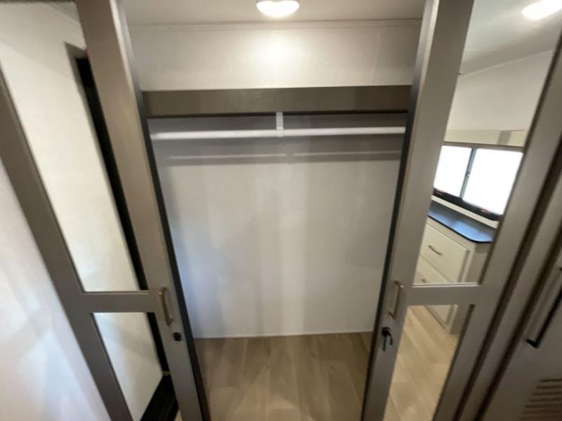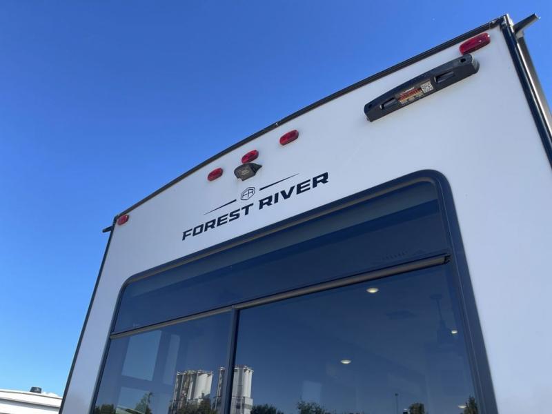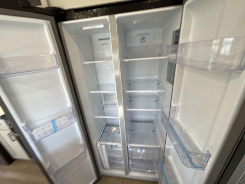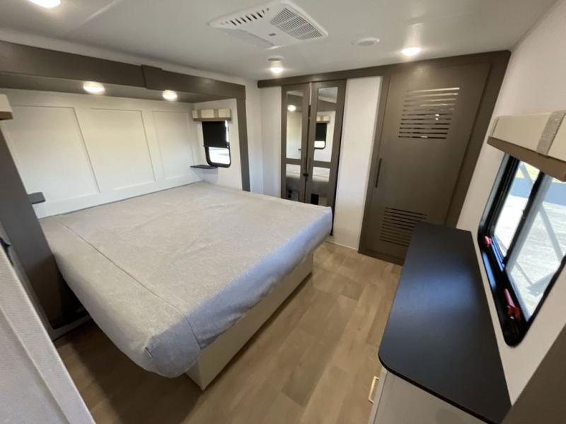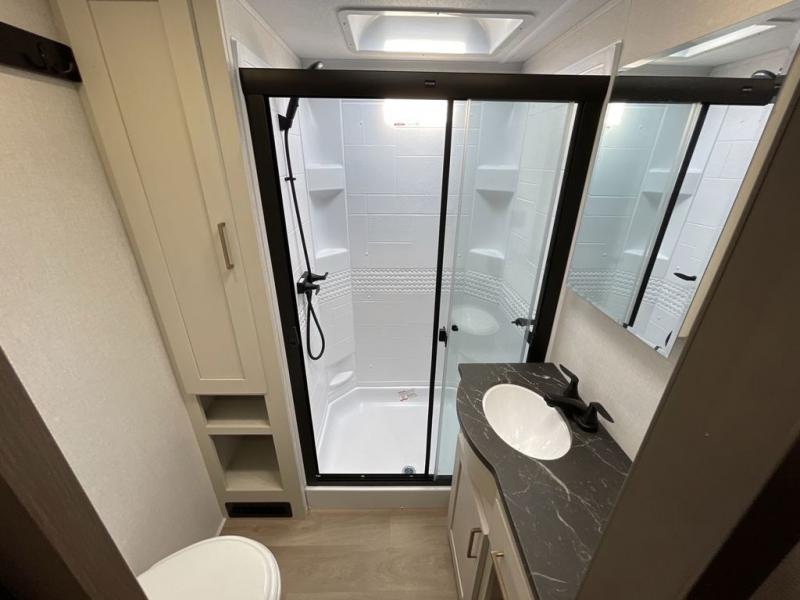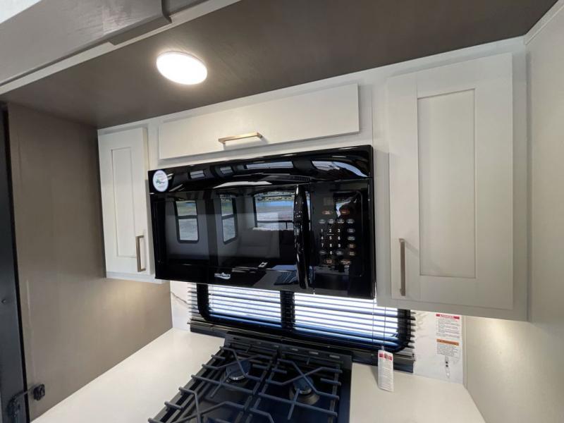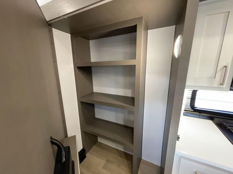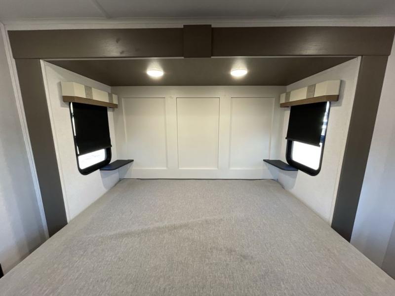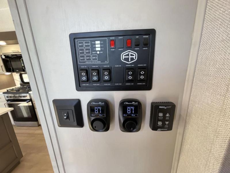 Enjoy luxury camping trips in this triple slide out fifth wheel! Once you've unloaded your gear, you can make lunch on the four burner 24" range, and the chef is sure to appreciate the kitchen island for more counter space. Your crew can dine at the free-standing dinette and relax on the theater seating across from the 50" TV and fireplace. There is also a hidden pantry behind the TV, and the queen bed hide-a-bed sofa will provide a place for guests to sleep! You'll find your own space up front in the private bedroom, complete with a king bed slide out with storage underneath, a dresser, plus a front wardrobe and stackable washer/dryer prep!
