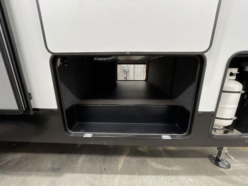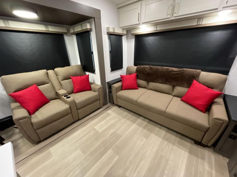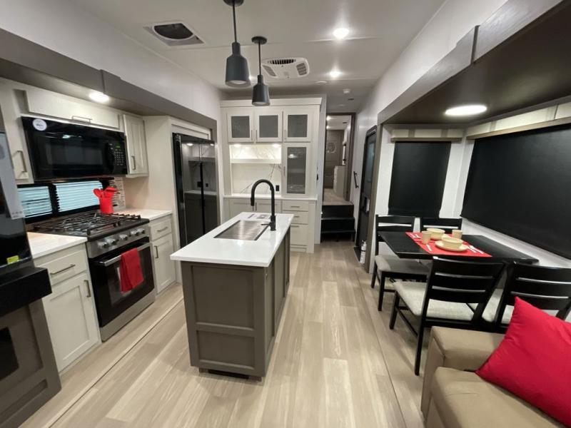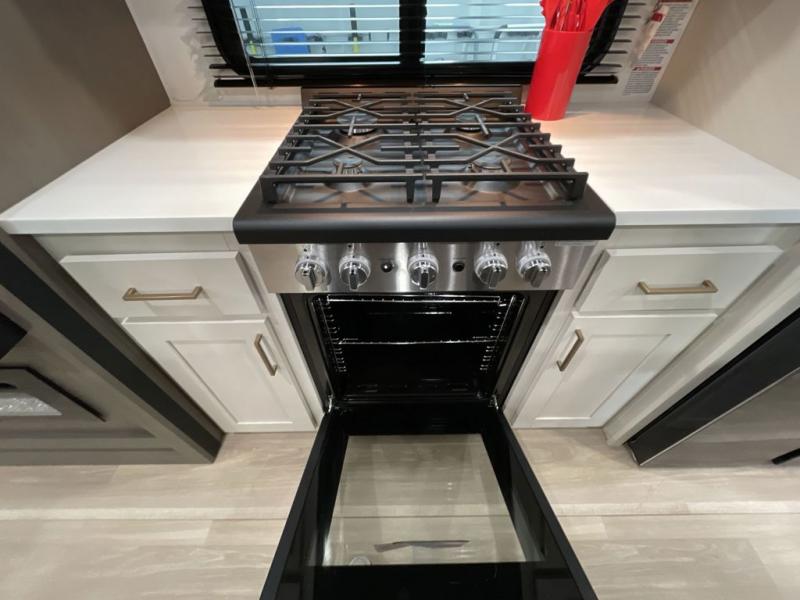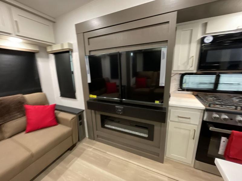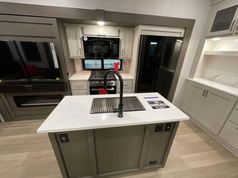 Enjoy luxury camping trips in this triple slide out fifth wheel! Once you've unloaded your gear, you can make lunch on the four burner 24" range, and the chef is sure to appreciate the kitchen island for more counter space. Your crew can dine at the free-standing dinette and relax on the theater seating across from the 50" TV and fireplace. There is also a hidden pantry behind the TV, and the queen bed hide-a-bed sofa will provide a place for guests to sleep! You'll find your own space up front in the private bedroom, complete with a king bed slide out with storage underneath, a dresser, plus a front wardrobe and stackable washer/dryer prep!