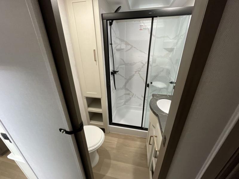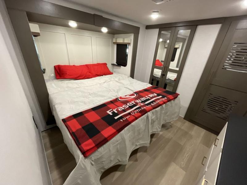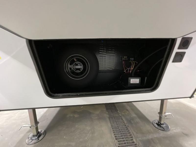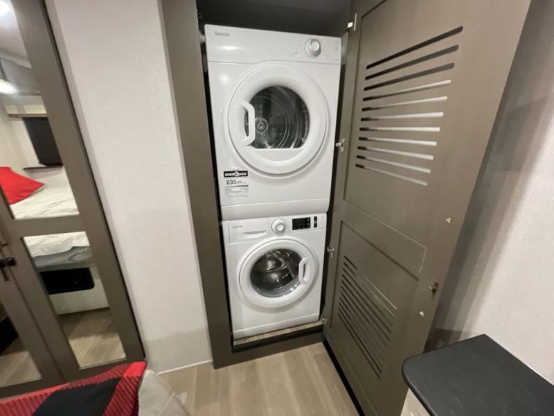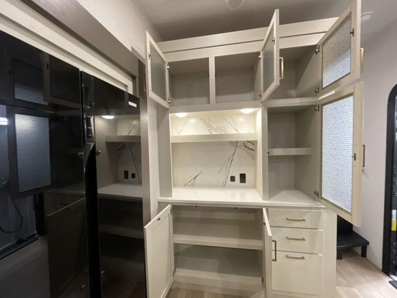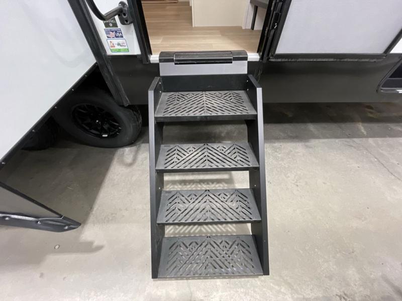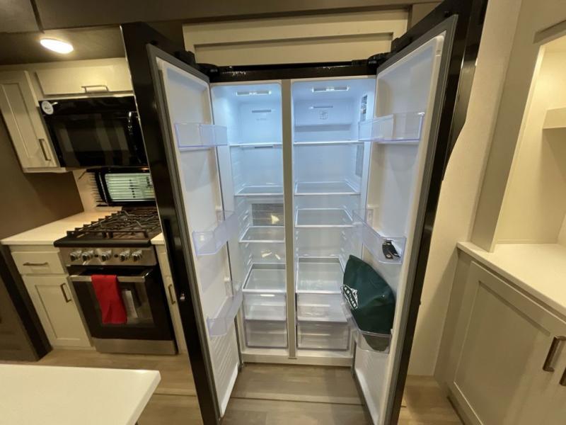 Enjoy luxury camping trips in this triple slide out fifth wheel! Once you've unloaded your gear, you can make lunch on the four burner 24" range, and the chef is sure to appreciate the kitchen island for more counter space. Your crew can dine at the free-standing dinette and relax on the theater seating across from the 50" TV and fireplace. There is also a hidden pantry behind the TV, and the queen bed hide-a-bed sofa will provide a place for guests to sleep! You'll find your own space up front in the private bedroom, complete with a king bed slide out with storage underneath, a dresser, plus a front wardrobe and stackable washer/dryer prep!