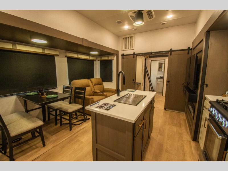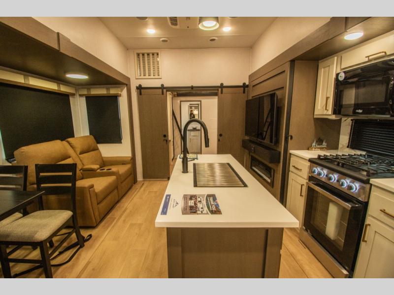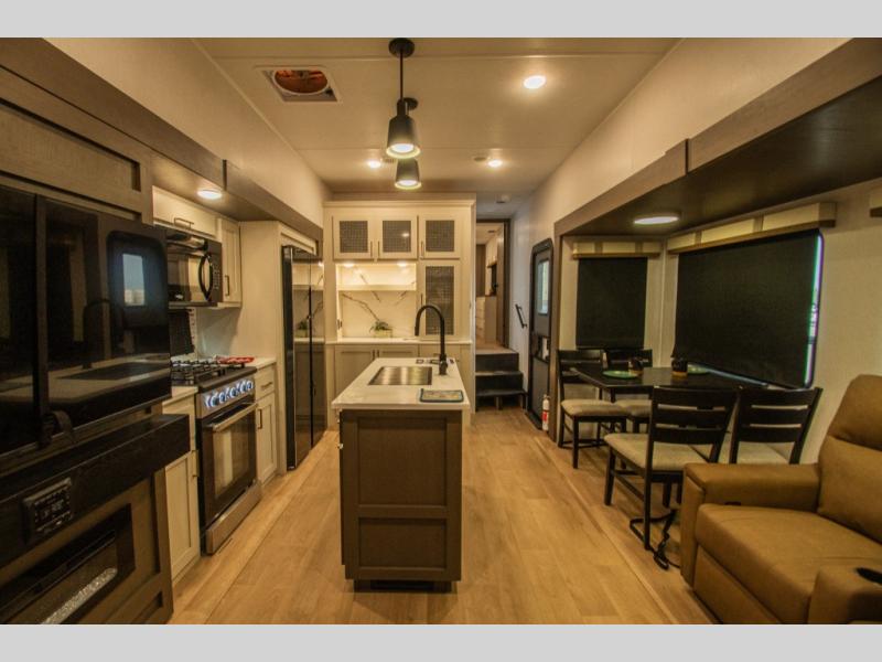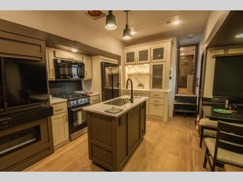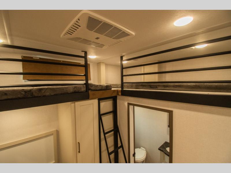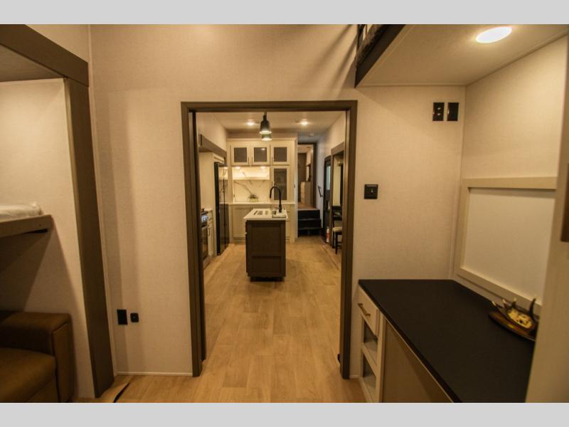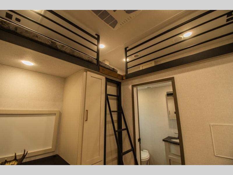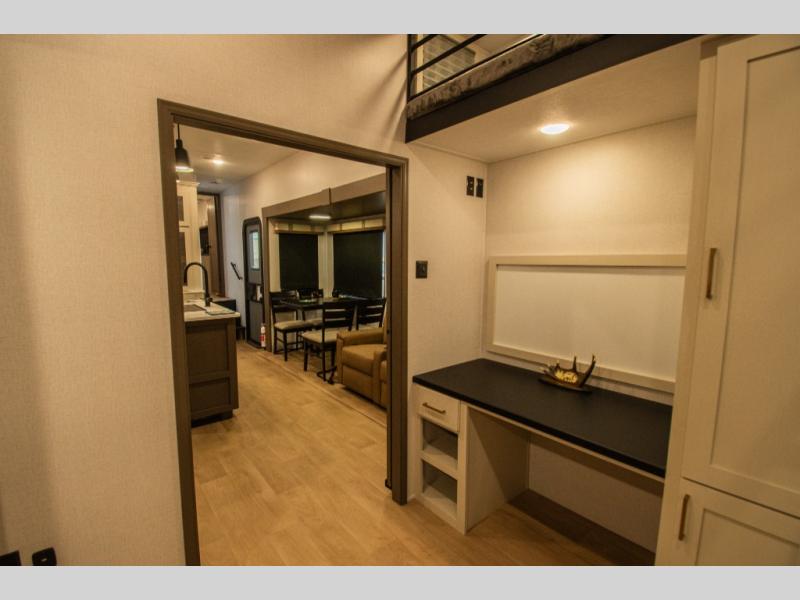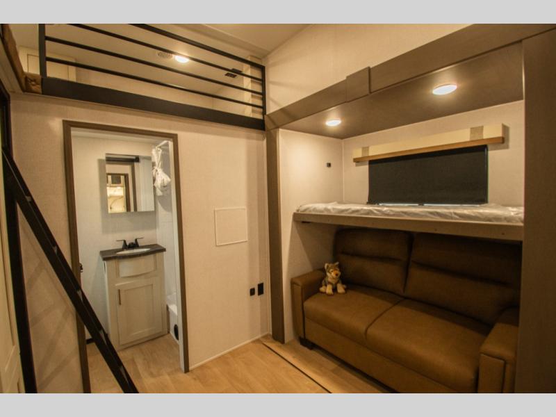 This is the perfect fifth wheel if you enjoy bringing along extra friends and family! You'll have the front private bedroom all to yourselves with a king bed slide out, a dresser with TV prep, plus a large front wardrobe and stackable washer/dryer prep. And a full bath is right next door for easy use. Your guests will love the rear bunkhouse suite with a hide-a-bed sofa and fold-down bunk and a desk with a chair. There is also a full rear bath with its own exterior entry door and a loft area for even more sleeping or storage space. In the morning, you can all meet in the combined kitchen and living area that includes dual opposing slides for more space, a kitchen island, and a hutch for additional storage. There is also theater seating in direct view of the 50" TV and fireplace, along with a dinette with four chairs where you can dine together.