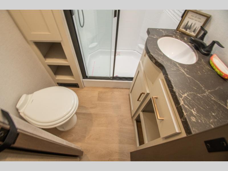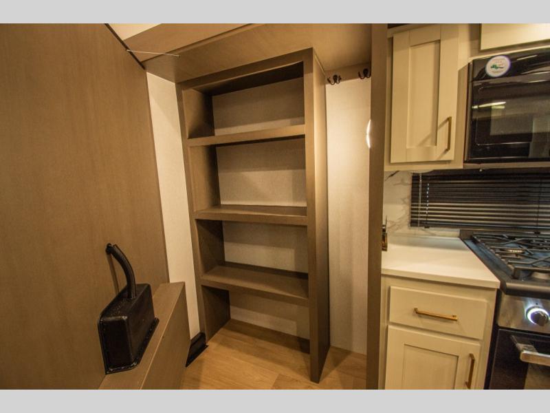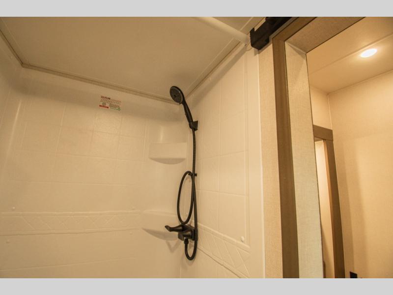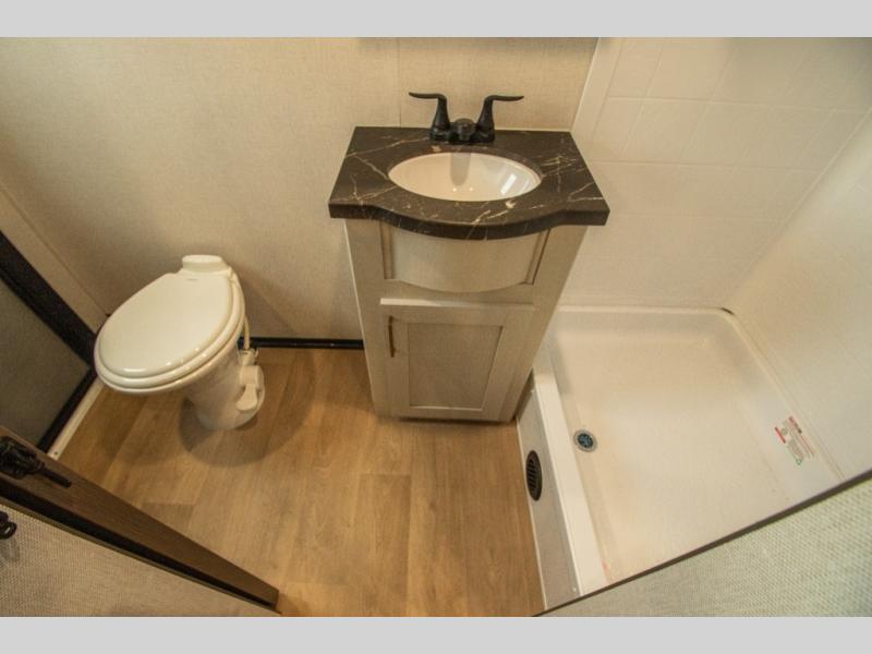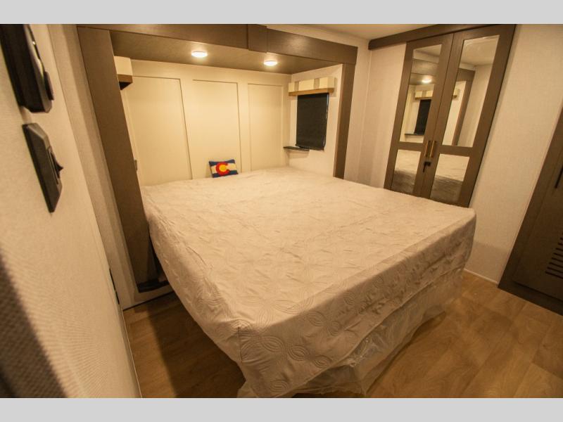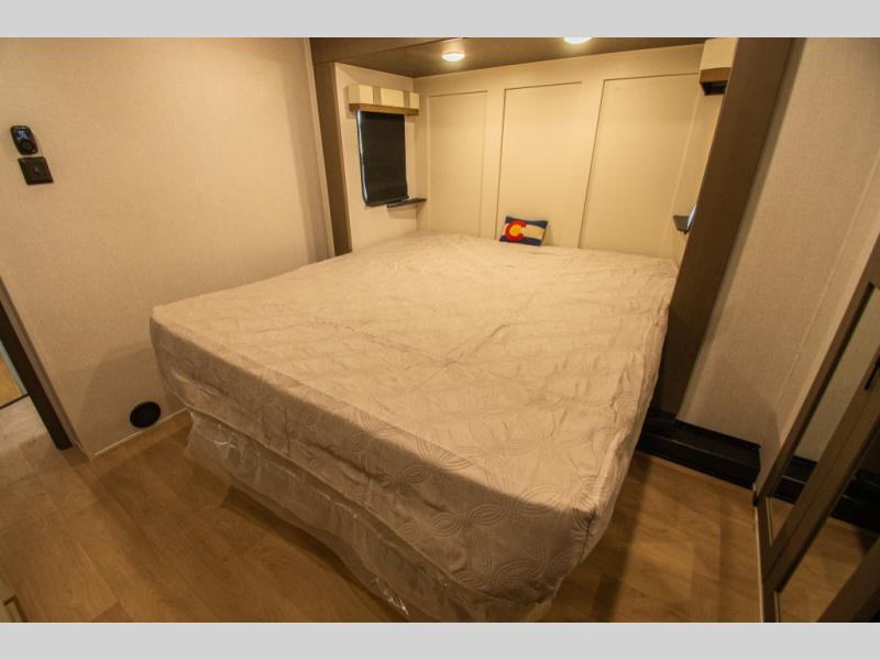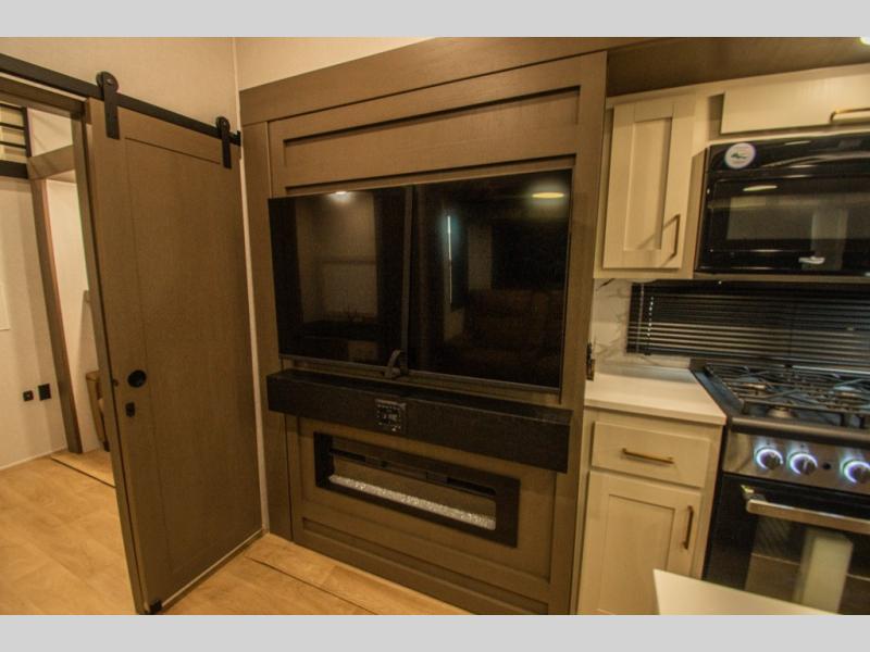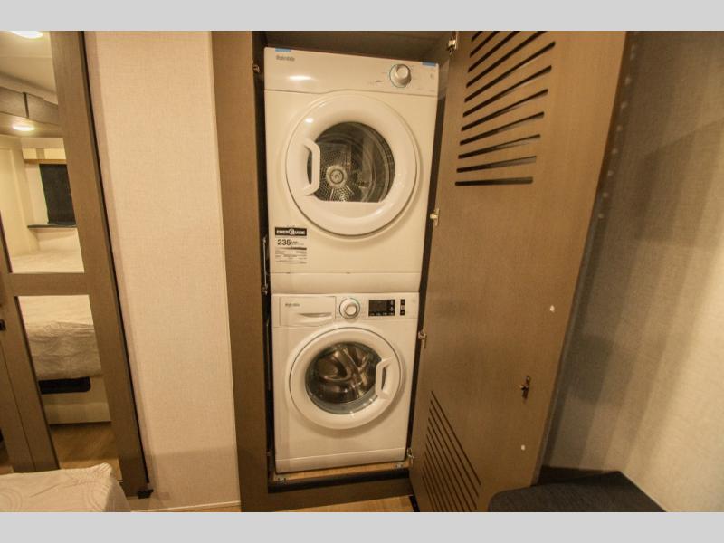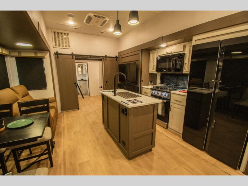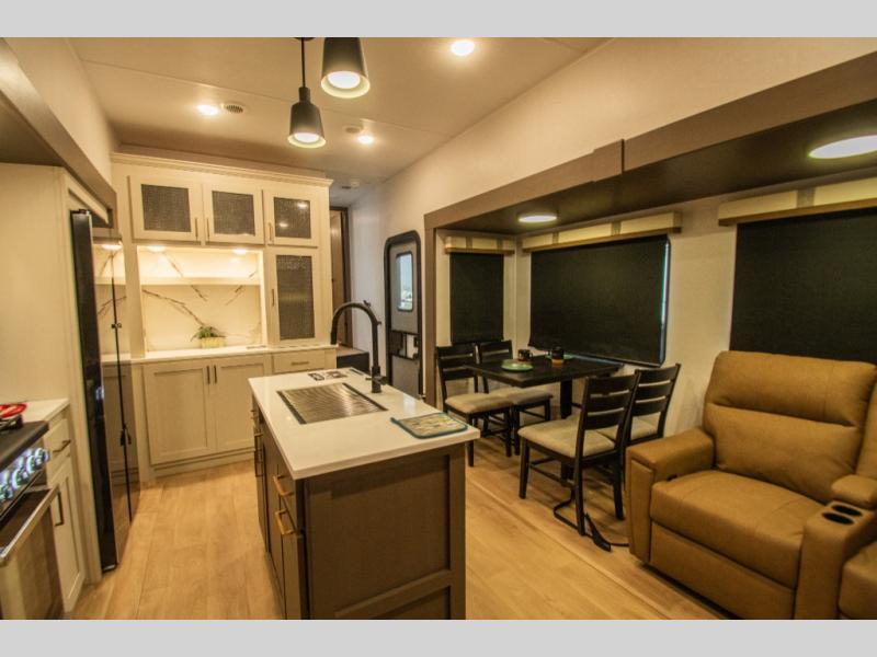 This is the perfect fifth wheel if you enjoy bringing along extra friends and family! You'll have the front private bedroom all to yourselves with a king bed slide out, a dresser with TV prep, plus a large front wardrobe and stackable washer/dryer prep. And a full bath is right next door for easy use. Your guests will love the rear bunkhouse suite with a hide-a-bed sofa and fold-down bunk and a desk with a chair. There is also a full rear bath with its own exterior entry door and a loft area for even more sleeping or storage space. In the morning, you can all meet in the combined kitchen and living area that includes dual opposing slides for more space, a kitchen island, and a hutch for additional storage. There is also theater seating in direct view of the 50" TV and fireplace, along with a dinette with four chairs where you can dine together.