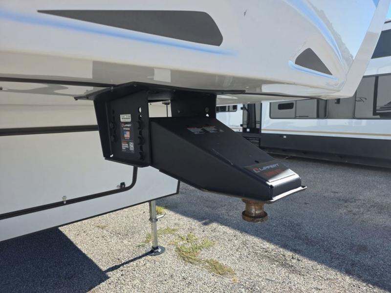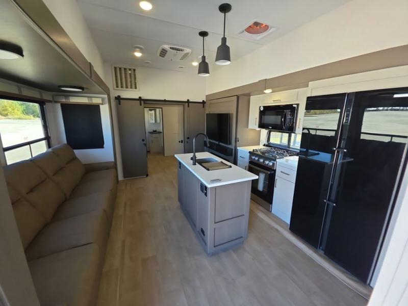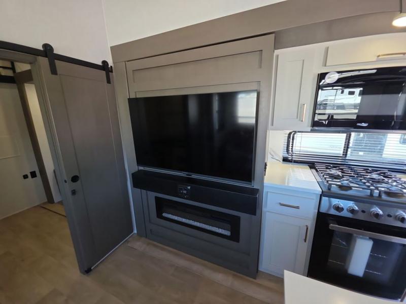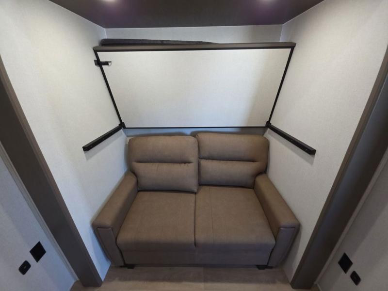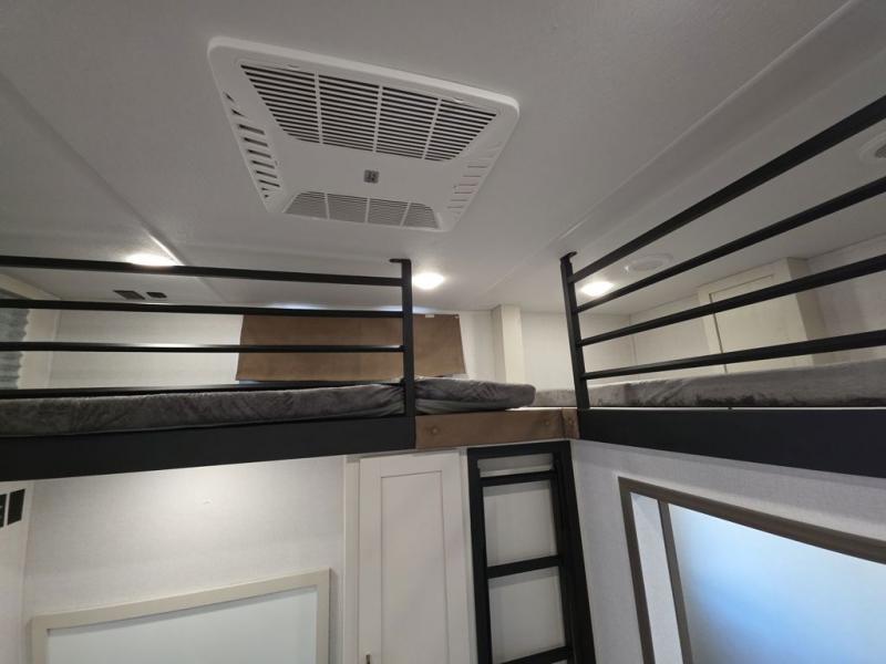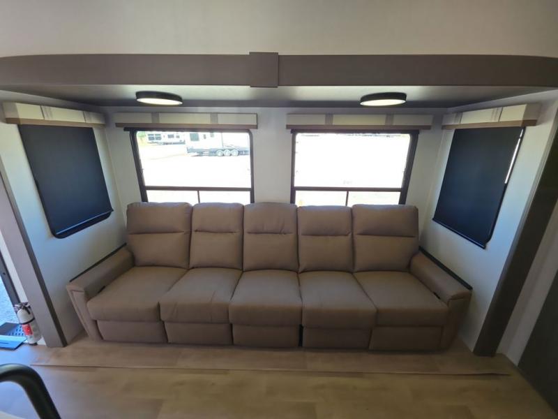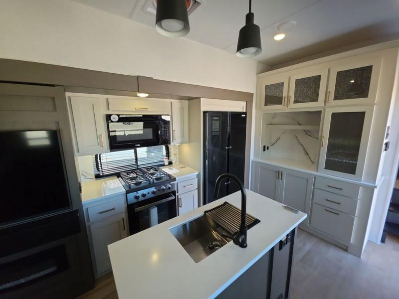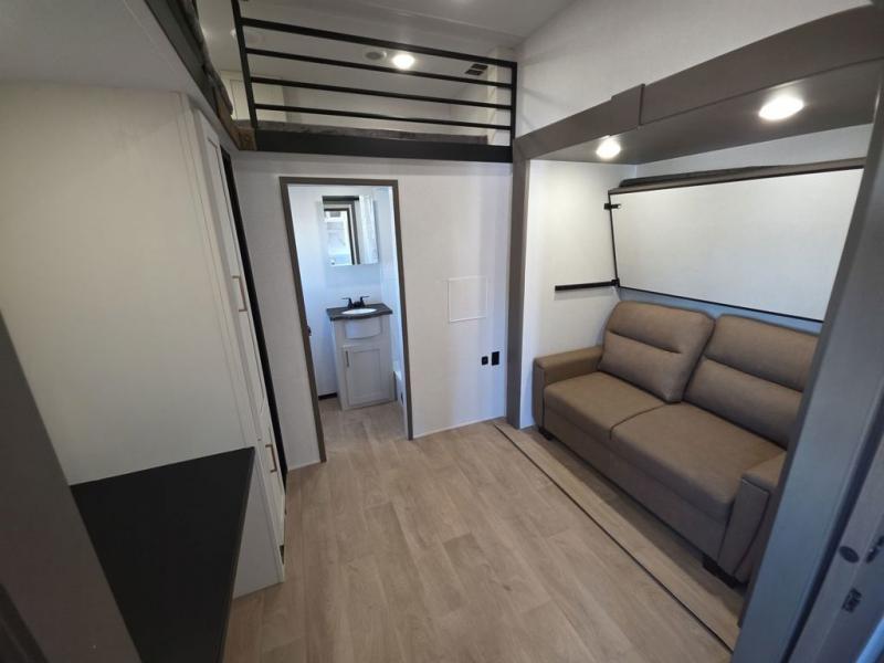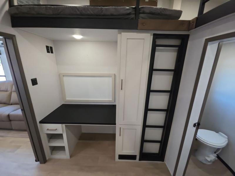 This is the perfect fifth wheel if you enjoy bringing along extra friends and family! You'll have the front private bedroom all to yourselves with a king bed slide out, a dresser with TV prep, plus a large front wardrobe and stackable washer/dryer prep. And a full bath is right next door for easy use. Your guests will love the rear bunkhouse suite with a hide-a-bed sofa and fold-down bunk and a desk with a chair. There is also a full rear bath with its own exterior entry door and a loft area for even more sleeping or storage space. In the morning, you can all meet in the combined kitchen and living area that includes dual opposing slides for more space, a kitchen island, and a hutch for additional storage. There is also theater seating in direct view of the 50" TV and fireplace, along with a dinette with four chairs where you can dine together.