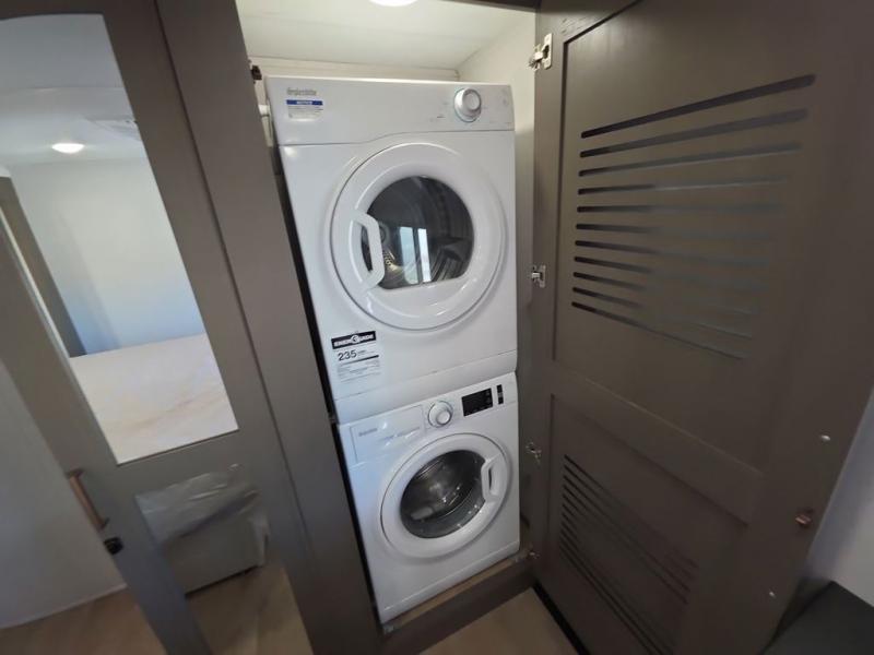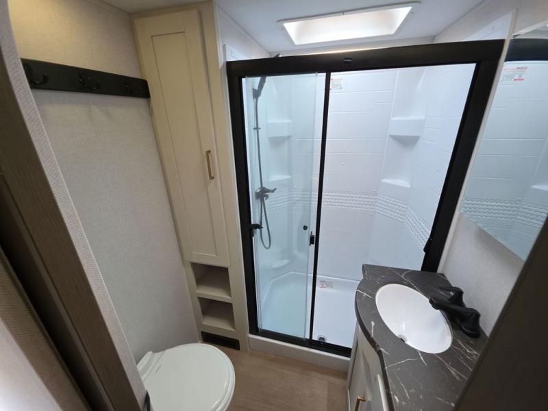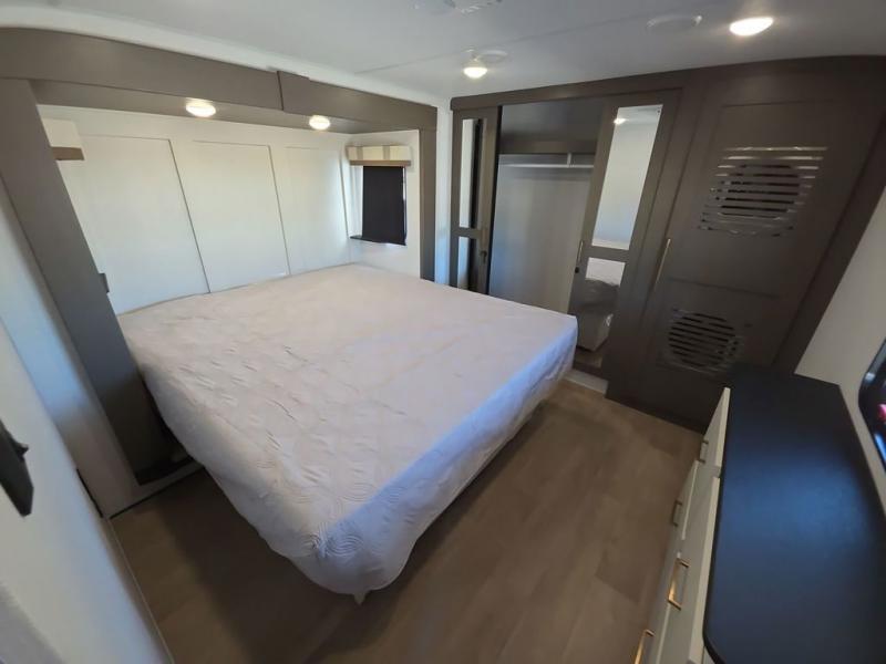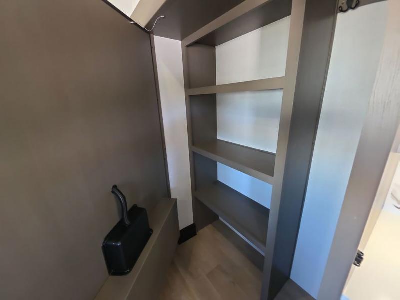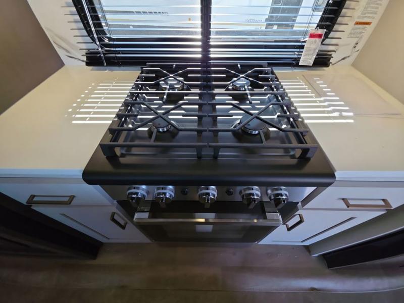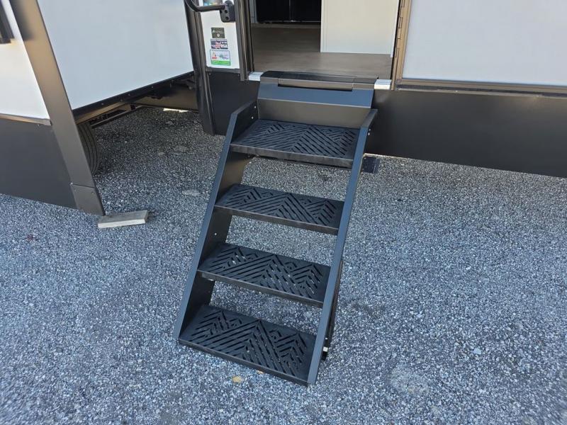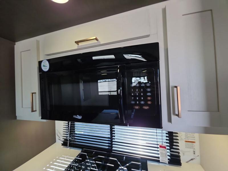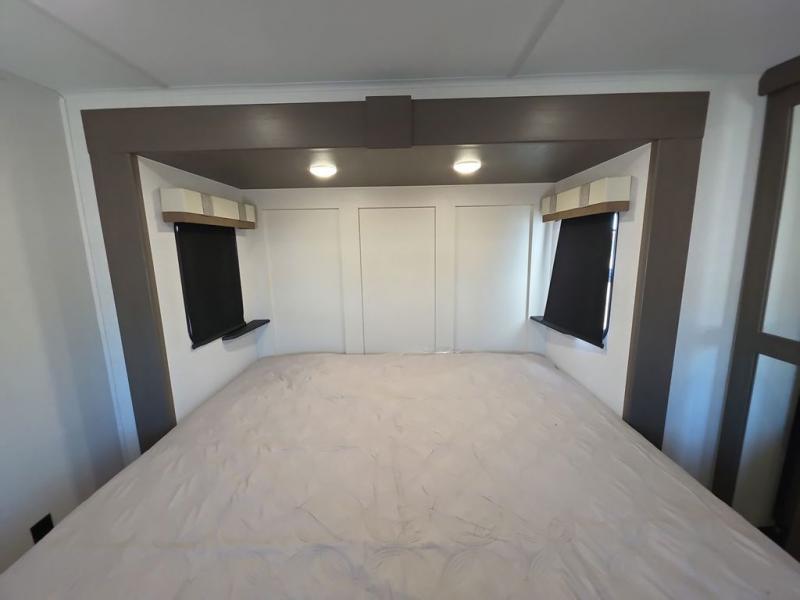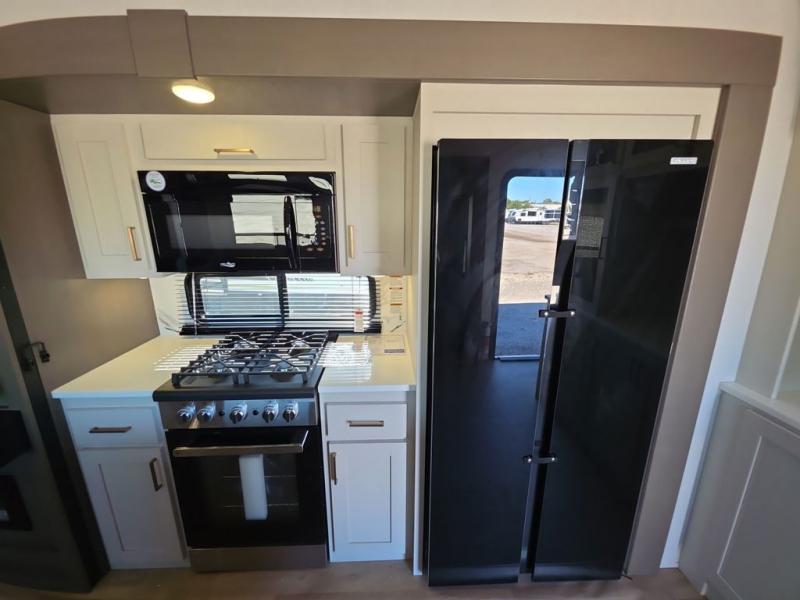 This is the perfect fifth wheel if you enjoy bringing along extra friends and family! You'll have the front private bedroom all to yourselves with a king bed slide out, a dresser with TV prep, plus a large front wardrobe and stackable washer/dryer prep. And a full bath is right next door for easy use. Your guests will love the rear bunkhouse suite with a hide-a-bed sofa and fold-down bunk and a desk with a chair. There is also a full rear bath with its own exterior entry door and a loft area for even more sleeping or storage space. In the morning, you can all meet in the combined kitchen and living area that includes dual opposing slides for more space, a kitchen island, and a hutch for additional storage. There is also theater seating in direct view of the 50" TV and fireplace, along with a dinette with four chairs where you can dine together.