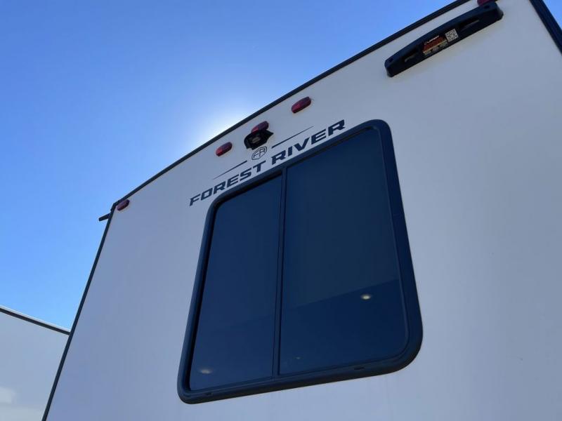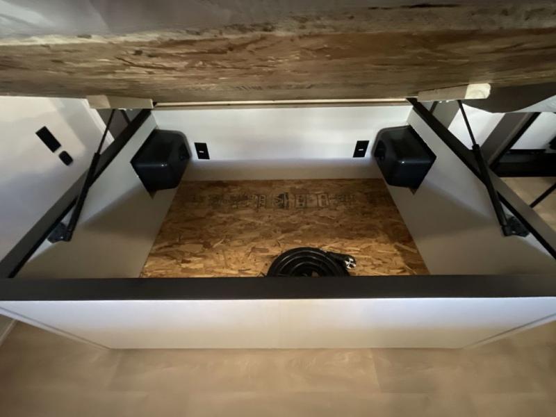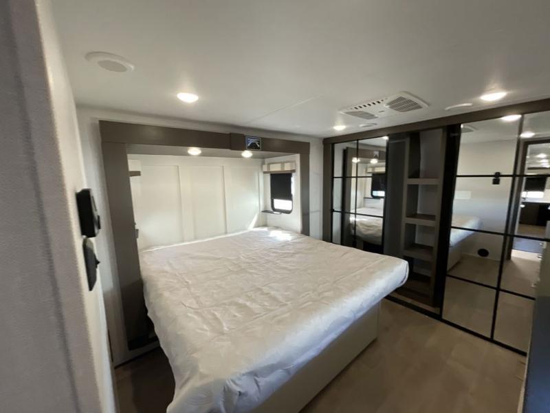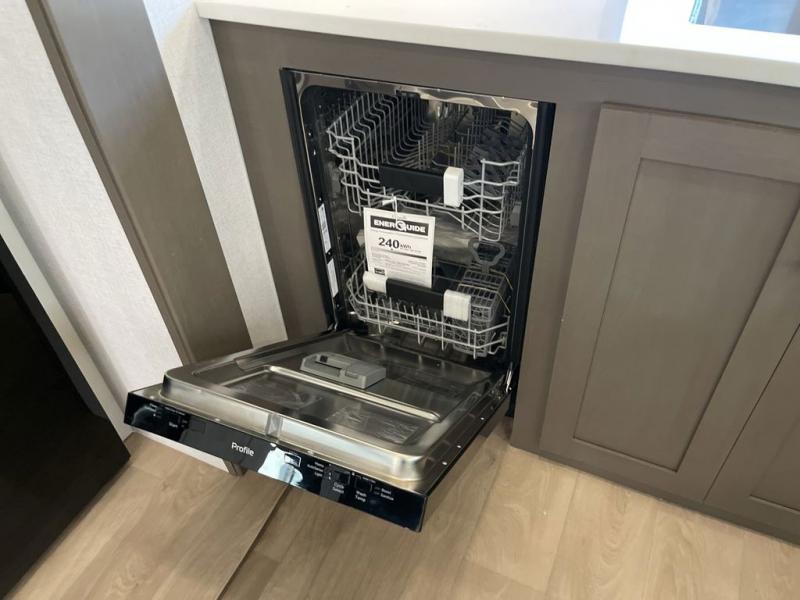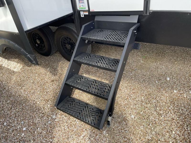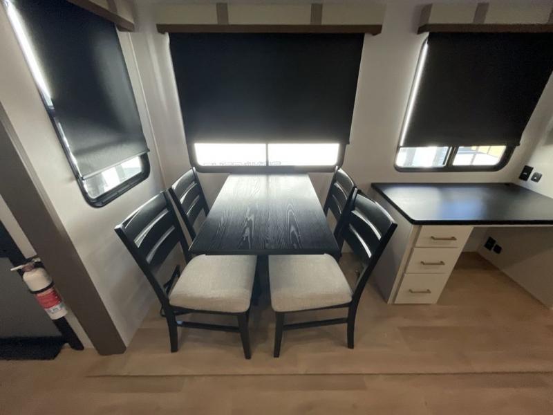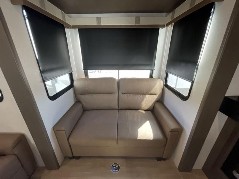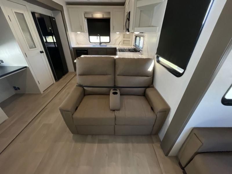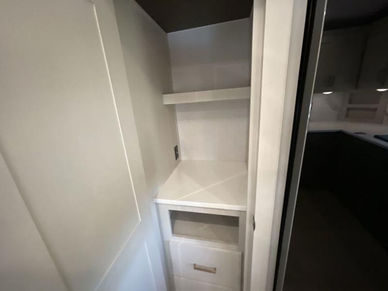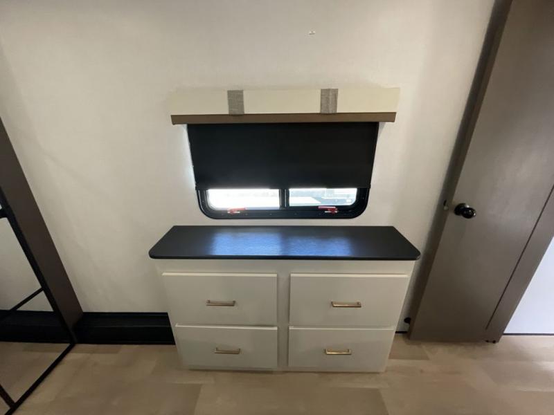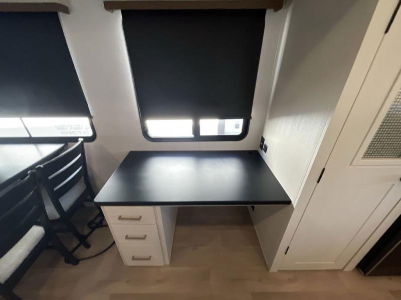 It won't be hard to find comfort and convenience in this spacious fifth wheel! The rear kitchen features ample counter space, a four burner 24" range, plus a 16 cu. ft. 12V refrigerator and pantry for food storage. There is also a desk here if you plan to work while you're away from home, and the coffee station by the pantry will be the perfect place to set up your own Keurig machine. The middle living area includes theater seating across from the 65" TV and fireplace, and there is a hide-a-bed sofa for guests to sleep on. A convenient utility room includes a sink with counter space plus stackable washer/dryer prep to make this an optional laundry room! A full bath will let you freshen up each day, and the front private bedroom will feel just like home with its king bed slide out, dresser and full-width wardrobe!