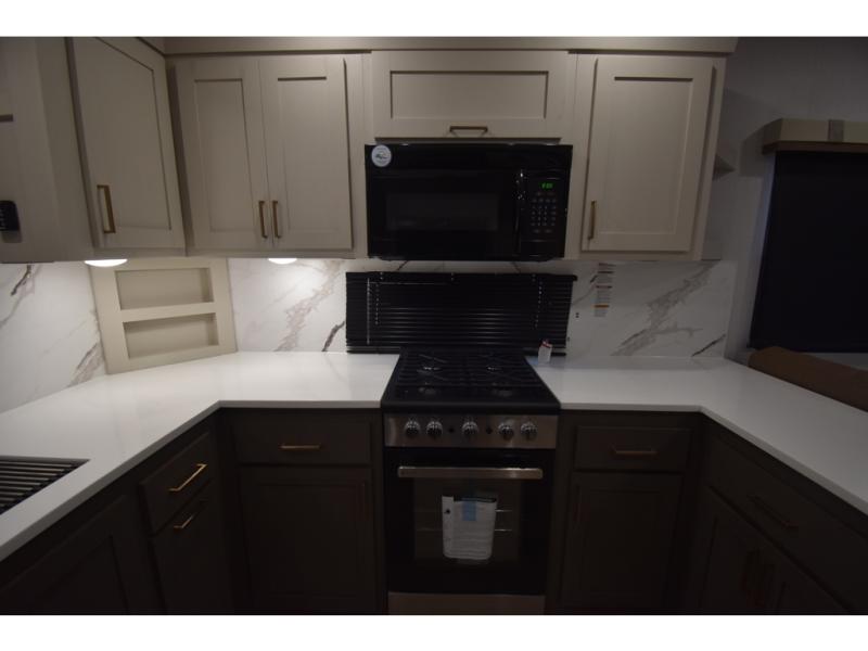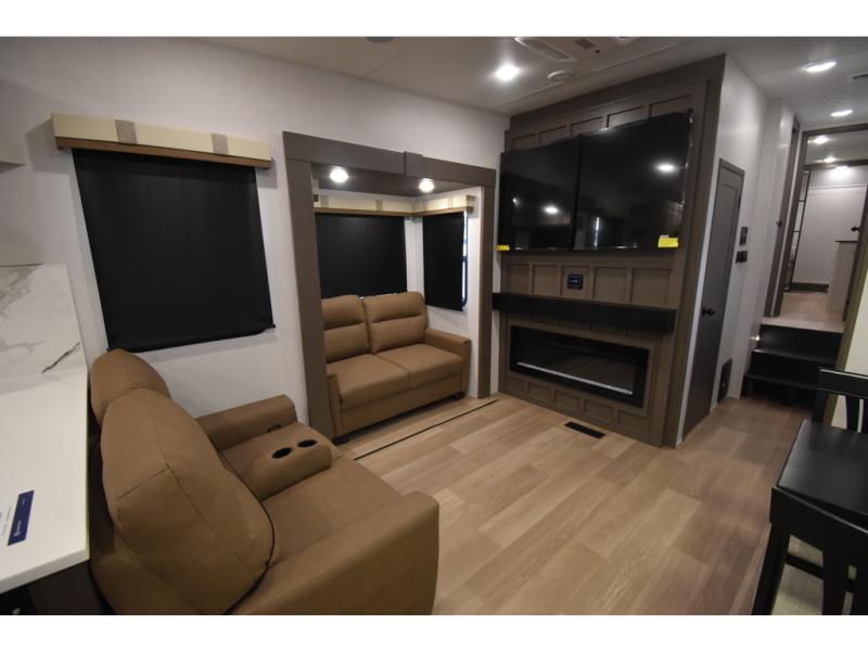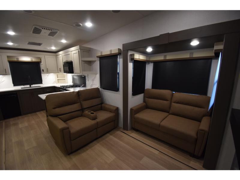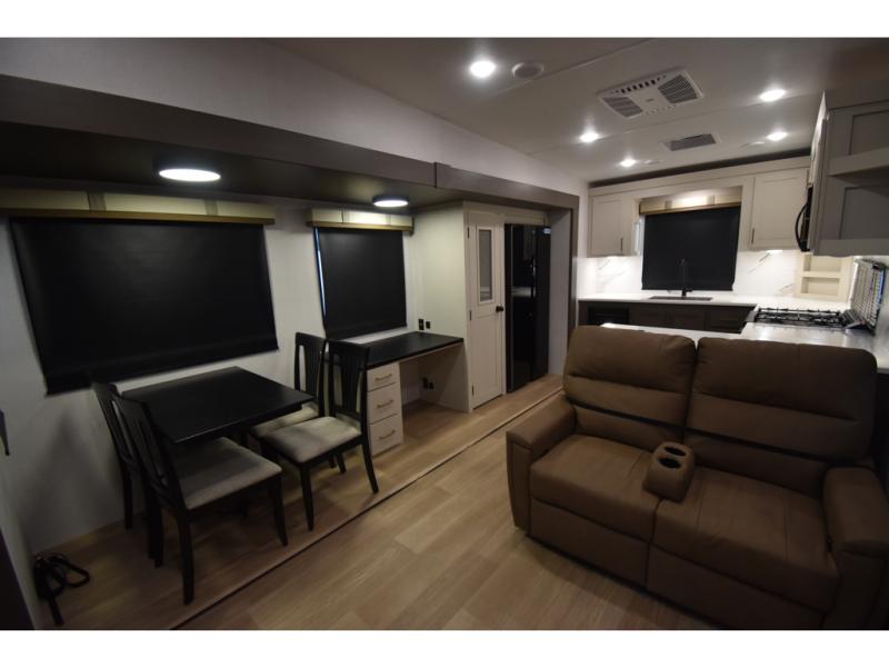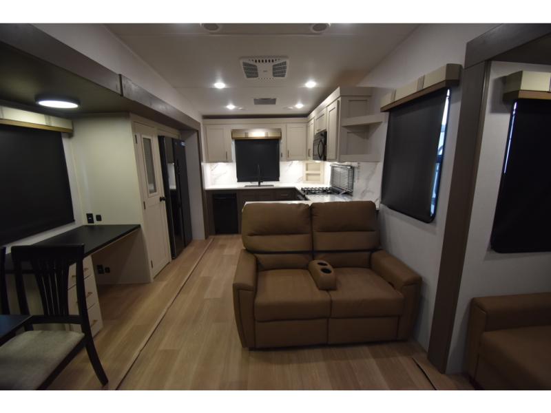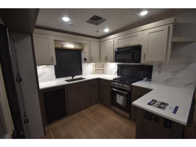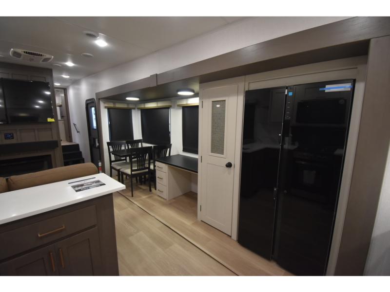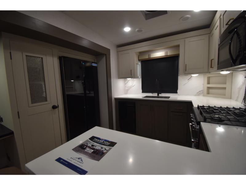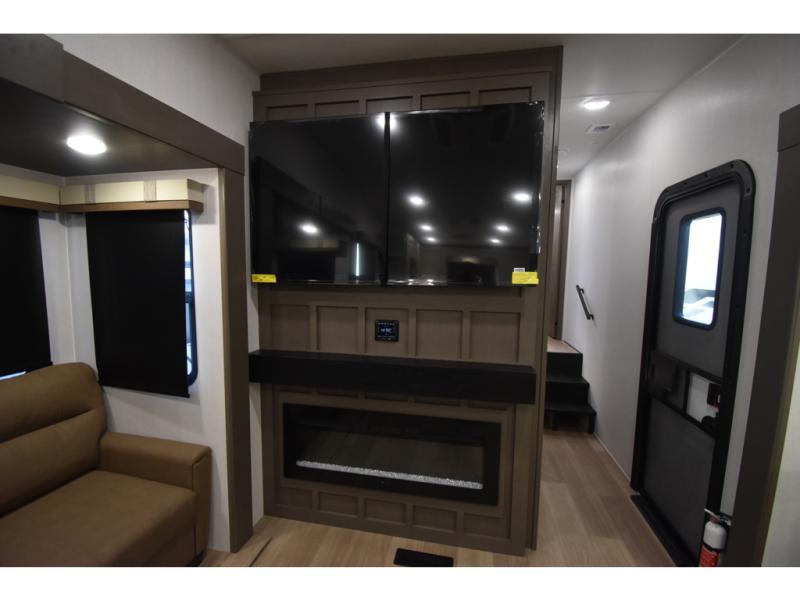 It won't be hard to find comfort and convenience in this spacious fifth wheel! The rear kitchen features ample counter space, a four burner 24" range, plus a 16 cu. ft. 12V refrigerator and pantry for food storage. There is also a desk here if you plan to work while you're away from home, and the coffee station by the pantry will be the perfect place to set up your own Keurig machine. The middle living area includes theater seating across from the 65" TV and fireplace, and there is a hide-a-bed sofa for guests to sleep on. A convenient utility room includes a sink with counter space plus stackable washer/dryer prep to make this an optional laundry room! A full bath will let you freshen up each day, and the front private bedroom will feel just like home with its king bed slide out, dresser and full-width wardrobe!