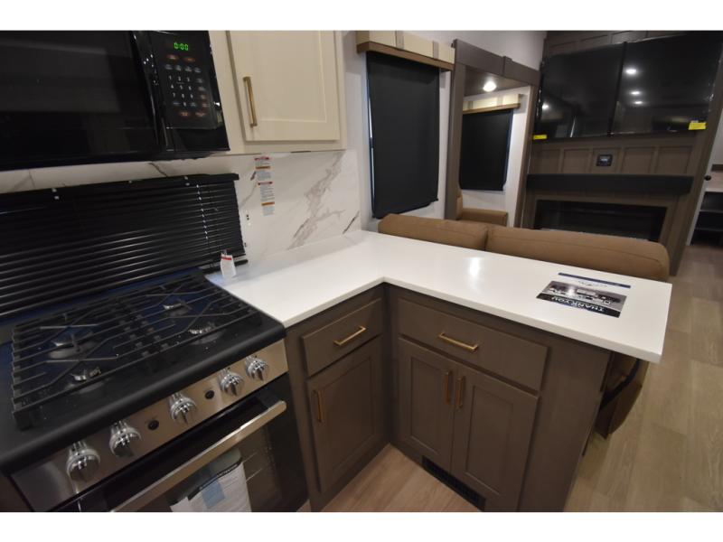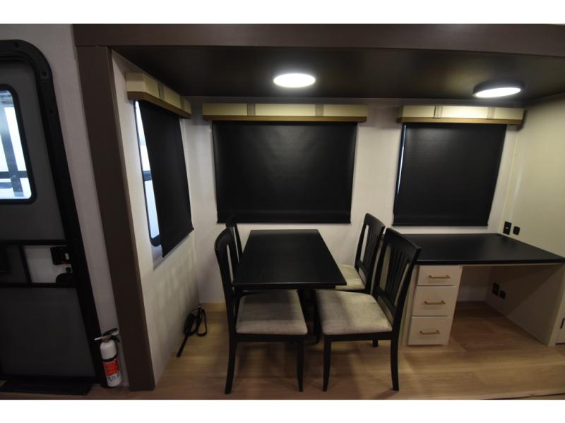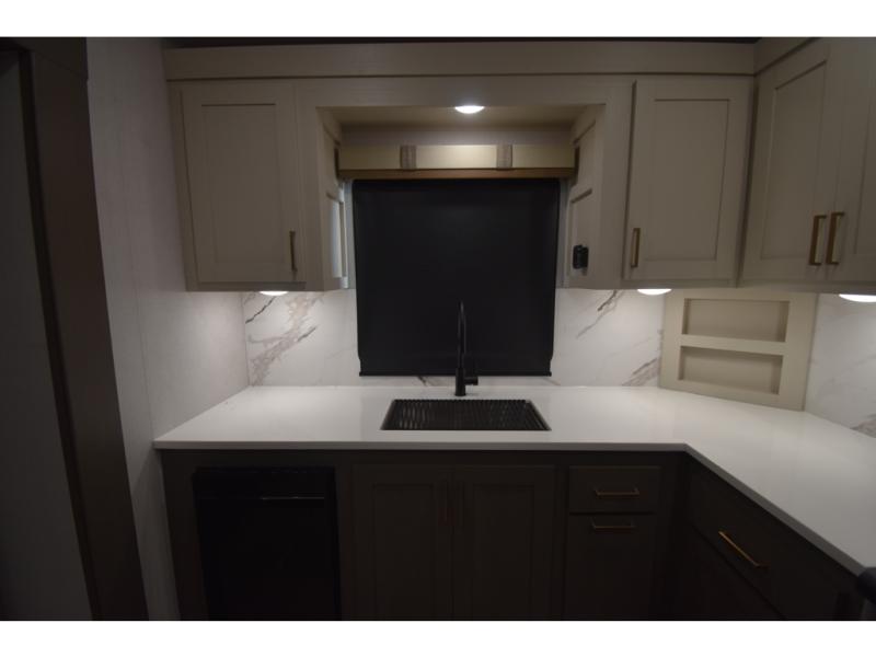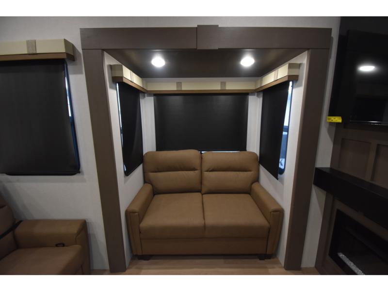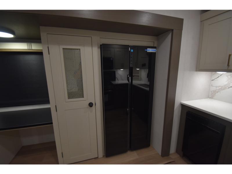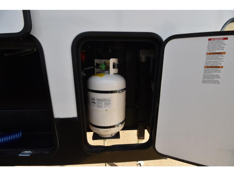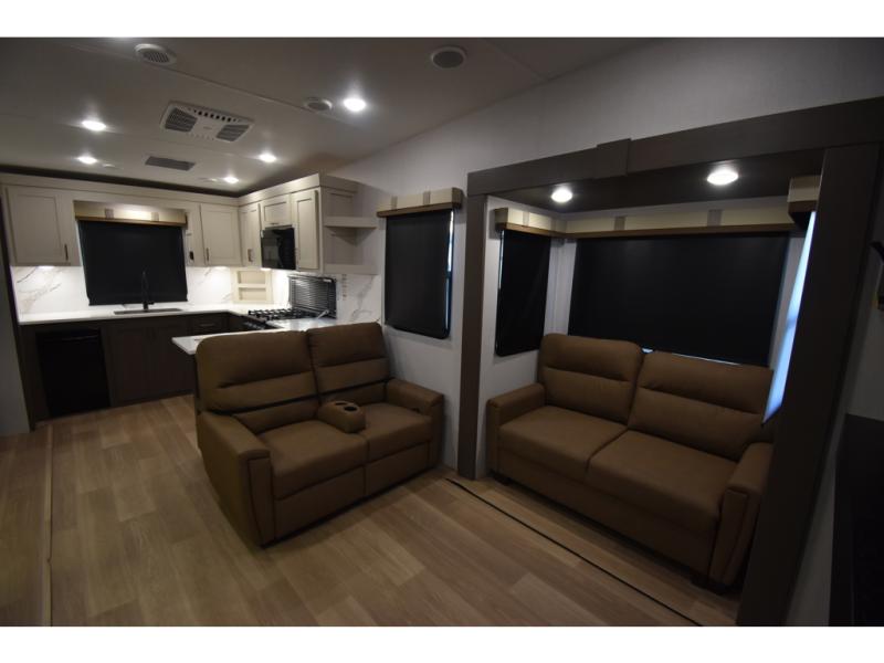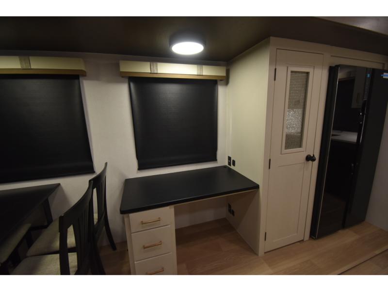 It won't be hard to find comfort and convenience in this spacious fifth wheel! The rear kitchen features ample counter space, a four burner 24" range, plus a 16 cu. ft. 12V refrigerator and pantry for food storage. There is also a desk here if you plan to work while you're away from home, and the coffee station by the pantry will be the perfect place to set up your own Keurig machine. The middle living area includes theater seating across from the 65" TV and fireplace, and there is a hide-a-bed sofa for guests to sleep on. A convenient utility room includes a sink with counter space plus stackable washer/dryer prep to make this an optional laundry room! A full bath will let you freshen up each day, and the front private bedroom will feel just like home with its king bed slide out, dresser and full-width wardrobe!