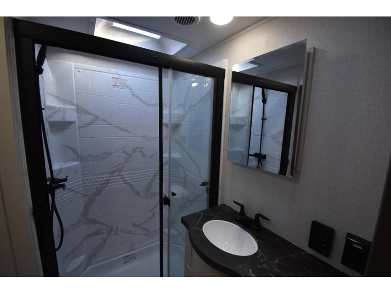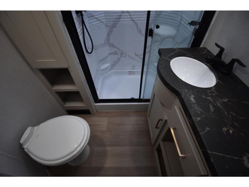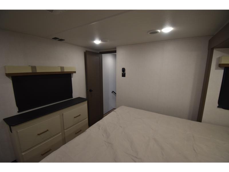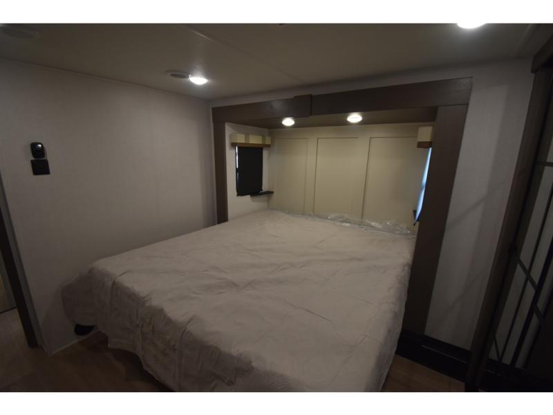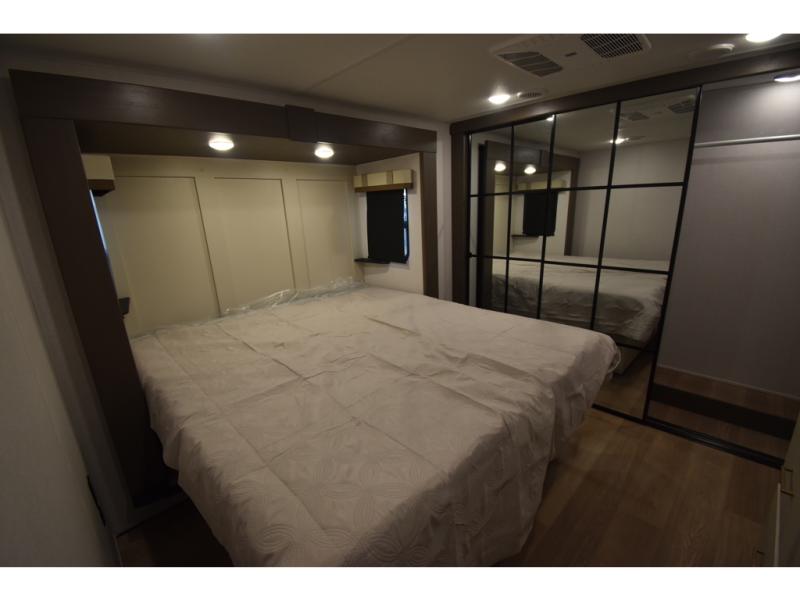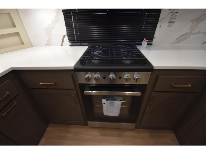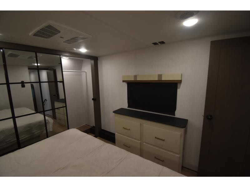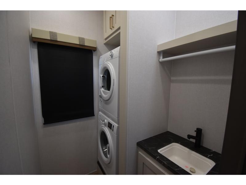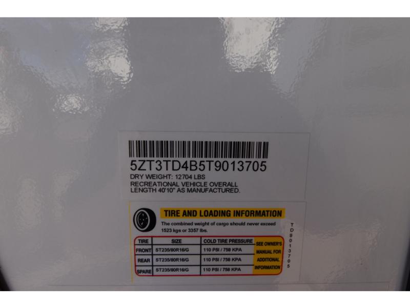 It won't be hard to find comfort and convenience in this spacious fifth wheel! The rear kitchen features ample counter space, a four burner 24" range, plus a 16 cu. ft. 12V refrigerator and pantry for food storage. There is also a desk here if you plan to work while you're away from home, and the coffee station by the pantry will be the perfect place to set up your own Keurig machine. The middle living area includes theater seating across from the 65" TV and fireplace, and there is a hide-a-bed sofa for guests to sleep on. A convenient utility room includes a sink with counter space plus stackable washer/dryer prep to make this an optional laundry room! A full bath will let you freshen up each day, and the front private bedroom will feel just like home with its king bed slide out, dresser and full-width wardrobe!