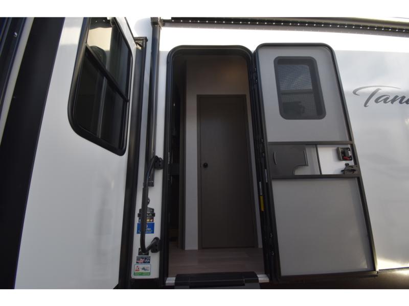 With any Tandara fifth wheel by EAST TO WEST, you will enjoy many standard features to make each trip enjoyable. The Tandara Exterior Luxury Package includes a universal all-in-one docking station, an automatic leveling system, metal slam latch cargo doors, and a 200W solar panel for off-grid capabilities. You will also appreciate the Tandara Climate Package with ductless flooring, dual attic vents, plus a heated and enclosed underbelly for added protection. Inside, you'll find a flush floor kitchen slide, Slow Rise roller shades, solid surface kitchen countertops, and more stand-out features included in the Tandara Interior Luxury Package.