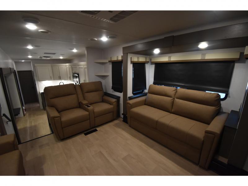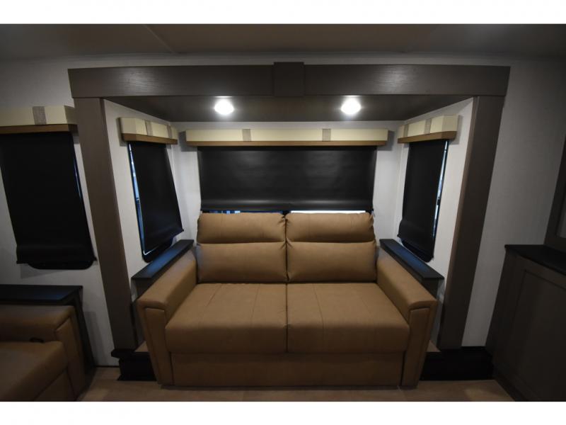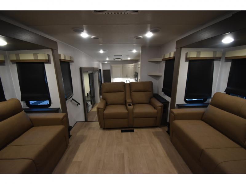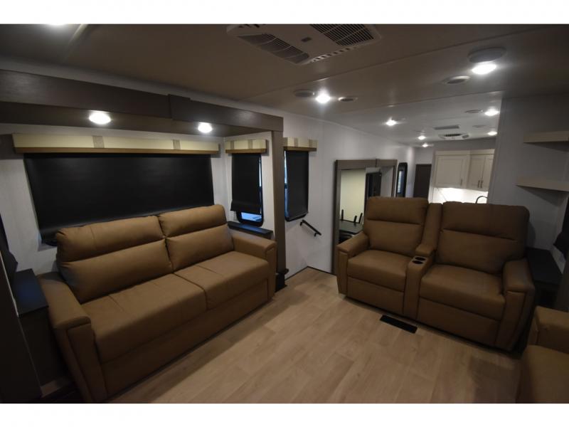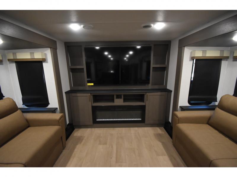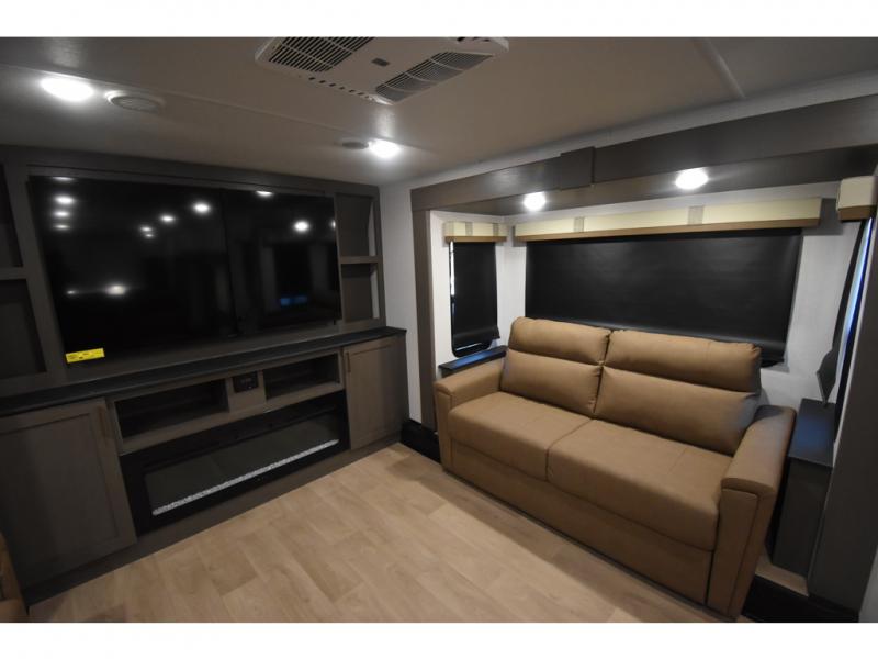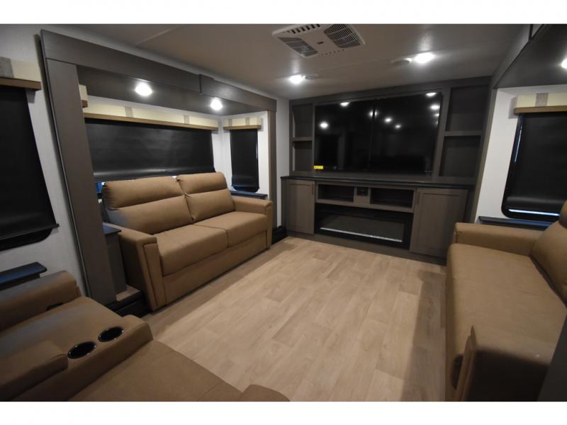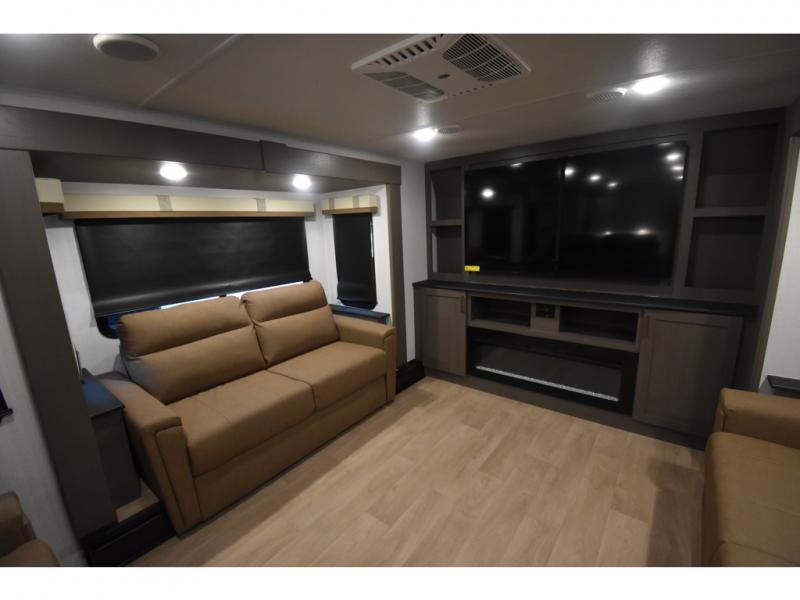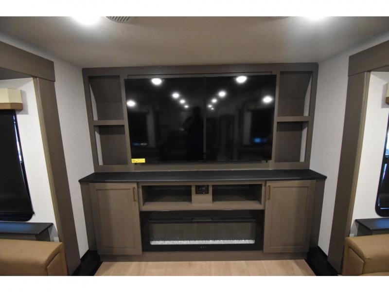 You'll always have a good time in this quad slide out fifth wheel! The front living area will be a favorite hang-out spot with its dual opposing queen bed hide-a-bed sofa slides, along with theater seating across from a 65" TV and fireplace. Your guests can transform this space into their bedroom at night, while you take the rear private bedroom with a king bed slide out, a dresser, and full-width wardrobe. A full bath will let you clean up every day, and the middle kitchen features ample counter space to prep meals. There is also a free-standing dinette where you can dine together, or you can take your plate outdoors to sit under the two power awnings!