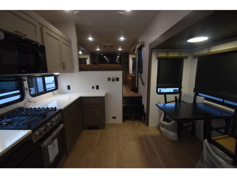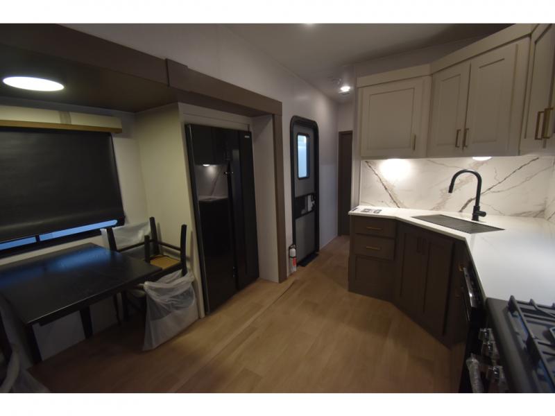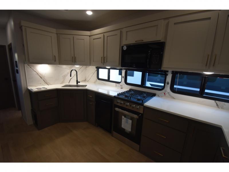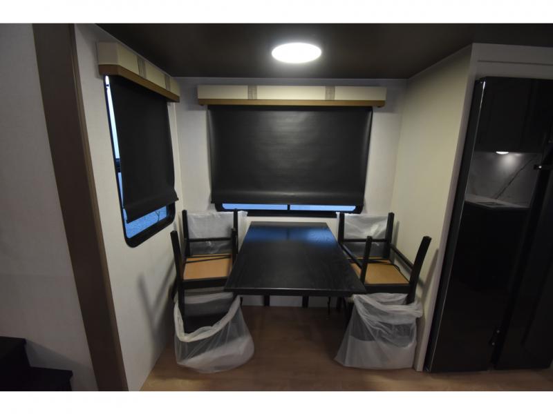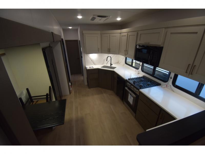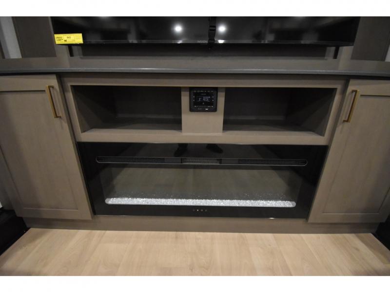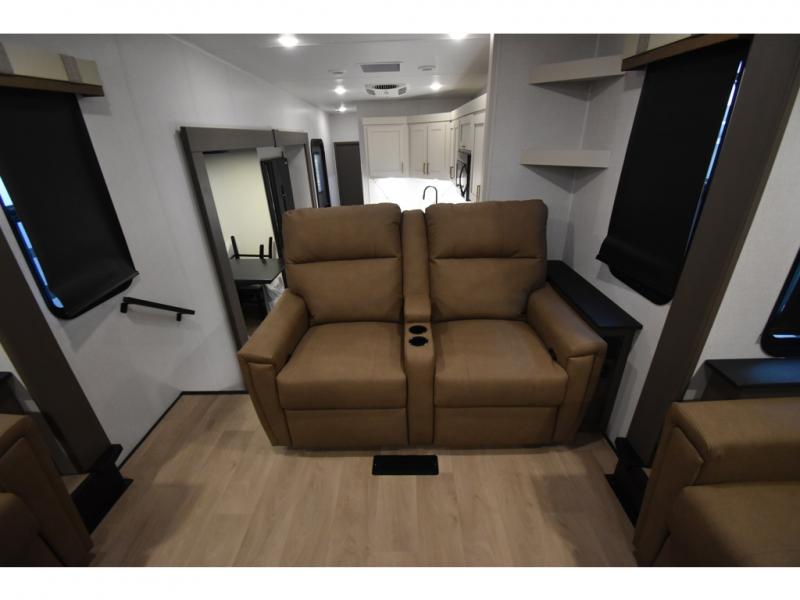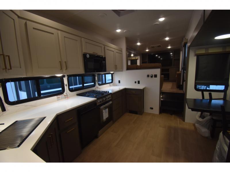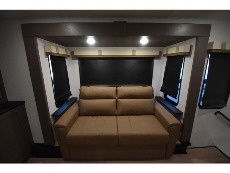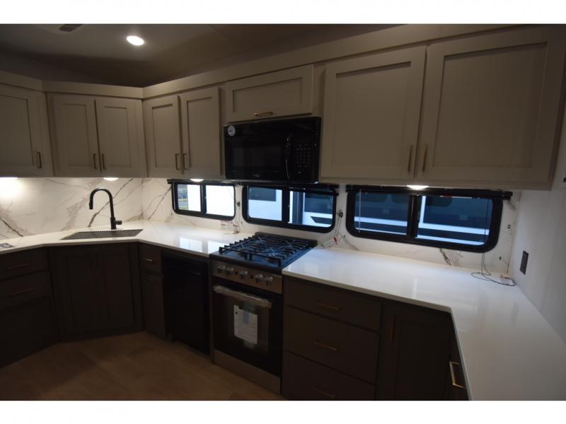 You'll always have a good time in this quad slide out fifth wheel! The front living area will be a favorite hang-out spot with its dual opposing queen bed hide-a-bed sofa slides, along with theater seating across from a 65" TV and fireplace. Your guests can transform this space into their bedroom at night, while you take the rear private bedroom with a king bed slide out, a dresser, and full-width wardrobe. A full bath will let you clean up every day, and the middle kitchen features ample counter space to prep meals. There is also a free-standing dinette where you can dine together, or you can take your plate outdoors to sit under the two power awnings!