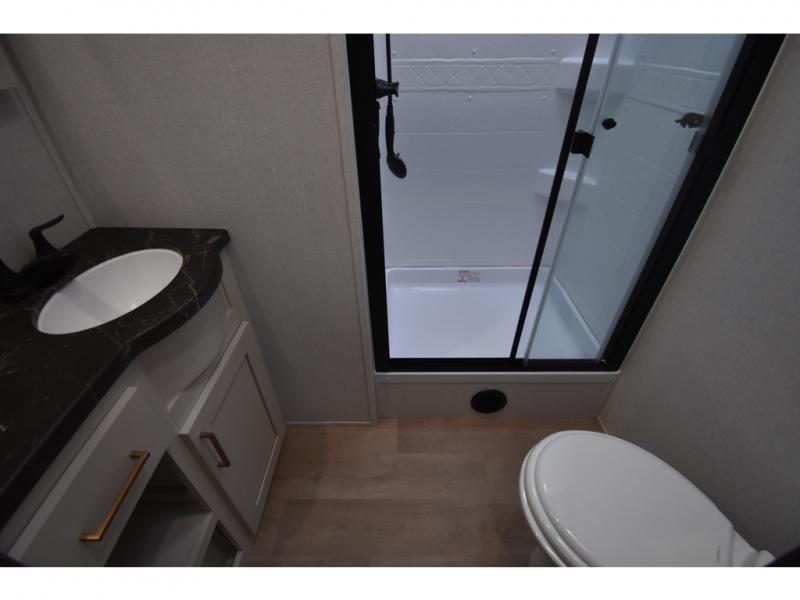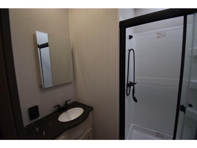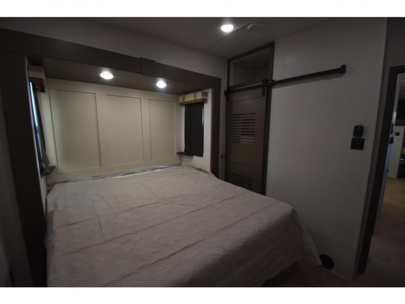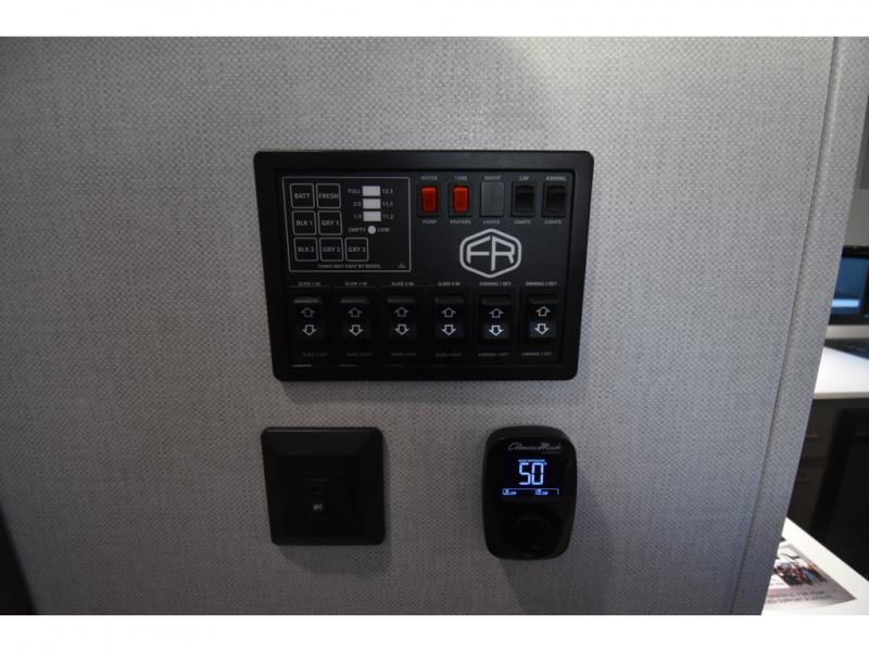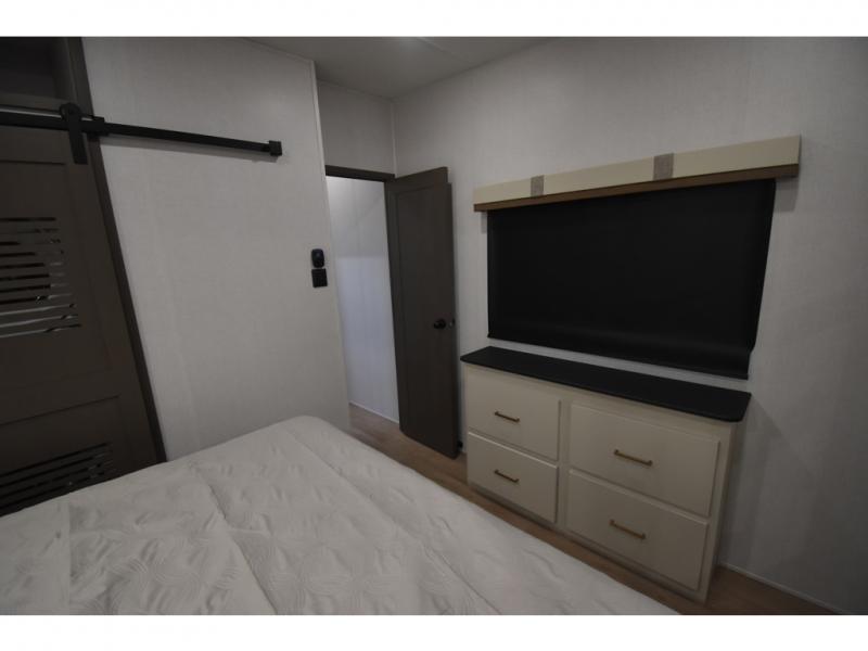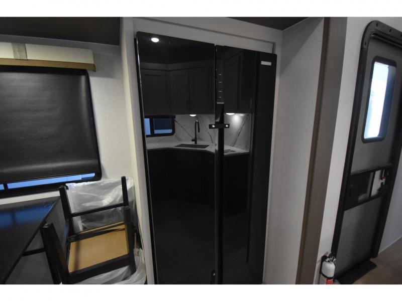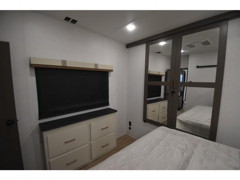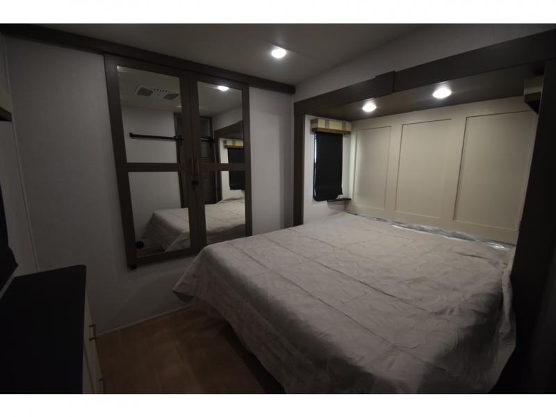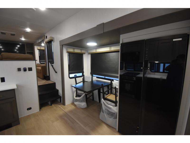 You'll always have a good time in this quad slide out fifth wheel! The front living area will be a favorite hang-out spot with its dual opposing queen bed hide-a-bed sofa slides, along with theater seating across from a 65" TV and fireplace. Your guests can transform this space into their bedroom at night, while you take the rear private bedroom with a king bed slide out, a dresser, and full-width wardrobe. A full bath will let you clean up every day, and the middle kitchen features ample counter space to prep meals. There is also a free-standing dinette where you can dine together, or you can take your plate outdoors to sit under the two power awnings!