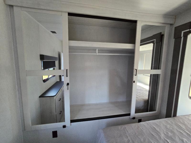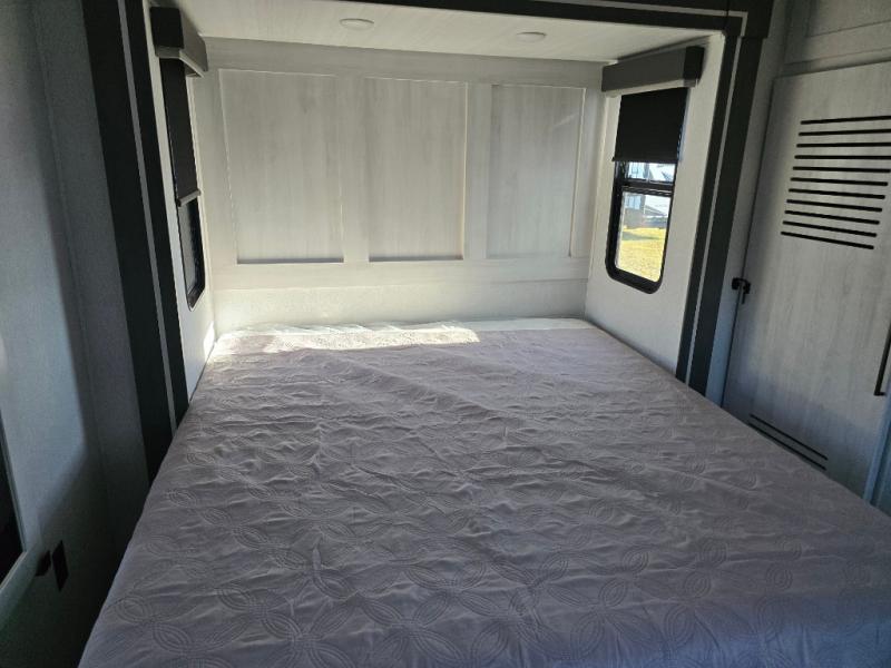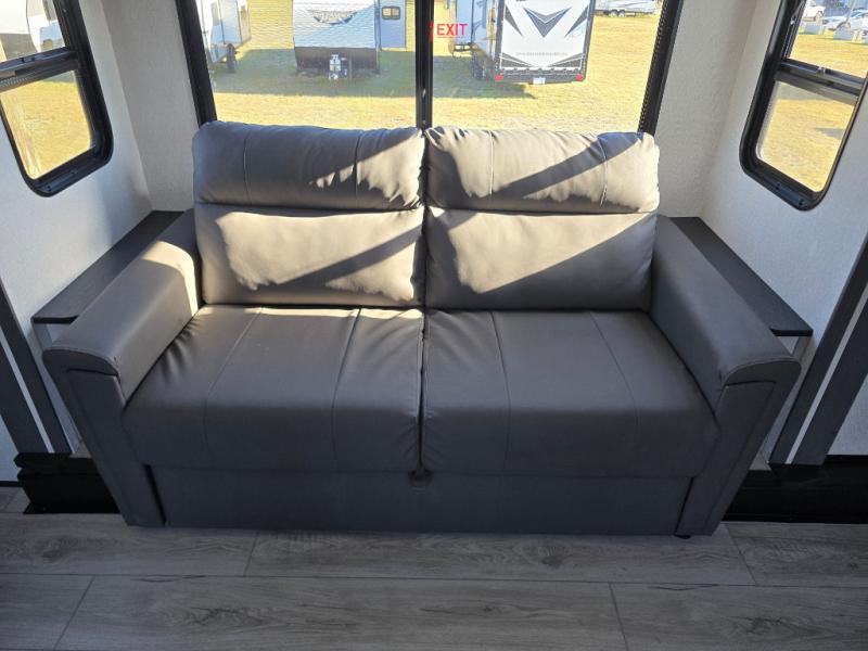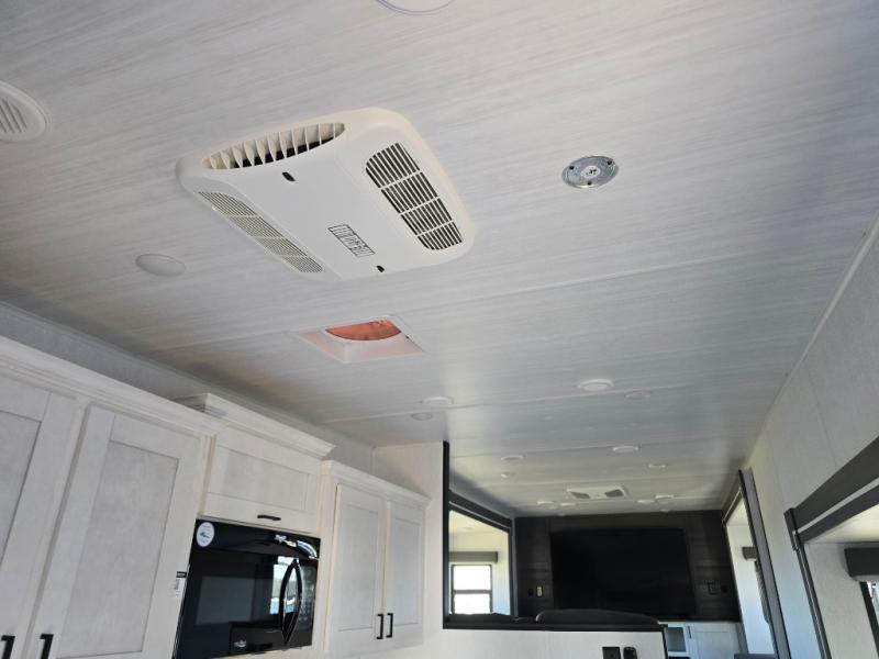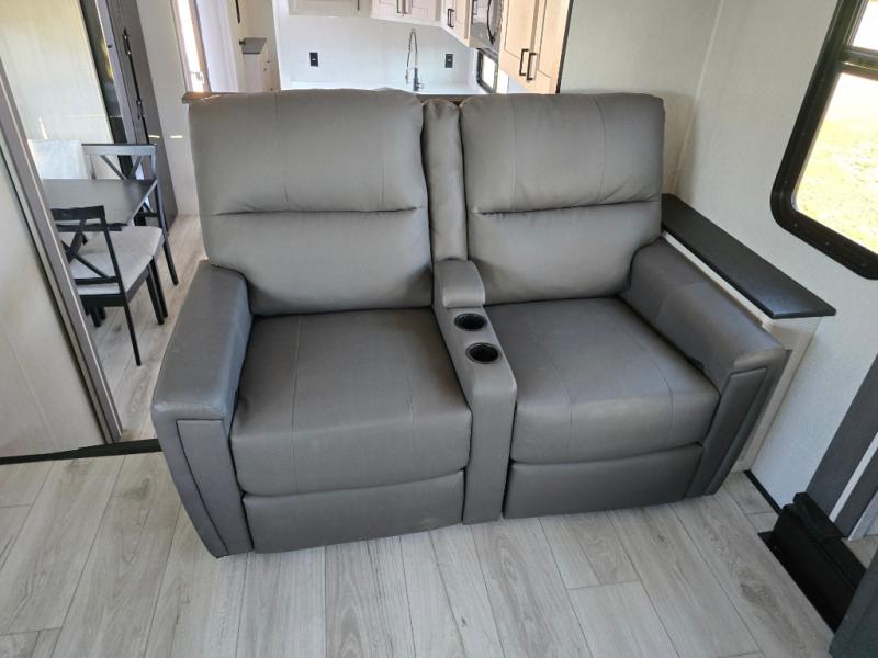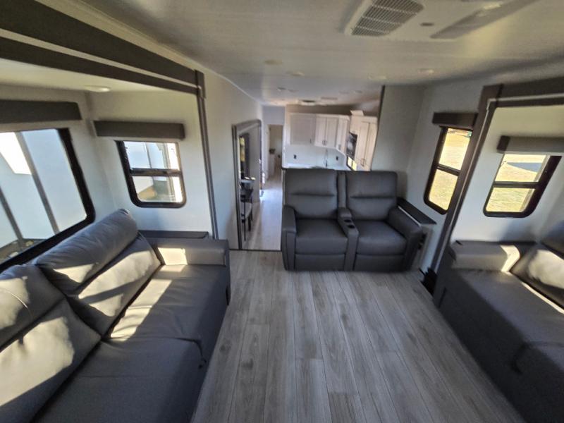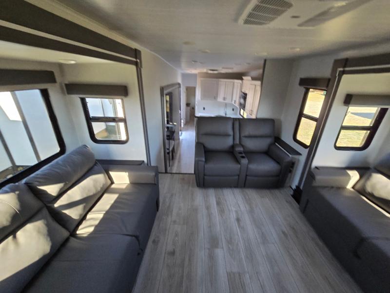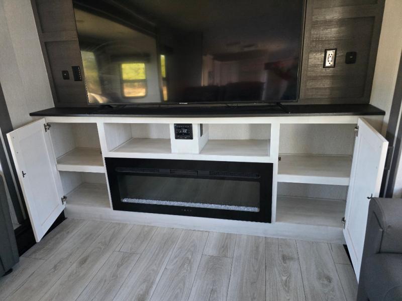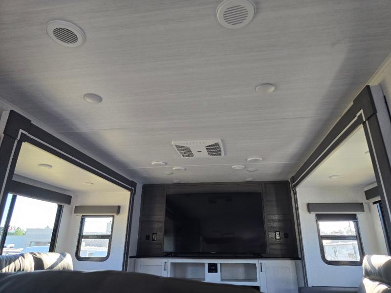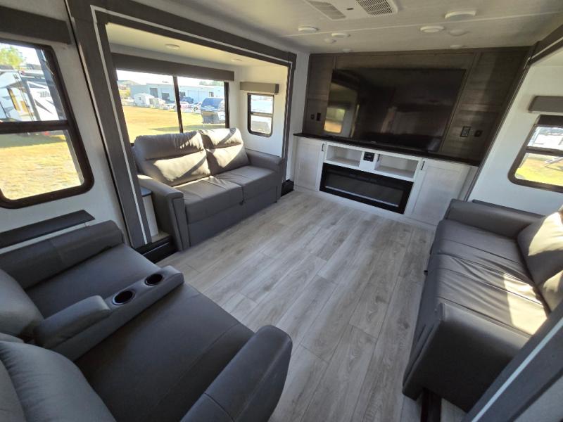 You'll always have a good time in this quad slide out fifth wheel! The front living area will be a favorite hang-out spot with its dual opposing queen bed hide-a-bed sofa slides, along with theater seating across from a 65" TV and fireplace. Your guests can transform this space into their bedroom at night, while you take the rear private bedroom with a king bed slide out, a dresser, and full-width wardrobe. A full bath will let you clean up every day, and the middle kitchen features ample counter space to prep meals. There is also a free-standing dinette where you can dine together, or you can take your plate outdoors to sit under the two power awnings!