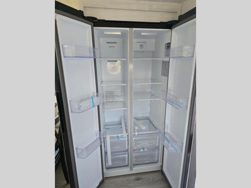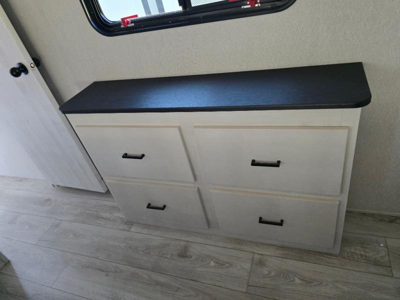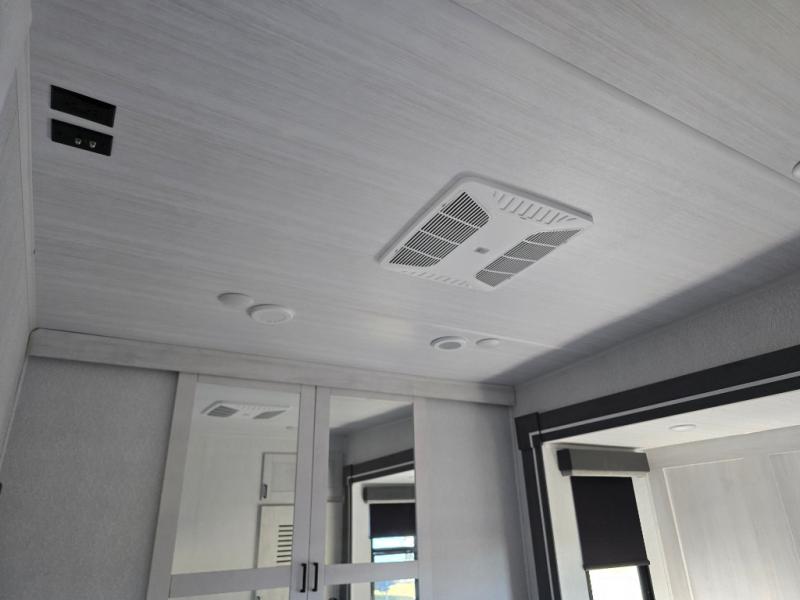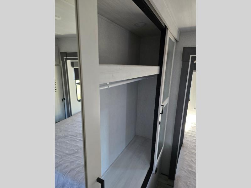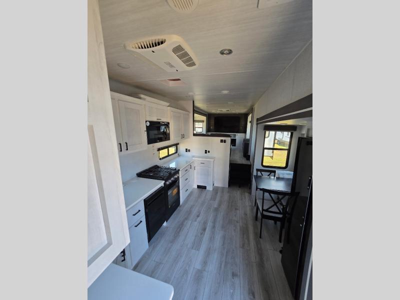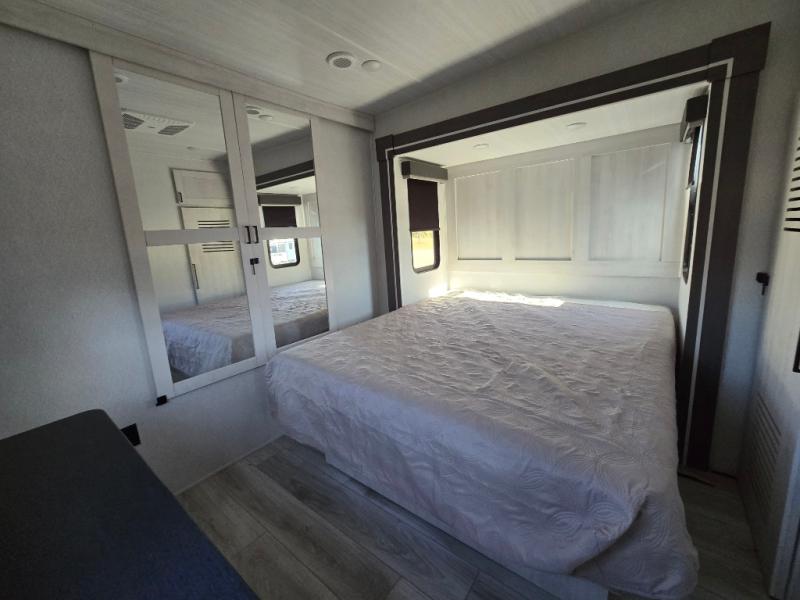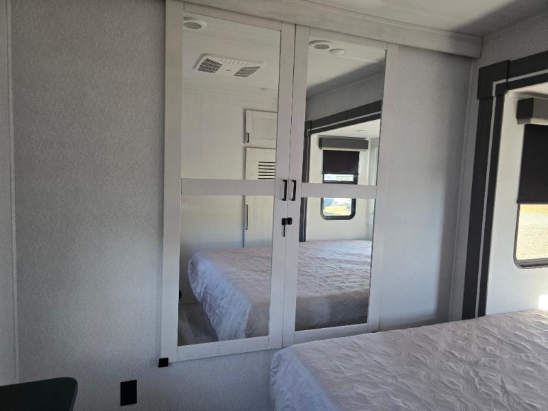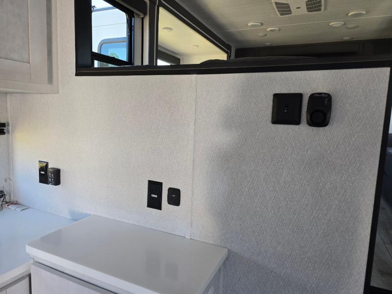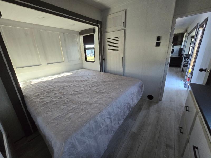 You'll always have a good time in this quad slide out fifth wheel! The front living area will be a favorite hang-out spot with its dual opposing queen bed hide-a-bed sofa slides, along with theater seating across from a 65" TV and fireplace. Your guests can transform this space into their bedroom at night, while you take the rear private bedroom with a king bed slide out, a dresser, and full-width wardrobe. A full bath will let you clean up every day, and the middle kitchen features ample counter space to prep meals. There is also a free-standing dinette where you can dine together, or you can take your plate outdoors to sit under the two power awnings!
