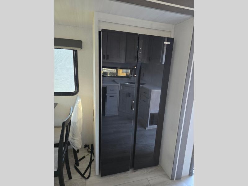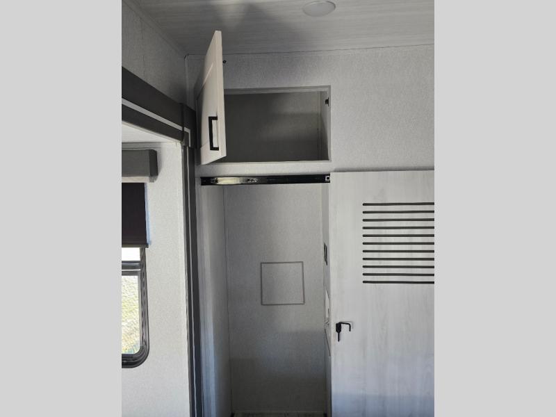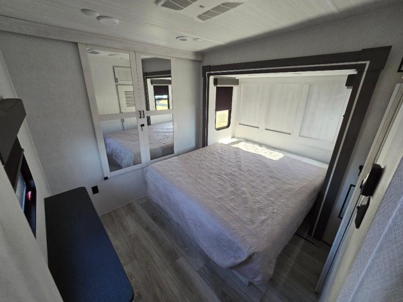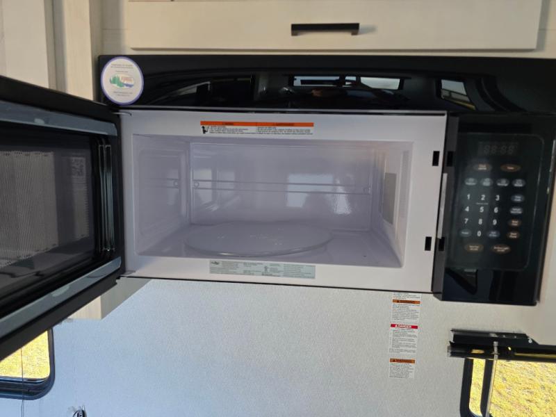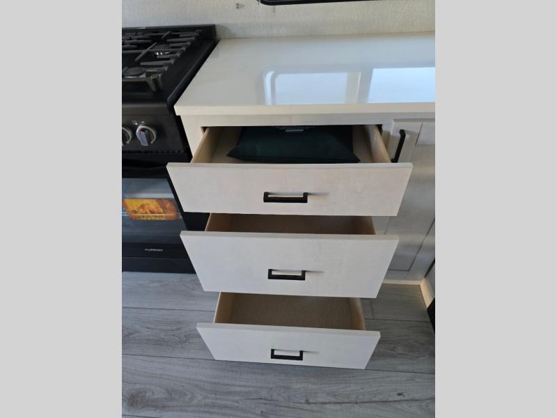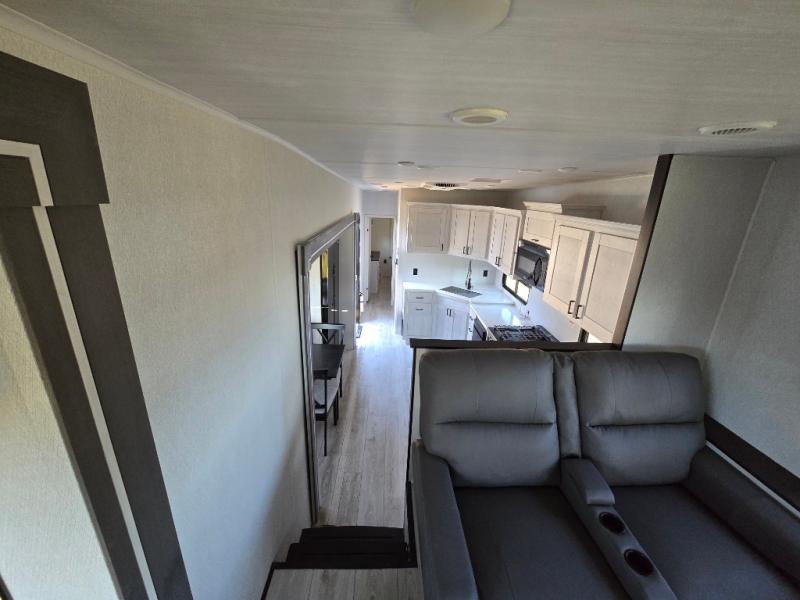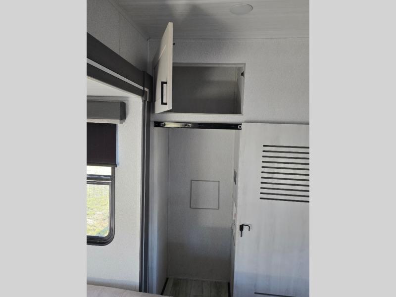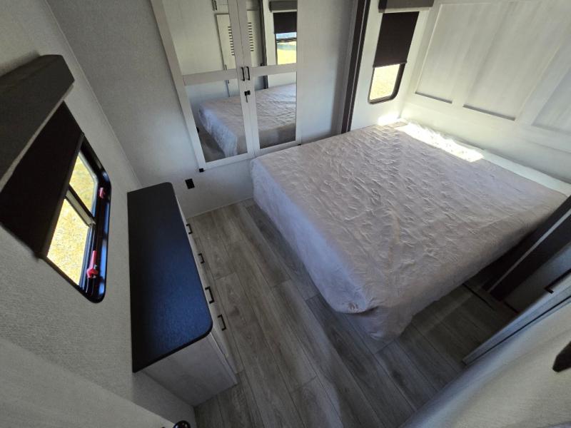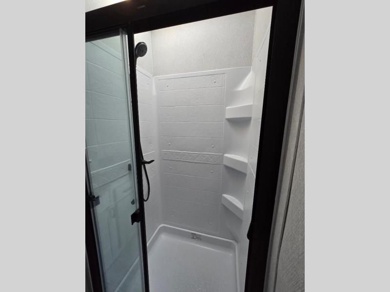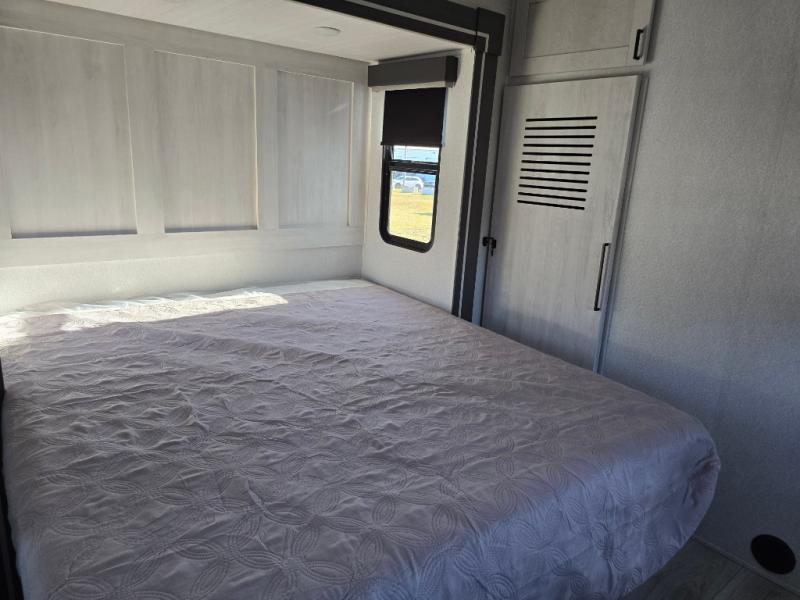 You'll always have a good time in this quad slide out fifth wheel! The front living area will be a favorite hang-out spot with its dual opposing queen bed hide-a-bed sofa slides, along with theater seating across from a 65" TV and fireplace. Your guests can transform this space into their bedroom at night, while you take the rear private bedroom with a king bed slide out, a dresser, and full-width wardrobe. A full bath will let you clean up every day, and the middle kitchen features ample counter space to prep meals. There is also a free-standing dinette where you can dine together, or you can take your plate outdoors to sit under the two power awnings!