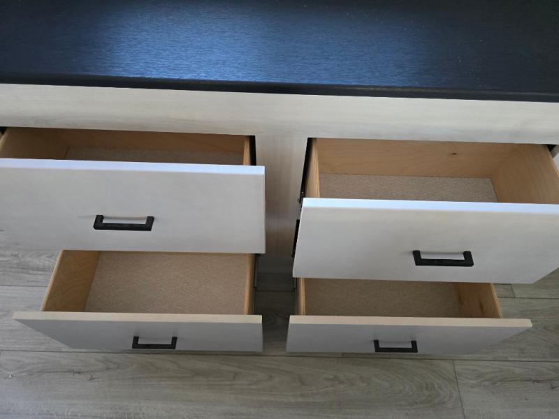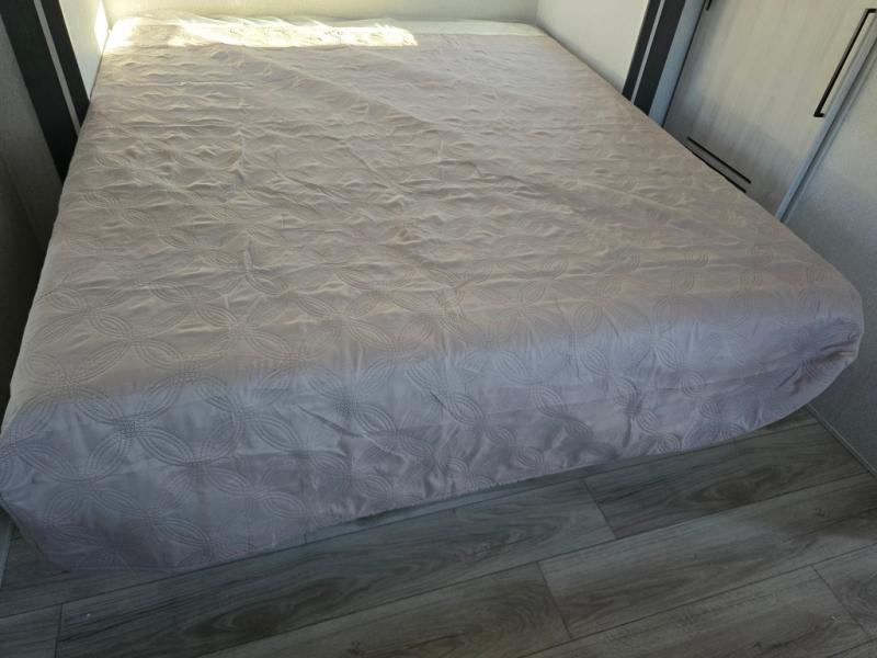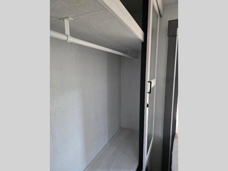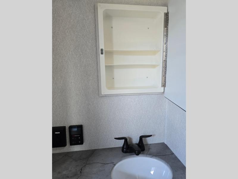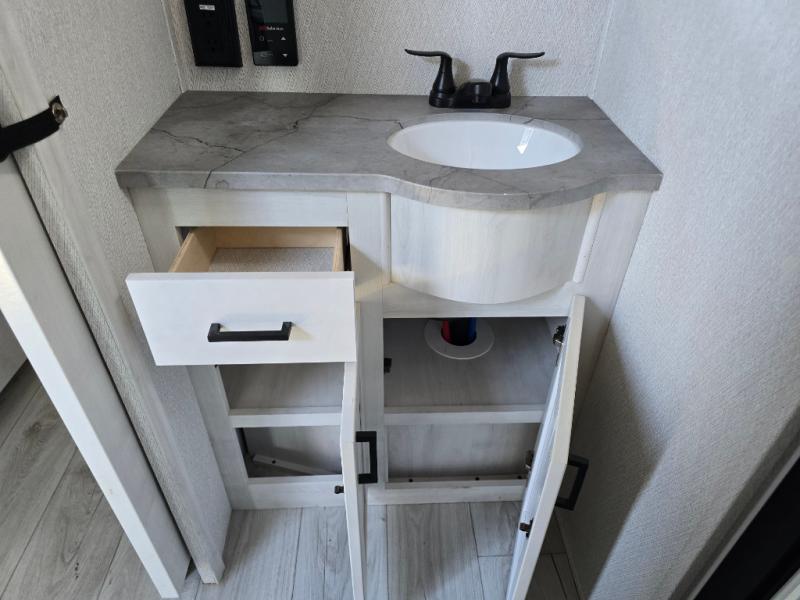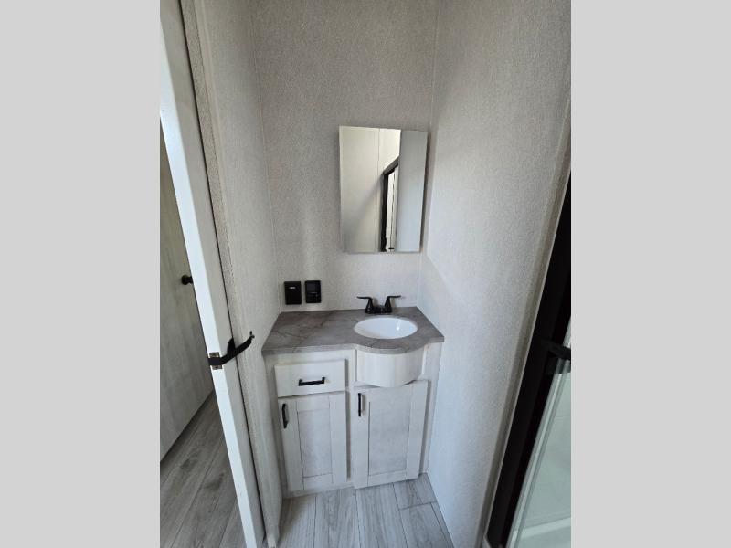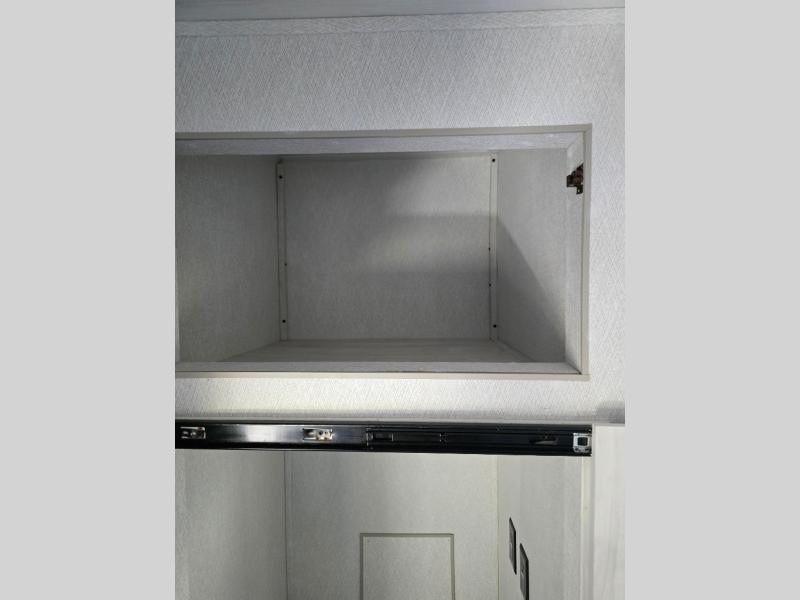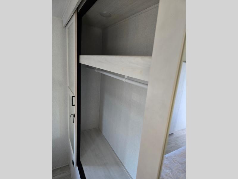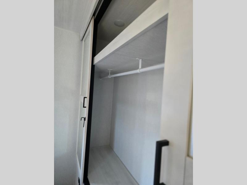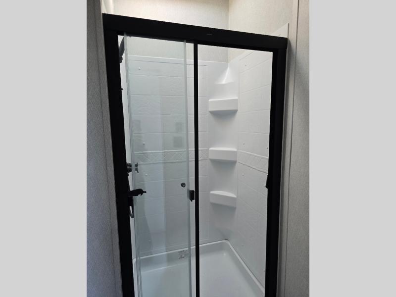 You'll always have a good time in this quad slide out fifth wheel! The front living area will be a favorite hang-out spot with its dual opposing queen bed hide-a-bed sofa slides, along with theater seating across from a 65" TV and fireplace. Your guests can transform this space into their bedroom at night, while you take the rear private bedroom with a king bed slide out, a dresser, and full-width wardrobe. A full bath will let you clean up every day, and the middle kitchen features ample counter space to prep meals. There is also a free-standing dinette where you can dine together, or you can take your plate outdoors to sit under the two power awnings!